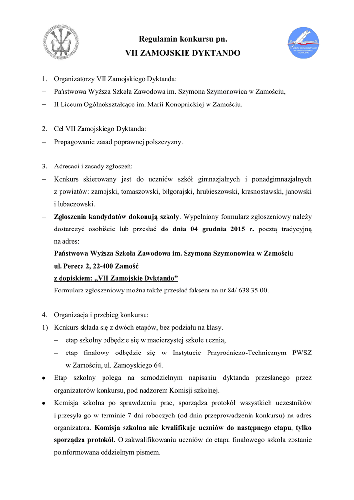 Regulamin konkursu pn. VII ZAMOJSKIE DYKTANDO 1. Organizatorzy VII Zamojskiego Dyktanda: Państwowa Wyższa Szkoła Zawodowa im. Szymona Szymonowica w Zamościu, II Liceum Ogólnokształcące im. Marii Konopnickiej w Zamościu. 2. Cel VII Zamojskiego Dyktanda: Propagowanie zasad poprawnej polszczyzny. 3. Adresaci i zasady zgłoszeń: Konkurs skierowany jest do uczniów szkół gimnazjalnych i ponadgimnazjalnych z powiatów: zamojski, tomaszowski, biłgorajski, hrubieszowski, krasnostawski, janowski i lubaczowski. Zgłoszenia kandydatów dokonują szkoły. Wypełniony formularz zgłoszeniowy należy dostarczyć osobiście lub przesłać do dnia 04 grudnia 2015 r. pocztą tradycyjną na adres: Państwowa Wyższa Szkoła Zawodowa im. Szymona Szymonowica w Zamościu ul. Pereca 2, 22-400 Zamość z dopiskiem: „VII Zamojskie Dyktando” Formularz zgłoszeniowy można także przesłać faksem na nr 84/ 638 35 00. 4. Organizacja i przebieg konkursu: 1) Konkurs składa się z dwóch etapów, bez podziału na klasy. etap szkolny odbędzie się w macierzystej szkole ucznia, etap finałowy odbędzie się w Instytucie Przyrodniczo-Technicznym PWSZ w Zamościu, ul. Zamoyskiego 64. Etap szkolny polega na samodzielnym napisaniu dyktanda przesłanego przez organizatorów konkursu, pod nadzorem Komisji szkolnej. Komisja szkolna po sprawdzeniu prac, sporządza protokół wszystkich uczestników i przesyła go w terminie 7 dni roboczych (od dnia przeprowadzenia konkursu) na adres organizatora. Komisja szkolna nie kwalifikuje uczniów do następnego etapu, tylko sporządza protokół. O zakwalifikowaniu uczniów do etapu finałowego szkoła zostanie poinformowana oddzielnym pismem. Czas przewidziany na napisanie dyktanda to 60 minut. Do etapu finałowego zostaną zakwalifikowani uczniowie z najwyższą liczbą punktów spośród wszystkich uczestników. 2) Etap finałowy polega na napisaniu dyktanda, pod nadzorem Komisji konkursowej powołanej przez organizatorów. 3) Terminy etapów: etap szkolny: styczeń/luty 2016 r. etap finałowy: marzec/kwiecień 2016 r. (dokładne terminy zostaną podane w późniejszym czasie). 5. Komisja konkursowa dyktanda: Nad przebiegiem dyktanda czuwać będzie komisja konkursowa powołana przez organizatorów. Komisja konkursowa będzie czuwać nad prawidłowym przebiegiem dyktanda, ogłoszeniem listy nagrodzonych, interpretacją postanowień niniejszego regulaminu oraz rozstrzyganiem związanych z dyktandem sporów. W przypadku naruszenia postanowień niniejszego regulaminu, Komisja konkursowa podejmie decyzję o wykluczeniu z dyktanda uczestnika, który dokonał tych naruszeń. 6. Przebieg Dyktanda: VII Zamojskie Dyktando polega na napisaniu zaproponowanego przez organizatorów dyktanda. Dyktando oceniają nauczyciele języka polskiego. Podczas pisania dyktanda nie wolno: korzystać z żadnych pomocy naukowych porozumiewać się z innymi uczestnikami korzystać z wszelkich urządzeń elektronicznych, tj. telefony komórkowe, słowniki, laptopy itp. pisać dyktowanego tekstu drukowanymi literami. Wręczenie nagród odbędzie się podczas Finału Konkursu. 7. Zasady oceny: Ocenie podlegają błędy ortograficzne oraz interpunkcyjne. Nieczytelny, niejednoznaczny zapis rozstrzygany na niekorzyść piszącego. wyrazu i znaku interpunkcyjnego będzie Ewentualne poprawki i skreślenia muszą być wyraźnie zaznaczone. Również w poprawkach nie jest dopuszczalne stosowanie drukowanych liter. Jeżeli kilka prac zdobędzie tę samą liczbę punktów w II etapie, przy wyłonieniu zwycięzcy pod uwagę wzięte zostaną wyniki I etapu konkursu. Jeśli nie wyłoni to zwycięzcy, wówczas organizator zastrzega sobie prawo do przeprowadzenia dogrywki, w celu wyłonienia jednej osoby. O formie dogrywki zadecyduje Komisja konkursowa. Decyzje Komisji konkursowej są ostateczne i nie przysługuje od nich odwołanie ani żadna reklamacja. 8. Nagrody: Nagrody rzeczowe otrzyma trzech najlepszych uczestników konkursu. Siedmiu laureatów otrzyma wyróżnienia. Wszyscy uczestnicy finału otrzymają dyplomy potwierdzające uczestnictwo w VII Zamojskim Dyktandzie. Jeżeli w dniu finału zwycięzca lub laureat nie odbierze nagrody, będą one do odebrania w siedzibie PWSZ w Zamościu, ul. Pereca 2 przez okres miesiąca od dnia finału. 9. Uwagi końcowe: Tekst dyktanda zostanie opracowany przez organizatorów na podstawie obowiązujących zasad pisowni i interpunkcji zawartych w słownikach ortograficznych PWN. Uczestnikowi nie przysługuje wymiana ewentualnych nagród rzeczowych na ekwiwalent pieniężny. Organizator zastrzega sobie prawo do opublikowania listy zwycięzców z podaniem imienia i nazwiska tych osób, na co uczestnicy wyrażają zgodę. Zgłoszenie udziału w konkursie oraz wzięcie w nim udziału oznacza zgodę na warunki niniejszego regulaminu. Niniejszy regulamin oraz wyniki dyktanda zostaną zamieszczone na stronach internetowych organizatorów. Ponadto organizator zastrzega sobie prawo podania wyników VII Zamojskiego Dyktanda do publicznej wiadomości za pośrednictwem mediów. Wszelkie sprawy, które nie zostały objęte powyższym regulaminie, rozstrzyga przewodniczący komisji.