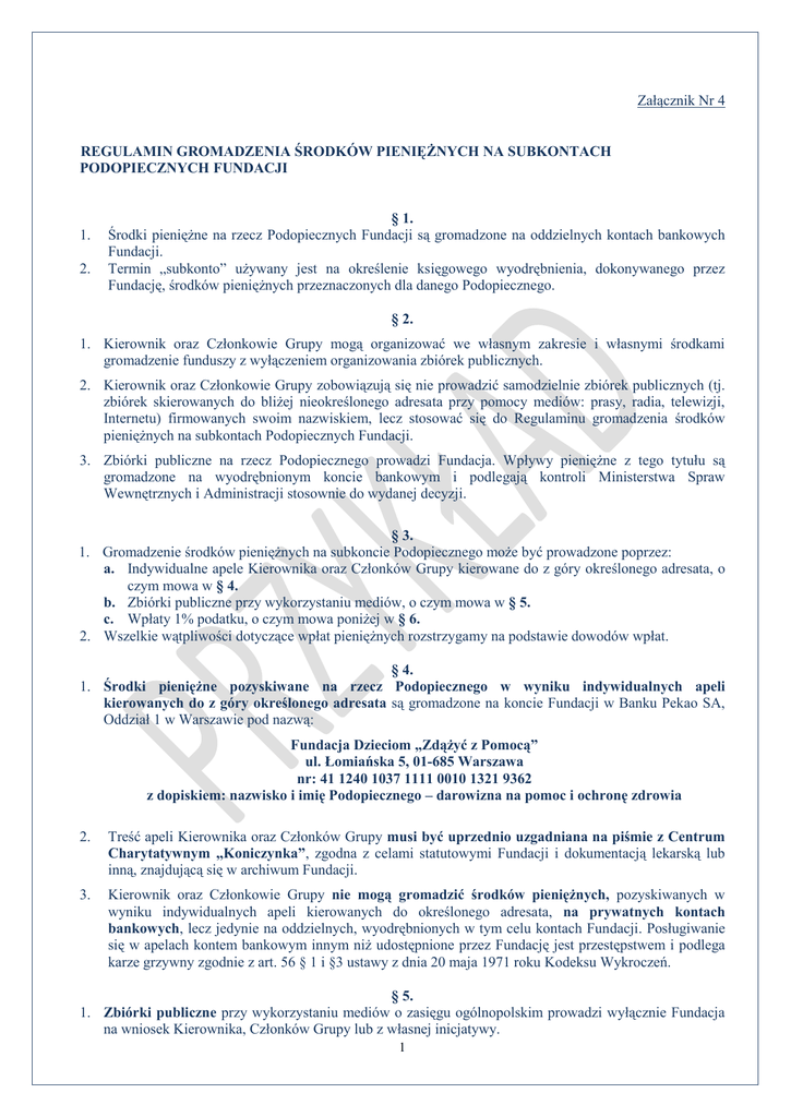 Załącznik Nr 4 REGULAMIN GROMADZENIA ŚRODKÓW PIENIĘŻNYCH NA SUBKONTACH PODOPIECZNYCH FUNDACJI 1. 2. § 1. Środki pieniężne na rzecz Podopiecznych Fundacji są gromadzone na oddzielnych kontach bankowych Fundacji. Termin „subkonto” używany jest na określenie księgowego wyodrębnienia, dokonywanego przez Fundację, środków pieniężnych przeznaczonych dla danego Podopiecznego. § 2. 1. Kierownik oraz Członkowie Grupy mogą organizować we własnym zakresie i własnymi środkami gromadzenie funduszy z wyłączeniem organizowania zbiórek publicznych. 2. Kierownik oraz Członkowie Grupy zobowiązują się nie prowadzić samodzielnie zbiórek publicznych (tj. zbiórek skierowanych do bliżej nieokreślonego adresata przy pomocy mediów: prasy, radia, telewizji, Internetu) firmowanych swoim nazwiskiem, lecz stosować się do Regulaminu gromadzenia środków pieniężnych na subkontach Podopiecznych Fundacji. 3. Zbiórki publiczne na rzecz Podopiecznego prowadzi Fundacja. Wpływy pieniężne z tego tytułu są gromadzone na wyodrębnionym koncie bankowym i podlegają kontroli Ministerstwa Spraw Wewnętrznych i Administracji stosownie do wydanej decyzji. § 3. 1. Gromadzenie środków pieniężnych na subkoncie Podopiecznego może być prowadzone poprzez: a. Indywidualne apele Kierownika oraz Członków Grupy kierowane do z góry określonego adresata, o czym mowa w § 4. b. Zbiórki publiczne przy wykorzystaniu mediów, o czym mowa w § 5. c. Wpłaty 1% podatku, o czym mowa poniżej w § 6. 2. Wszelkie wątpliwości dotyczące wpłat pieniężnych rozstrzygamy na podstawie dowodów wpłat. § 4. 1. Środki pieniężne pozyskiwane na rzecz Podopiecznego w wyniku indywidualnych apeli kierowanych do z góry określonego adresata są gromadzone na koncie Fundacji w Banku Pekao SA, Oddział 1 w Warszawie pod nazwą: Fundacja Dzieciom „Zdążyć z Pomocą” ul. Łomiańska 5, 01-685 Warszawa nr: 41 1240 1037 1111 0010 1321 9362 z dopiskiem: nazwisko i imię Podopiecznego – darowizna na pomoc i ochronę zdrowia 2. Treść apeli Kierownika oraz Członków Grupy musi być uprzednio uzgadniana na piśmie z Centrum Charytatywnym „Koniczynka”, zgodna z celami statutowymi Fundacji i dokumentacją lekarską lub inną, znajdującą się w archiwum Fundacji. 3. Kierownik oraz Członkowie Grupy nie mogą gromadzić środków pieniężnych, pozyskiwanych w wyniku indywidualnych apeli kierowanych do określonego adresata, na prywatnych kontach bankowych, lecz jedynie na oddzielnych, wyodrębnionych w tym celu kontach Fundacji. Posługiwanie się w apelach kontem bankowym innym niż udostępnione przez Fundację jest przestępstwem i podlega karze grzywny zgodnie z art. 56 § 1 i §3 ustawy z dnia 20 maja 1971 roku Kodeksu Wykroczeń. § 5. 1. Zbiórki publiczne przy wykorzystaniu mediów o zasięgu ogólnopolskim prowadzi wyłącznie Fundacja na wniosek Kierownika, Członków Grupy lub z własnej inicjatywy. 1 2. Środki pieniężne pochodzące ze zbiórek publicznych są gromadzone na koncie Fundacji w Banku Pekao SA, 1 Oddział w Warszawie, pod nazwą: Fundacja Dzieciom „Zdążyć z Pomocą” ul. Łomiańska 5, 01-685 Warszawa nr: 75 1240 1037 1111 0010 0957 3199 z dopiskiem: nazwisko i imię Podopiecznego – zbiórka publiczna 3. Zbiórki publiczne na rzecz Podopiecznego mogą być prowadzone wyłącznie w okresie, na jaki Fundacja posiada zgodę wydaną przez Ministerstwo Spraw Wewnętrznych i Administracji. 4. Fundacja może prowadzić ogólnopolskie zbiórki publiczne wyłącznie na cele wyszczególnione w treści pisma MSWiA, przywołanego wyżej w § 5. ust. 3, o ile cele te są zgodne z aktualnymi potrzebami Podopiecznego. 5. Zbiórki publiczne mogą być prowadzone tylko w walucie polskiej, a środki pieniężne wpłacane w walucie obcej są zamieniane w Banku Pekao SA na walutę polską. 6. Środki pieniężne zgromadzone w wyniku zbiórek publicznych na odrębnym koncie, wskazanym w § 4 ust. 1, na rzecz Podopiecznego są przeksięgowywane na jego subkonto prowadzone przez Fundację. 7. Środki pieniężne zgromadzone w wyniku zbiórek publicznych mogą być wydatkowane jedynie na terytorium Rzeczypospolitej Polskiej. § 6. Fundacja posiada status organizacji pożytku publicznego. Wpłaty 1% podatku Fundacja przyjmuje wg zasad ustawy z dnia 24 kwietnia 2003 r. o działalności pożytku publicznego i o wolontariacie (Dz. U. nr 96, poz. 873 z późn. zm.). § 7. W wypadku rozwiązania Porozumienia z Podopiecznym zgromadzone na jego subkoncie środki pieniężne zostają rozdysponowane na cele statutowe Fundacji, przy czym środki zebrane w wyniku zbiórki publicznej zostają wydatkowane zgodnie z decyzją MSWiA dotyczącą zbiórki publicznej. Stanisław Kowalski Luiza Sadkowska …………………………………………………………. Podpis Kierownika prezes Zarządu Fundator wiceprezes Zarządu Fundacji 2