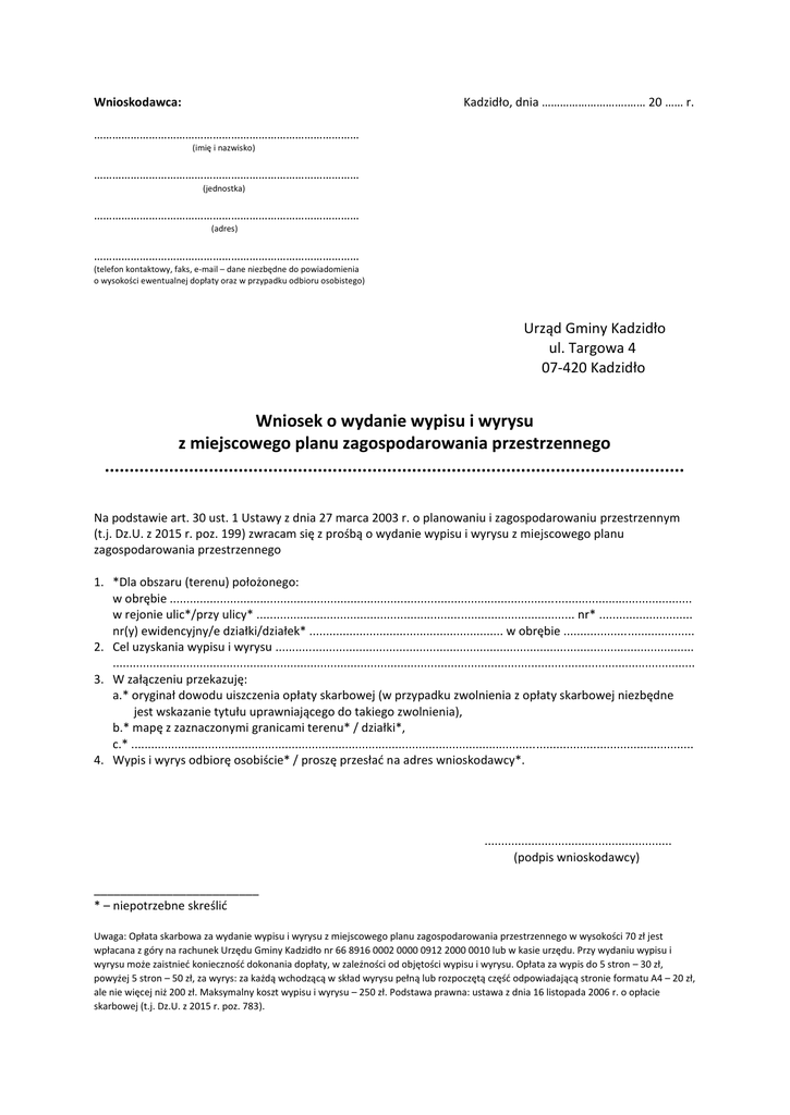 Wnioskodawca: Kadzidło, dnia ……………………….…… 20 …… r. …………………………………………………………………………… (imię i nazwisko) …………………………………………………………………………… (jednostka) …………………………………………………………………………… (adres) …………………………………………………………………………… (telefon kontaktowy, faks, e-mail – dane niezbędne do powiadomienia o wysokości ewentualnej dopłaty oraz w przypadku odbioru osobistego) Urząd Gminy Kadzidło ul. Targowa 4 07-420 Kadzidło Wniosek o wydanie wypisu i wyrysu z miejscowego planu zagospodarowania przestrzennego ..................................................................................................................... Na podstawie art. 30 ust. 1 Ustawy z dnia 27 marca 2003 r. o planowaniu i zagospodarowaniu przestrzennym (t.j. Dz.U. z 2015 r. poz. 199) zwracam się z prośbą o wydanie wypisu i wyrysu z miejscowego planu zagospodarowania przestrzennego 1. *Dla obszaru (terenu) położonego: w obrębie ............................................................................................................................................................ w rejonie ulic*/przy ulicy* ............................................................................................... nr* ............................ nr(y) ewidencyjny/e działki/działek* .......................................................... w obrębie ....................................... 2. Cel uzyskania wypisu i wyrysu ............................................................................................................................. .............................................................................................................................................................................. 3. W załączeniu przekazuję: a.* oryginał dowodu uiszczenia opłaty skarbowej (w przypadku zwolnienia z opłaty skarbowej niezbędne jest wskazanie tytułu uprawniającego do takiego zwolnienia), b.* mapę z zaznaczonymi granicami terenu* / działki*, c.* ........................................................................................................................................................................ 4. Wypis i wyrys odbiorę osobiście* / proszę przesłać na adres wnioskodawcy*. ........................................................ (podpis wnioskodawcy) _________________________ * – niepotrzebne skreślić Uwaga: Opłata skarbowa za wydanie wypisu i wyrysu z miejscowego planu zagospodarowania przestrzennego w wysokości 70 zł jest wpłacana z góry na rachunek Urzędu Gminy Kadzidło nr 66 8916 0002 0000 0912 2000 0010 lub w kasie urzędu. Przy wydaniu wypisu i wyrysu może zaistnieć konieczność dokonania dopłaty, w zależności od objętości wypisu i wyrysu. Opłata za wypis do 5 stron – 30 zł, powyżej 5 stron – 50 zł, za wyrys: za każdą wchodzącą w skład wyrysu pełną lub rozpoczętą część odpowiadającą stronie formatu A4 – 20 zł, ale nie więcej niż 200 zł. Maksymalny koszt wypisu i wyrysu – 250 zł. Podstawa prawna: ustawa z dnia 16 listopada 2006 r. o opłacie skarbowej (t.j. Dz.U. z 2015 r. poz. 783).