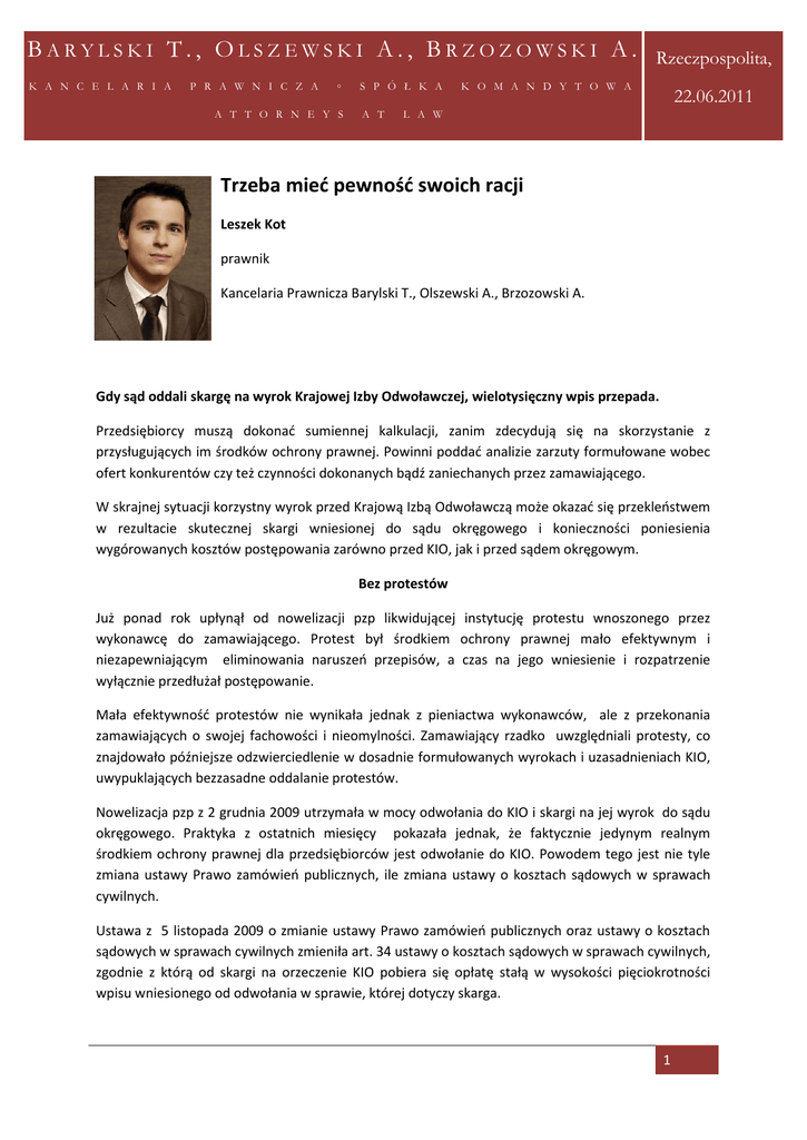 BARYLSKI T., OLSZEWSKI A., BRZOZOWSKI A. K A N C E L A R I A P R A W N I C Z A ◦ A T T O R N E Y S S P Ó Ł K A A T Rzeczpospolita, K O M A N D Y T O W A 22.06.2011 L A W Trzeba mieć pewność swoich racji Leszek Kot prawnik Kancelaria Prawnicza Barylski T., Olszewski A., Brzozowski A. Gdy sąd oddali skargę na wyrok Krajowej Izby Odwoławczej, wielotysięczny wpis przepada. Przedsiębiorcy muszą dokonać sumiennej kalkulacji, zanim zdecydują się na skorzystanie z przysługujących im środków ochrony prawnej. Powinni poddać analizie zarzuty formułowane wobec ofert konkurentów czy też czynności dokonanych bądź zaniechanych przez zamawiającego. W skrajnej sytuacji korzystny wyrok przed Krajową Izbą Odwoławczą może okazać się przekleństwem w rezultacie skutecznej skargi wniesionej do sądu okręgowego i konieczności poniesienia wygórowanych kosztów postępowania zarówno przed KIO, jak i przed sądem okręgowym. Bez protestów Już ponad rok upłynął od nowelizacji pzp likwidującej instytucję protestu wnoszonego przez wykonawcę do zamawiającego. Protest był środkiem ochrony prawnej mało efektywnym i niezapewniającym eliminowania naruszeń przepisów, a czas na jego wniesienie i rozpatrzenie wyłącznie przedłużał postępowanie. Mała efektywność protestów nie wynikała jednak z pieniactwa wykonawców, ale z przekonania zamawiających o swojej fachowości i nieomylności. Zamawiający rzadko uwzględniali protesty, co znajdowało późniejsze odzwierciedlenie w dosadnie formułowanych wyrokach i uzasadnieniach KIO, uwypuklających bezzasadne oddalanie protestów. Nowelizacja pzp z 2 grudnia 2009 utrzymała w mocy odwołania do KIO i skargi na jej wyrok do sądu okręgowego. Praktyka z ostatnich miesięcy pokazała jednak, że faktycznie jedynym realnym środkiem ochrony prawnej dla przedsiębiorców jest odwołanie do KIO. Powodem tego jest nie tyle zmiana ustawy Prawo zamówień publicznych, ile zmiana ustawy o kosztach sądowych w sprawach cywilnych. Ustawa z 5 listopada 2009 o zmianie ustawy Prawo zamówień publicznych oraz ustawy o kosztach sądowych w sprawach cywilnych zmieniła art. 34 ustawy o kosztach sądowych w sprawach cywilnych, zgodnie z którą od skargi na orzeczenie KIO pobiera się opłatę stałą w wysokości pięciokrotności wpisu wniesionego od odwołania w sprawie, której dotyczy skarga. 1 BARYLSKI T., OLSZEWSKI A., BRZOZOWSKI A. K A N C E L A R I A P R A W N I C Z A ◦ A T T O R N E Y S S P Ó Ł K A A T Rzeczpospolita, K O M A N D Y T O W A 22.06.2011 L A W Z kolei jeśli skarga dotyczy czynności w postępowaniu o udzielenie zamówienia publicznego podjętych po otwarciu ofert, pobiera się opłatę stosunkową w wysokości 5 proc. wartości przedmiotu zamówienia w postępowaniu, którego skarga dotyczy, jednak nie więcej niż 5 mln zł. Mając na uwadze, że wysokość wpisu od odwołania do KIO wynosi w zależności od wartości i przedmiotu zamówienia co najmniej 7,5 tys. zł (dla dostaw i usług przy zamówieniu o wartości niższej od tzw. progów unijnych) i najwięcej 20 tys. zł (dla robót budowlanych przy zamówieniu o wartości równej lub wyższej od tzw. progów unijnych), wysokość ewentualnego wpisu od skargi na orzeczenie KIO wynosi odpowiednio najmniej 37,5 tys. zł i najwięcej 100 tys. zł. Gdy skarga dotyczy czynności w postępowaniu o udzielenie zamówienia publicznego podjętych po otwarciu ofert, opłata stosunkowa w wysokości 5 proc. wartości przedmiotu zamówienia to minimum kilkadziesiąt tysięcy złotych, a w przypadku zamówień na roboty budowlane powyżej tzw. progów unijnych – od kilkuset tysięcy do 5 mln zł. Takie skonstruowanie wysokości wpisu od skargi, w szczególności określenie wartości zamówienia jako podstawy wyliczenia opłaty stosunkowej od skargi wniesionej od czynności podjętych po otwarciu ofert, czyni ten środek ochrony prawnej iluzorycznym. Przedsiębiorcy zostali w ten sposób skutecznie odstraszeni od choćby próby składania skargi na wyrok KIO. W razie bowiem oddalenia przez sąd skargi na wyrok KIO kilkusettysięczny czy nawet milionowy wpis przepada. Wpis taki przepada tylko dlatego, że wykonawca starał się uzyskać dane zamówienie i postanowił skorzystać ze środków ochrony prawnej mu przysługujących. Ryzykuje wykonawca Biorąc pod uwagę wysokość wpisu od skargi na orzeczenie KIO i ryzyko jego utraty, nie sposób sobie wyobrazić, aby wykonawca składał skargę z czystego pieniactwa lub dążenia do przedłużania postępowania. Ustawodawca przesadził i źle dobrał środki. Obecnie nawet mocne przeświadczenie faktyczne i prawne przedsiębiorcy o zasadności wniesienia skargi do sądu na orzeczenie KIO obarczone jest tak wysokim ryzykiem finansowym, że na taki krok się nie decydują. Obawa przed finansowymi następstwami (utrata wpisu) jest na tyle duża, że nawet kontrowersyjne orzeczenia KIO ostają się, bo nie są zaskarżane. W razie uwzględnienia skargi i zmiany przez sąd wyroku KIO dochodzi do zasądzenia kosztów procesu stosownie do jego wyniku. Zatem wykonawca, którego odwołanie zostało uwzględnione w wyroku KIO a następnie na skutek skargi wniesionej przez innego wykonawcę wyrok ten zmieniono, ponosi wielotysięczne lub kilkusettysięczne koszty wpisu tytułem zwrotu kosztów procesu. Zdaniem Autora Wartość zamówienia, jako podstawa wyliczenia opłaty stosunkowej od skargi na wyrok KIO, powinna się zmienić na rzecz opłaty stałej, jak przed nowelizacją. 2 BARYLSKI T., OLSZEWSKI A., BRZOZOWSKI A. K A N C E L A R I A P R A W N I C Z A ◦ A T T O R N E Y S S P Ó Ł K A A T Rzeczpospolita, K O M A N D Y T O W A 22.06.2011 L A W Tylko przywrócenie wpisu stosunkowego zagwarantuje równość przedsiębiorców w dostępie do środków prawnych, skuteczniejszy nadzór sądów nad orzecznictwem KIO oraz większą styczność i zrozumienie sądów dla skomplikowanej i sformalizowanej materii prawa zamówień 