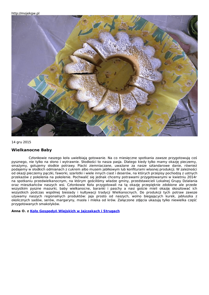 http://mojekgw.pl 14 gru 2015 Wielkanocne Baby Członkowie naszego koła uwielbiają gotowanie. Na co miesięczne spotkania zawsze przygotowują coś pysznego, nie tylko na słono i wytrawnie. Słodkości to nasza pasja. Dlatego kiedy tylko mamy okazję pieczemy, smażymy, gotujemy słodkie potrawy. Placki ziemniaczane, uważane za nasze sztandarowe danie, również podajemy w słodkich odmianach z cukrem albo musem jabłkowym lub konfiturami własnej produkcji. W zależności od okazji pieczemy pączki, faworki, szarlotki i wiele innych ciast i deserów, na których przepisy pochodzą z ustnych przekazów z pokolenia na pokolenie. Pochwalić się jednak chcemy potrawami przygotowanymi w kwietniu 2014r na spotkaniu przedwielkanocnym, na którym gościliśmy władze gminy, przedstawicieli Lokalnej Grupy Działania oraz mieszkańców naszych wsi. Członkowie Koła przygotowali na tą okazję przepięknie zdobione ale przede wszystkim pyszne mazurki, baby wielkanocne, baranki i paschy a nasi goście mieli okazję skosztować ich wszystkich podczas wspólnej biesiady i kultywacji tradycji Wielkanocnych. Do produkcji tych potraw zawsze używamy naszych regionalnych produktów: jaja prosto od naszych, wolno biegających kurek, jabłuszka z okolicznych sadów, serów, margaryny, masła i mleka od krów. Załączone zdjęcia ukazują tylko niewielka część przygotowanych smakołyków. Anna O. z Koło Gospodyń Wiejskich w Jajczakach i Strugach