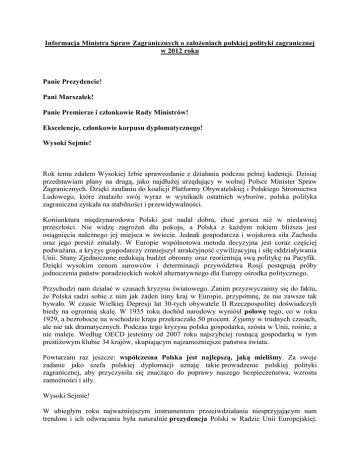 Informacja Ministra Spraw Zagranicznych o założeniach polskiej polityki zagranicznej w 2012 roku Panie Prezydencie! Pani Marszałek! Panie Premierze i członkowie Rady Ministrów! Ekscelencje, członkowie korpusu dyplomatycznego! Wysoki Sejmie! Rok temu zdałem Wysokiej Izbie sprawozdanie z działania podczas pełnej kadencji. Dzisiaj przedstawiam plany na drugą, jako najdłużej urzędujący w wolnej Polsce Minister Spraw Zagranicznych. Dzięki zaufaniu do koalicji Platformy Obywatelskiej i Polskiego Stronnictwa Ludowego, które znalazło swój wyraz w wynikach ostatnich wyborów, polska polityka zagraniczna zyskała na stabilności i przewidywalności. Koniunktura międzynarodowa Polski jest nadal dobra, choć gorsza niż w niedawnej przeszłości. Nie widzę zagrożeń dla pokoju, a Polska z każdym rokiem bliższa jest osiągnięcia należnego jej miejsca w świecie. Jednak gospodarcza i wojskowa siła Zachodu oraz jego prestiż zmalały. W Europie wspólnotowa metoda decyzyjna jest coraz częściej podważana, a kryzys gospodarczy zmniejszył atrakcyjność cywilizacyjną i siłę oddziaływania Unii. Stany Zjednoczone redukują budżet obronny oraz reorientują swą politykę na Pacyfik. Dzięki wysokim cenom surowców i determinacji przywództwa Rosji postępują próby jednoczenia państw poradzieckich wokół alternatywnego dla Europy ośrodka politycznego. Przychodzi nam działać w czasach kryzysu światowego. Zanim przyzwyczaimy się do faktu, że Polska radzi sobie z nim jak żaden inny kraj w Europie, przypomnę, że nie zawsze tak bywało. W czasie Wielkiej Depresji lat 30-tych obywatele II Rzeczpospolitej doświadczyli biedy na ogromną skalę. W 1935 roku dochód narodowy wyniósł połowę tego, co w roku 1929, a bezrobocie na wschodzie kraju przekraczało 50 procent. Żyjemy w trudnych czasach, ale nie tak dramatycznych. Podczas tego kryzysu polska gospodarka, szósta w Unii, rośnie, a nie maleje. Według OECD jesteśmy od 2007 roku najszybciej rosnącą gospodarką w tym prestiżowym klubie 34 krajów, skupiającym najzamożniejsze państwa świata. Powtarzam raz jeszcze: współczesna Polska jest najlepszą, jaką mieliśmy. Za swoje zadanie jako szefa polskiej dyplomacji uznaję takie prowadzenie polskiej polityki zagranicznej, aby przyczyniła się znacząco do poprawy naszego bezpieczeństwa, wzrostu zamożności i siły. Wysoki Sejmie! W ubiegłym roku najważniejszym instrumentem przeciwdziałania niesprzyjającym nam trendom i ich odwracania była naturalnie prezydencja Polski w Radzie Unii Europejskiej. Mogę z dumą powiedzieć, że mimo niekorzystnych okoliczności polskie przewodnictwo jest uważane za najlepsze od wejścia w życie Traktatu z Lizbony. „Polska w awangardzie Europy” - to Libération, „Oscar dla Polski za prezydencję” [Hospodářské noviny], „Polska powstrzymuje eurosceptycyzm” [El País], „Uczmy się europejskiego ducha od Polaków” - to włoski dziennik. Oto zaledwie kilka tytułów z prasy zagranicznej opisujących polską prezydencję. Tę pozytywną opinię podzielili nasi rodacy - aż 68 proc. Polaków uważa, że prezydencja była udana. Potwierdziliśmy naszą pozycję ważnego państwa członkowskiego. Zmieniliśmy wizerunek Polski z kraju, który jedynie z Unii czerpie, na państwo, które owszem czerpie, ale i pobudza innych do działania. Dziś kojarzymy się ze wzrostem gospodarczym, nowoczesnością i skutecznym zarządzaniem – staliśmy się partnerem, o którego warto zabiegać. Polska udowodniła, że jest wiarygodnym i odpowiedzialnym podmiotem - państwem przynoszącym rozwiązania, a nie problemy. Utrzymaliśmy wiarę w Unię, promując zasadę „więcej, a nie mniej Europy”. Strzegliśmy spójności Unii w obliczu propozycji, które podważały istotę całej Wspólnoty. Dzięki polskim wysiłkom Parlament Europejski przyjął tzw. sześciopak, czyli pakiet rozporządzeń i dyrektyw wzmacniających ład gospodarczy w strefie euro. Uważam, że gdyby Unia przyjęła go wcześniej, do tak poważnego kryzysu mogłoby nie dojść. Polska prezydencja opracowała też „Europejski konsensus na rzecz wzrostu” – raport zawierający rekomendacje, jak przyspieszyć rozwój gospodarczy w Europie. Nasze przewodnictwo przybliżyło Unię do oczekiwanego od trzydziestu lat kompromisu w sprawie patentu europejskiego. Podpisaliśmy także traktat akcesyjny z Chorwacją i zamknęliśmy 6 rozdziałów negocjacyjnych z Islandią. Nasza administracja wykazała się sprawnością, a urzędnicy kompetencją i skutecznością. Polska prezydencja – mimo zaangażowania Unii na Południu - przedstawiła ofertę dla Wschodu. Uzgodniliśmy tekst umowy stowarzyszeniowej z Ukrainą, która powinna być parafowana już jutro. Zainicjowaliśmy negocjacje podobnych umów z Gruzją i Mołdawią. To, czy europejskie aspiracje naszych wschodnich sąsiadów ziszczą się, zależy przede wszystkim od nich samych. W Warszawie odbył się drugi szczyt Partnerstwa Wschodniego, na którym państwa Unii przyjęły deklarację w sprawie nieprzestrzegania standardów demokratycznych na Białorusi. Debata wokół tej deklaracji pokazała też niestety, że nie wszystkie państwa Partnerstwa są świadome, iż droga do Europy wiedzie poprzez przestrzeganie europejskich standardów demokracji. Eurosceptyków pytam: czy wyobrażają sobie Państwo naszą politykę wschodnią bez Unii Europejskiej? Czy sami bylibyśmy w stanie sfinansować taki projekt, jak Partnerstwo Wschodnie? Właśnie na Wschodzie wyraźniej niż gdziekolwiek widać to, o czym piszą akademickie podręczniki integracji europejskiej: dzięki Unii polska siła oddziaływania zwielokrotnia się. Szanowni Państwo! W czasie prezydencji tradycyjnie działaliśmy na rzecz stabilnego otoczenia Unii Europejskiej. Zarówno południowego, jak i wschodniego wymiaru polityki sąsiedztwa. Obu wektorom tej polityki będzie służył zaproponowany przeze mnie Europejski Fundusz na