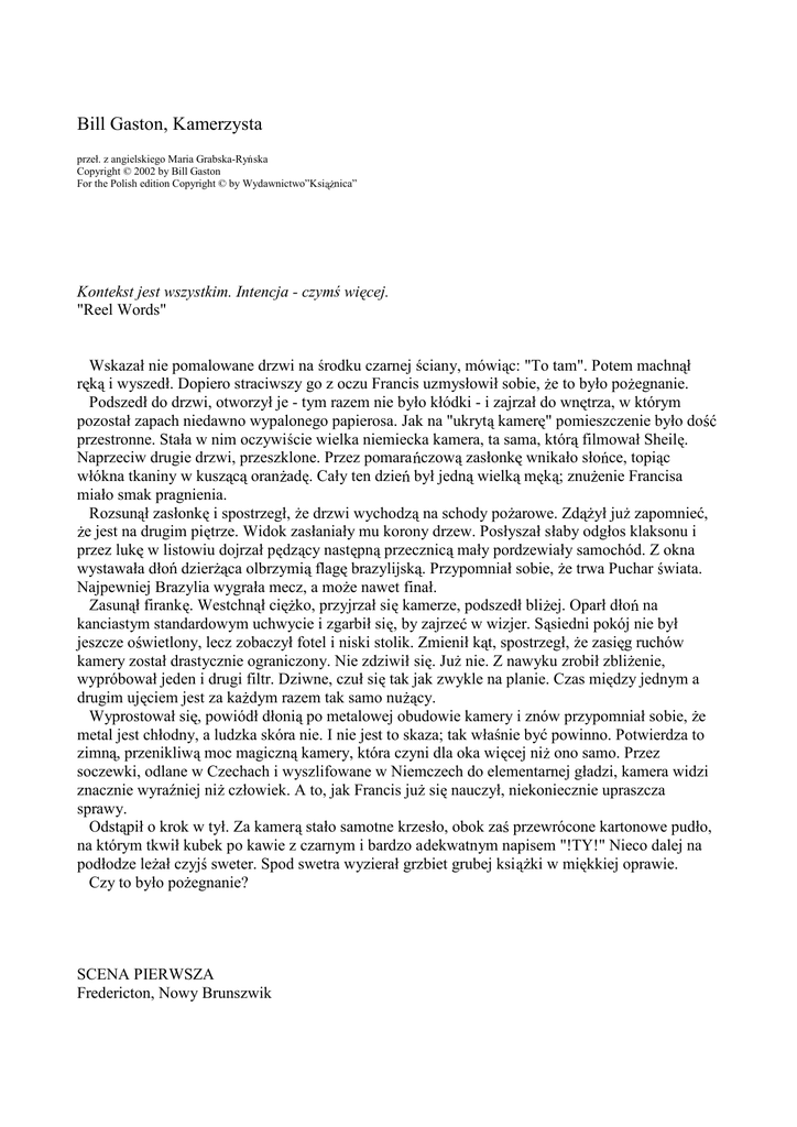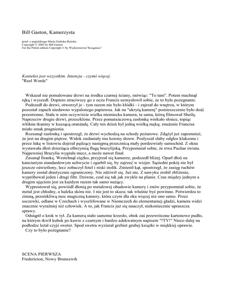 Bill Gaston, Kamerzysta ń przeł. z angielskiego Maria Grabska-Ry ska Copyright © 2002 by Bill Gaston For the Polish edition Copyright © by Wydawnictwo”Ksi nica” ą Ŝ ś Kontekst jest wszystkim. Intencja - czym wi cej. "Reel Words" ę Wskazał nie pomalowane drzwi na rodku czarnej ciany, mówi c: "To tam". Potem machn ł r k i wyszedł. Dopiero straciwszy go z oczu Francis uzmysłowił sobie, e to było po egnanie. Podszedł do drzwi, otworzył je - tym razem nie było kłódki - i zajrzał do wn trza, w którym pozostał zapach niedawno wypalonego papierosa. Jak na "ukryt kamer " pomieszczenie było do przestronne. Stała w nim oczywi cie wielka niemiecka kamera, ta sama, któr filmował Sheil . Naprzeciw drugie drzwi, przeszklone. Przez pomara czow zasłonk wnikało sło ce, topi c włókna tkaniny w kusz c oran ad . Cały ten dzie był jedn wielk m k ; znu enie Francisa miało smak pragnienia. Rozsun ł zasłonk i spostrzegł, e drzwi wychodz na schody po arowe. Zd ył ju zapomnie , e jest na drugim pi trze. Widok zasłaniały mu korony drzew. Posłyszał słaby odgłos klaksonu i przez luk w listowiu dojrzał p dz cy nast pn przecznic mały pordzewiały samochód. Z okna wystawała dło dzier ca olbrzymi flag brazylijsk . Przypomniał sobie, e trwa Puchar wiata. Najpewniej Brazylia wygrała mecz, a mo e nawet finał. Zasun ł firank . Westchn ł ci ko, przyjrzał si kamerze, podszedł bli ej. Oparł dło na kanciastym standardowym uchwycie i zgarbił si , by zajrze w wizjer. S siedni pokój nie był jeszcze o wietlony, lecz zobaczył fotel i niski stolik. Zmienił k t, spostrzegł, e zasi g ruchów kamery został drastycznie ograniczony. Nie zdziwił si . Ju nie. Z nawyku zrobił zbli enie, wypróbował jeden i drugi filtr. Dziwne, czuł si tak jak zwykle na planie. Czas mi dzy jednym a drugim uj ciem jest za ka dym razem tak samo nu cy. Wyprostował si , powiódł dłoni po metalowej obudowie kamery i znów przypomniał sobie, e metal jest chłodny, a ludzka skóra nie. I nie jest to skaza; tak wła nie by powinno. Potwierdza to zimn , przenikliw moc magiczn kamery, która czyni dla oka wi cej ni ono samo. Przez soczewki, odlane w Czechach i wyszlifowane w Niemczech do elementarnej gładzi, kamera widzi znacznie wyra niej ni człowiek. A to, jak Francis ju si nauczył, niekoniecznie upraszcza sprawy. Odst pił o krok w tył. Za kamer stało samotne krzesło, obok za przewrócone kartonowe pudło, na którym tkwił kubek po kawie z czarnym i bardzo adekwatnym napisem "!TY!" Nieco dalej na podłodze le ał czyj sweter. Spod swetra wyzierał grzbiet grubej ksi ki w mi kkiej oprawie. Czy to było po egnanie? ś ę ś ą ą ą Ŝ Ŝ ę ą ę ś ś ą ń ą ą Ŝ ą Ŝ ę ę ą ń ą Ŝ ę ę ń ą ą ę ą ą Ŝ Ŝ ą Ŝ Ŝ ć ę ę ę ń Ŝ ą ą ę ą ą ą ę ą Ŝ ś Ŝ ą ę ą ę Ŝ ę Ŝ ę ć ś ą ę ń ą Ŝ ę Ŝ Ŝ ę ę Ŝ ę Ŝ ę ą ą Ŝ ś ą ą ą ź Ŝ ą Ŝ ą Ŝ ś Ŝ SCENA PIERWSZA Fredericton, Nowy Brunszwik ć ę Ŝ ę ś ą Ŝ ę ć ś Wszyscy s dz , e ycie było kiedy proste i sprawiedliwe jak w filmie "Leave it to Beaver" i e mo emy powróci do tego stanu. Nawet ja sam po trosze w to wierz . To sprawka telewizji. Zobaczy znaczy uwierzy . Tymczasem prawdziwe ycie nigdy tak nie wygl dało - nawet w przybli eniu. Cholerny srebrny ekran! "Debris" ą Ŝ ą Ŝ Ŝ Ŝ ć ę ć ć Ŝ ą Ŝ - To b dzie realizm? - spytała Lucy, starannie dziel c ostatnie słowo na dwa. Francis przestał si ju dziwi , sk d trzyipółletnie dziecko zna takie poj cie jak "realizm". Lucy była przera aj co wygadana. Przyda jej si to pó niej, kiedy b dzie musiała wyja ni poddanym, dlaczego brakuje im chleba i igrzysk. - Mo e by realizm, czemu nie - zgodził si . Zwin ł poduszk pod głow , zastanawiaj c si , od czego zacz . Jakie zwierz tko b dzie odpowiednim bohaterem dzisiejszej bajki, Pies Ogoniasty czy mo e Bóbr Pilarek? Pies Ogoniasty był nieco zbyt abstrakcyjny i Lucy troch si go bała. Z kolei wibruj ce "rrr" Bobra Pilarka skutecznie wybijało j ze snu. (Francis zastanowił si przelotnie, czy kiedy u pi dziewczynk w małym łó eczku, jej matka wynagrodzi go w du ym.) Lucy szarpn ła welon pluszowego dinozaura w stroju panny młodej. - No, zaczynaj - ponagliła go. Francis nie miał wprawy w zabawianiu dzieci. Było w tym co upokarzaj cego. Zarabiał na ycie obrazuj c wymy lne bajki dla dorosłych, opowie ci, które kosztowały miliony. Jego subtelne wizje pewien krytyk okre lił nawet słowem "genialne". Nie powinien mie problemu z fabułk na dobranoc. A jednak czuł si tak, jakby musiał operowa wył cznie trzema podstawowymi barwami. Lucy westchn ła ze zniecierpliwieniem. Cho mo e grzeszył arogancj . Mo e bajki dla dzieci powinny by wła nie... - No, mów! - Pewnego ranka Pies Ogoniasty obudził si w dobrym humorze. Słonko u miechało si do niego z nieba; chciał pomerda , ale to jego olbrzymi ogon pozostał na ziemi, merdaj c psem w powietrzu, tam i z powrotem, tak wysoko, e Pies Ogoniasty zahaczył nosem o szczyt masztu, na którym powiewała flaga. Pomimo to pies czuł si tak szcz liwy, e postanowił ju nigdy nikogo nie gry . Nawet kiedy ni st d, ni zow d pojawił si Tłusty Kocur wyci gaj c ostre pazury... - To nie jest real-izm - o wiadczyła Lucy. A to dobre! - pomy lał Francis. - Bev si u mieje, kiedy jej to opowiem. Sam by si u miał, gdyby nie grobowy wyraz twarzy Lucy. Do licha, ci mali ludzie skłonni s rozpacza nad byle czym. Gotowi płaka z powodu nieudanej historyjki. Miał ochot da jej zakosztowa prawdziwego realizmu: "Moja droga, to nie jest tak, jak my lisz. To ja wy wiadczam ci przysług plot c te androny i ja jestem tu bardziej poszkodowany." Ciekawe, czy nachodziłyby go takie my li, gdyby Lucy była jego córk . Zerkn ł na mał . Niebezpiecze stwo ulewy łez min ło, lecz wci miała ało nie od te usta usta Bev, podobnie jak okr gła buzia i g ste jasne włosy. Tylko oczy miała obce, jasnoszare ze ladem szafiru, okolone cienk jak włos czarn ob