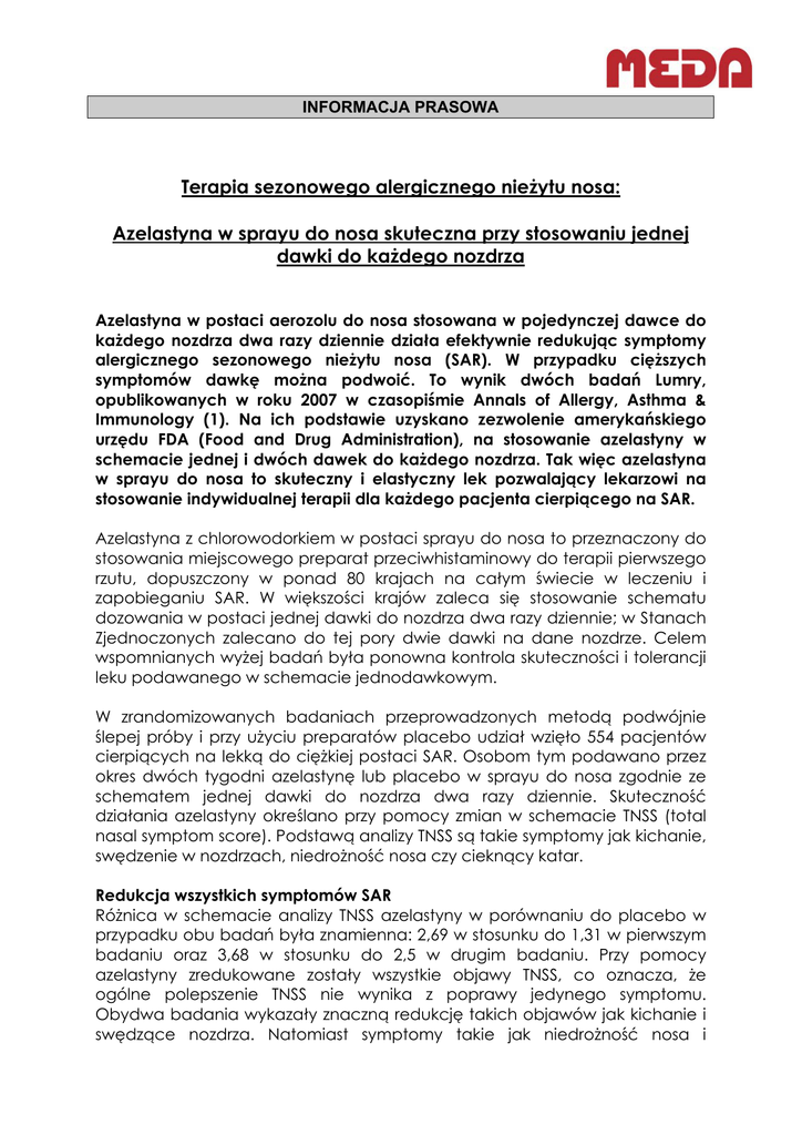 INFORMACJA PRASOWA Terapia sezonowego alergicznego nieżytu nosa: Azelastyna w sprayu do nosa skuteczna przy stosowaniu jednej dawki do każdego nozdrza Azelastyna w postaci aerozolu do nosa stosowana w pojedynczej dawce do każdego nozdrza dwa razy dziennie działa efektywnie redukując symptomy alergicznego sezonowego nieżytu nosa (SAR). W przypadku cięższych symptomów dawkę można podwoić. To wynik dwóch badań Lumry, opublikowanych w roku 2007 w czasopiśmie Annals of Allergy, Asthma & Immunology (1). Na ich podstawie uzyskano zezwolenie amerykańskiego urzędu FDA (Food and Drug Administration), na stosowanie azelastyny w schemacie jednej i dwóch dawek do każdego nozdrza. Tak więc azelastyna w sprayu do nosa to skuteczny i elastyczny lek pozwalający lekarzowi na stosowanie indywidualnej terapii dla każdego pacjenta cierpiącego na SAR. Azelastyna z chlorowodorkiem w postaci sprayu do nosa to przeznaczony do stosowania miejscowego preparat przeciwhistaminowy do terapii pierwszego rzutu, dopuszczony w ponad 80 krajach na całym świecie w leczeniu i zapobieganiu SAR. W większości krajów zaleca się stosowanie schematu dozowania w postaci jednej dawki do nozdrza dwa razy dziennie; w Stanach Zjednoczonych zalecano do tej pory dwie dawki na dane nozdrze. Celem wspomnianych wyżej badań była ponowna kontrola skuteczności i tolerancji leku podawanego w schemacie jednodawkowym. W zrandomizowanych badaniach przeprowadzonych metodą podwójnie ślepej próby i przy użyciu preparatów placebo udział wzięło 554 pacjentów cierpiących na lekką do ciężkiej postaci SAR. Osobom tym podawano przez okres dwóch tygodni azelastynę lub placebo w sprayu do nosa zgodnie ze schematem jednej dawki do nozdrza dwa razy dziennie. Skuteczność działania azelastyny określano przy pomocy zmian w schemacie TNSS (total nasal symptom score). Podstawą analizy TNSS są takie symptomy jak kichanie, swędzenie w nozdrzach, niedrożność nosa czy cieknący katar. Redukcja wszystkich symptomów SAR Różnica w schemacie analizy TNSS azelastyny w porównaniu do placebo w przypadku obu badań była znamienna: 2,69 w stosunku do 1,31 w pierwszym badaniu oraz 3,68 w stosunku do 2,5 w drugim badaniu. Przy pomocy azelastyny zredukowane zostały wszystkie objawy TNSS, co oznacza, że ogólne polepszenie TNSS nie wynika z poprawy jedynego symptomu. Obydwa badania wykazały znaczną redukcję takich objawów jak kichanie i swędzące nozdrza. Natomiast symptomy takie jak niedrożność nosa i cieknący katar w porównaniu do grupy placebo wystąpiły jednostkowo, ale znaczne obniżenie ich występowalności odnotowano tylko w jednym z obu badań. Obydwa badania wykazały dobrą tolerancję azelastyny w sprayu do nosa. Tylko w przypadku 8,3 proc. pacjentów odnotowano gorzki smak w ustach. Odpowiada to redukcji w wysokości 50 procent w porównaniu ze stosowaniem dwóch dawek na każde nozdrze (zgodnie z ulotką 19,7 procent). Poczuce senności wystąpiło tylko u jednego pacjenta (0,4 procent); liczba ta wynosiła u pacjentów stosujących podwójną dawkę 11,5 procent. Różnorodne możliwości terapii Azelastynę stosować można w różnorodny sposób. Pojedynczą dawkę stosuje się w przypadkach łagodnych objawów SAR i w zależności od potrzeby można ją podwoić. Dzięki szybko następującej reakcji (15 minut) azelastyna nadaje się do wywołania tzw. efektu "first dose" (2). U pacjentów ze średnimi i ciężkimi objawami SAR stosowanie azelastyny w kombinacji z glikokortykoidowym sprayem do nosa Fluticason prowadzi do wyraźnie lepszego efektu terapeutycznego, niż zastosowanie tylko jednego z nich (3). (1) Lumry W, et al., ANNALS OF ALLERGY, ASTHMA & IMMUNOLOGY, Vol. 99, September 2007 (2) Horak F et al., Curr Med Res Opin. (3) Ratner PH et al., Ann Allergy Asthma Immunol. MEDA AB (publ) to międzynarodowa specjalistyczna firma farmaceutyczna, która zajmuje się głównie działalnością marketingową i rozwojem produktu, zgodnie z potrzebami rynku. Podstawowymi wyznacznikami strategii firmy są akwizycje i długotrwałe partnerstwa. Meda posiada oddziały w 26 krajach i zatrudnia ponad 1.500 pracowników w dziale marketingu i sprzedaży. Produkty firmy są sprzedawane w około 120 krajach. Meda jest notowana w kategorii dużych przedsiębiorstw na Nordyckiej Liście giełdowej OMX. Dowiedz się więcej odwiedzając MEDA AB ; MEDA Pharma GmbH & Co. KG: www.medapharma.de Siedziba: Bad Homburg v.d.H. Sąd Rejonowy Bad Homburg v.d.H.; Rejestr Handlowy A 4628 Wspólnik osobiście odpowiedzialny: MEDA Verwaltungs GmbH, Sąd Rejonowy Bad Homburg v.d.H.; Rejestr Handlowy B 9810 Dyrektorzy Zarządzający: Dr. Jörg-Thomas Dierks, Hans-Jürgen Kromp Dalsze informacje: www.meda.se. www.azelastine.info www.admit-online.info 3.687 znaków (ze spacjami i nagłówkami). Przedruk bezpłatny, proszę o egzemplarz autorski. Bad Homburg, Niemcy, maj 2008 Kontakt w celu uzyskania dalszych informacji: Dr. Larisa Leibersperger MEDA Pharma GmbH & Co. KG Benzstrasse 1 61352 Bad Homburg Tel.: +49 6172 888 2631 E-mail: [email protected]