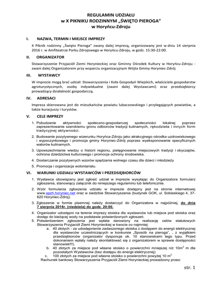 REGULAMIN UDZIAŁU w X PIKNIKU RODZINNYM „ŚWIĘTO PIEROGA” w Horyńcu-Zdroju I. NAZWA, TERMIN I MIEJSCE IMPREZY X Piknik rodzinny „Święto Pieroga” zwany dalej imprezą, organizowany jest w dniu 14 sierpnia 2016 r. w Amfiteatrze Parku Zdrojowego w Horyocu-Zdroju, w godz. 15:30-22:00. II. ORGANIZATOR Stowarzyszenie Przyjaciół Ziemi Horynieckiej oraz Gminny Ośrodek Kultury w Horyocu-Zdroju zwani dalej Organizatorem przy wsparciu organizacyjnym Wójta Gminy Horyniec-Zdrój III. WYSTAWCY W imprezie mogą brad udział: Stowarzyszenia i Koła Gospodyo Wiejskich, właściciele gospodarstw agroturystycznych, osoby indywidualne (zwani dalej Wystawcami) oraz przedsiębiorcy prowadzący działalnośd gospodarczą. IV. ADRESACI Impreza skierowana jest do mieszkaoców powiatu lubaczowskiego i przylegających powiatów, a także kuracjuszy i turystów. V. CELE IMPREZY 1. Pobudzanie aktywności społeczno-gospodarczej społeczności lokalnej poprzez zaprezentowanie szerokiemu gronu odbiorców tradycji kulinarnych, rękodzieła i innych form tradycyjnej aktywności. 2. Budowanie pozytywnego wizerunku Horyńca-Zdroju jako atrakcyjnego ośrodka uzdrowiskowego i wypoczynkowego i promocja gminy Horyniec-Zdrój poprzez wyeksponowanie specyficznych walorów kulinarnych. 3. Upowszechnianie wiedzy o historii regionu, pielęgnowanie miejscowych tradycji i obyczajów, ochrona dziedzictwa kulturowego i promocja ochrony środowiska. 4. Dostarczanie pozytywnych wzorów spędzania wolnego czasu dla dzieci i młodzieży 5. Promocja i organizacja wolontariatu. VI. WARUNKI UDZIAŁU WYSTAWCÓW I PRZEDSIĘBIORCÓW 1. Wystawca obowiązany jest zgłosić udział w imprezie wysyłając do Organizatora formularz zgłoszenia, stanowiący załącznik do niniejszego regulaminu lub telefonicznie. 2. Wzór formularza zgłoszenia udziału w imprezie dostępny jest na stronie internetowej www.spzh.horyniec.net oraz w siedzibie Stowarzyszenia (budynek GOK, ul. Sobieskiego 4, 37620 Horyniec-Zdroj). 3. Zgłoszenie w formie pisemnej należy dostarczyć do Organizatora w najpóźniej, do dnia 7 sierpnia 2016r. (niedziela) do godz. 20:00. 4. Organizator udostępni na terenie imprezy stoiska dla wystawców lub miejsce pod stoiska oraz dostęp do bieżącej wody na podstawie potwierdzonych zgłoszeń. 5. Potwierdzeniem zgłoszenia jest wpłata darowizny na realizację celów statutowych Stowarzyszenia Przyjaciół Ziemi Horynieckiej w kwocie co najmniej: a. 40 złotych - za udostępnienie zadaszonego stoiska z dostępem do energii elektrycznej dla wystawców uczestniczących w konkursie „Sposób na pieroga”, , z wyjątkiem przedsiębiorców (organizator dysponuje ok. 10 stanowiskami tego typu. Przed dokonaniem wpłaty należy skontaktować się z organizatorem w sprawie dostępności stanowisk!!!). 2 b. 40 złotych za miejsce pod własne stoisko o powierzchni mniejszej niż 10m m dla pozostałych Wystawców (bez dostępu do energii elektrycznej) 2 c. 100 złotych za miejsce pod własne stoisko o powierzchni powyżej 10 m Rachunek bankowy Stowarzyszenia Przyjaciół Ziemi Horynieckiej prowadzony przez: str. 1 REGULAMIN UDZIAŁU w X PIKNIKU RODZINNYM „ŚWIĘTO PIEROGA” w Horyńcu-Zdroju Bank Spółdzielczy w Lubaczowie Oddział w Horyńcu-Zdroju Nr rachunku: 46 9101 1039 2002 2500 1469 0001 tytułem „Darowizna na realizację celów statutowych Stowarzyszenia” 6. Na podstawie potwierdzonego pisemnego zgłoszenia Organizator zapewnia Wystawcom możliwość prezentacji na imprezie własnych tradycyjnych produktów kulinarnych, a w szczególności pierogów.. Sprzedaż produktów odbywa się na własną odpowiedzialność Wystawców i przedsiębiorców. 7. Organizator przewiduje oznakowanie zgłoszonych stoisk poprzez umieszczenie nazwy Wystawcy, przedsiębiorcy oraz logo Organizatora. 8. Wystawca obowiązany jest umieścić na swoim stoisku informację o oferowanych rodzajach pierogów. VII. WARUNKI TECHNICZNE 1. Organizator zobowiązany jest do udzielania niezbędnych informacji uczestnikom konkursu. 2. Ze względu na istniejące warunki terenowe Organizator: a. nie może zapewnić wszystkim Wystawcom dostępu do energii elektrycznej (liczy się kolejność zgłoszeń). W przypadku używania do podgrzewania kuchenek gazowych, za stan techniczny podłączonych urządzeń i bezpieczeństwo użytkowania odpowiada Wystawca. b. nie może zapewnić wszystkim wystawcom dostępu do bieżącej wody (wskazane jest podawanie potraw w naczyniach jednorazowych) 3. Organizator nie zwraca Wystawcom poniesionych kosztów związanych z przygotowaniem produktów, wystrojem stanowiska, dojazdem czy innych. 4. Wystawca zobowiązany jest do samodzielnego udekorowania swojego stanowiska (np. obrus, kwiaty itp.), a także do zaopatrzenia się w niezbędne naczynia. 5. Wystawca zobowiązany jest do zapewnienia na stoisku właściwych warunków higienicznosanitarnych i p.poż. zgodnie z obowiązującymi przepisami. Wystawca powinien dysponować osobami spełniającymi warunki wynikające z obowiązujących przepisów sanitarnych. 6. Wystawca prowadzący działalność gospodarczą (jeśli wymagane) ma obowiązek posiadania kasy fiskalnej oraz jej używania. Za brak kasy fiskalnej Wystawca odpowiada samodzielnie. 7. Przygotowane stoiska będą przydzielane na podstawie kolejności zgłoszeń przyznany zostanie numer odpowiadający kolejności zgłoszenia. VIII. INFORMACJE DODATKOWE 1. Organizator zastrzega sobie prawo do publikacji, a także przekazywanie mediom następujących informacji: imiona i nazwiska laureatów konkursów / uczestników, nazwy produktów, przepisy i zdjęcia produktów, a także listy uczestników (bez względu na zajęte miejsce). 2. Organizator zastrzega sobie prawo zorganizowania podczas imprezy, quizów, konkursów i turniejów wg odrębnych regulaminów i zasad (np. konkurs wiedzy o okolicy, konkursy sprawnościowe, konkurs na najładniejsze stoisko Wystawcy, itp.) 3. Wszelkie pytania należy kierować do: Krzysztof 