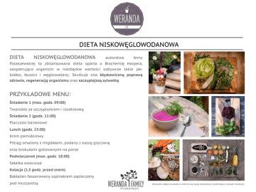DIETA NISKOWĘGLOWODANOWA DIETA NISKOWĘGLOWODANOWA autorstwa Anny Polaszewskiej to zbilansowana dieta oparta o Biochemię Harpera, zaopatrująca organizm w niezbędne wartości odżywcze takie jak: białko, tłuszcz i węglowodany. Skutkuje ona błyskawiczną poprawą zdrowia, regeneracją organizmu oraz szczuplejszą sylwetką PRZYKŁADOWE MENU: Śniadanie 1 (max. godz. 09:00) Twarożek ze szczypiorkiem i rzodkiewką Śniadanie 2 (godz. 11:00) Placuszki bananowe Lunch (godz. 13:00) Krem pomidorowy Pstrąg smażony z migdałami, podany z kaszą gryczaną oraz brokułami gotowanymi na parze Podwieczorek (max. godz. 18:00) Sałatka owocowa Kolacja (1,5 godz. przed snem) Bakłażan faszerowany szpinakiem zapieczony pod mozzarellą Wszystkie zdjęcia zawarte w ofercie są naszą własnością i pochodzą z naszych realizacji