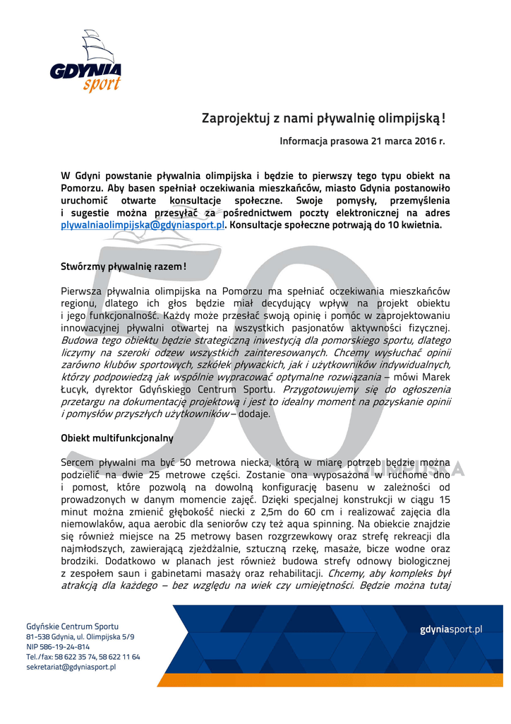 Zaprojektuj z nami pływalnię olimpijską! Informacja prasowa 21 marca 2016 r. W Gdyni powstanie pływalnia olimpijska i będzie to pierwszy tego typu obiekt na Pomorzu. Aby basen spełniał oczekiwania mieszkańców, miasto Gdynia postanowiło uruchomić otwarte konsultacje społeczne. Swoje pomysły, przemyślenia i sugestie można przesyłać za pośrednictwem poczty elektronicznej na adres [email protected]. Konsultacje społeczne potrwają do 10 kwietnia. Stwórzmy pływalnię razem! Pierwsza pływalnia olimpijska na Pomorzu ma spełniać oczekiwania mieszkańców regionu, dlatego ich głos będzie miał decydujący wpływ na projekt obiektu i jego funkcjonalność. Każdy może przesłać swoją opinię i pomóc w zaprojektowaniu innowacyjnej pływalni otwartej na wszystkich pasjonatów aktywności fizycznej. Budowa tego obiektu będzie strategiczną inwestycją dla pomorskiego sportu, dlatego liczymy na szeroki odzew wszystkich zainteresowanych. Chcemy wysłuchać opinii zarówno klubów sportowych, szkółek pływackich, jak i użytkowników indywidualnych, którzy podpowiedzą jak wspólnie wypracować optymalne rozwiązania – mówi Marek Łucyk, dyrektor Gdyńskiego Centrum Sportu. Przygotowujemy się do ogłoszenia przetargu na dokumentację projektową i jest to idealny moment na pozyskanie opinii i pomysłów przyszłych użytkowników – dodaje. Obiekt multifunkcjonalny Sercem pływalni ma być 50 metrowa niecka, którą w miarę potrzeb będzie można podzielić na dwie 25 metrowe części. Zostanie ona wyposażona w ruchome dno i pomost, które pozwolą na dowolną konfigurację basenu w zależności od prowadzonych w danym momencie zajęć. Dzięki specjalnej konstrukcji w ciągu 15 minut można zmienić głębokość niecki z 2,5m do 60 cm i realizować zajęcia dla niemowlaków, aqua aerobic dla seniorów czy też aqua spinning. Na obiekcie znajdzie się również miejsce na 25 metrowy basen rozgrzewkowy oraz strefę rekreacji dla najmłodszych, zawierającą zjeżdżalnie, sztuczną rzekę, masaże, bicze wodne oraz brodziki. Dodatkowo w planach jest również budowa strefy odnowy biologicznej z zespołem saun i gabinetami masaży oraz rehabilitacji. Chcemy, aby kompleks był atrakcją dla każdego – bez względu na wiek czy umiejętności. Będzie można tutaj oddać się sportowej rywalizacji, zadbać o zdrowie i odpocząć – mówi Marek Łucyk, dyrektor Gdyńskiego Centrum Sportu. W kompleksie znajdzie się również punkt gastronomiczny z widokiem na basen oraz sklep sportowy. Pozostała część budynku zostanie przeznaczona na zaplecze administracyjne, magazynowe oraz szatniowe. Gdyńskie Centrum Sportu planuje również utworzenie tutaj Punktu Informacji, w którym każdy będzie mógł uzyskać wszystkie niezbędne informacje dotyczące oferty sportowej Gdyni – dodaje. Z Gdyni do stolicy Miasto o planach budowy pływalni olimpijskiej poinformowało w grudniu na specjalnie zwołanej konferencji prasowej. Od tego czasu trwają intensywne prace mające na celu pozyskanie funduszy na realizację inwestycji. W ubiegłym tygodniu, złożyliśmy do Ministerstwa Sportu i Turystyki wniosek w sprawie wpisania obiektu na listę do Programu inwestycji o szczególnym znaczeniu dla sportu. Jeśli Ministerstwo rozpatrzy wniosek pozytywnie, kolejnym krokiem będzie podpisanie umowy o dofinansowanie, co mam nadzieję, nastąpi na początku przyszłego roku - mówi Marek Łucyk, dyrektor Gdyńskiego Centrum Sportu. Celem programu MSiT jest rozwój bazy obiektów służących potrzebom sportu. Inwestycję wspiera Polski Związek Pływacki, który widzi ogromną szansę na powstanie profesjonalnego obiektu szkoleniowego. Kiedy dowiedziałem się, że miasto Gdynia podjęło inicjatywę budowy obiektu, natychmiast nawiązaliśmy współpracę z Ministerstwem Sportu i Turystki. W województwie pomorskim brakuje obiektu tego typu. – mówił podczas grudniowej konferencji prasowej Andrzej Kowalski, prezes Polskiego Związku Pływackiego. Pomorze i Podlasie to jedyne województwa nieposiadające pełnowymiarowych pływalni olimpijskich, dlatego budowa obiektów w tych regionach jest konieczna – zapewnia. Nowa szansa dla sportowców Inwestycja w Gdyni rozwiąże problem całego regionu, w którym brakowało pływalni o wymiarach olimpijskich – najbliżej zlokalizowane obiekty 50 metrowe znajdują się dopiero w Olsztynie i Poznaniu. Mała ilość takich pływalni negatywnie wpływa na osiągane przez zawodników wyniki. To dla nas ogromna szansa. Dzięki pływalni będziemy mogli codziennie trenować na obiekcie olimpijskim. Jestem pewien, że inwestycja korzystnie wpłynie na popularyzację tego sportu w naszym mieście – mówi Mateusz Arndt, zawodnik KS Delfin Gdynia – wielka nadzieja gdyńskiego pływania. Realizacja i koszt projektu Prace nad dokumentacją projektową rozpoczną się po zakończeniu konsultacji społecznych. Według wstępnych szacunków całkowity koszt budowy to 70 milionów złotych. Budowa rozpocznie się wraz z otrzymaniem dofinansowania i trwać będzie 3 lata.