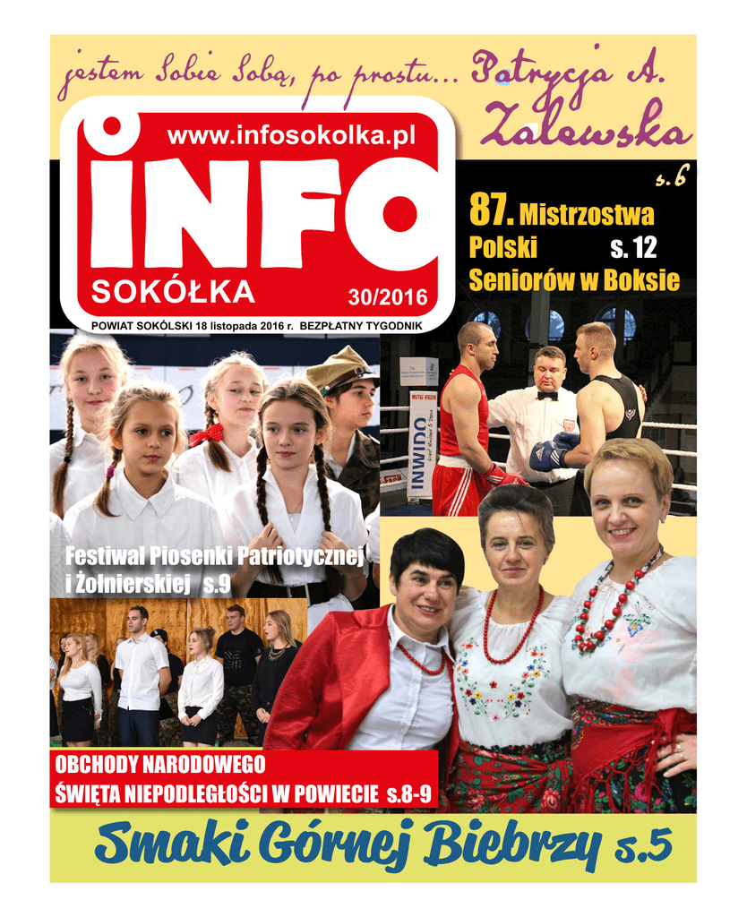 jestem Sobie Sobą, po prostu... Patrycja A. Zalewska ISSN 2450-999X 87. Mistrzostwa 30/2016 s.6 Polski s. 12 Seniorów w Boksie POWIAT SOKÓLSKI 18 listopada 2016 r. BEZPŁATNY TYGODNIK Festiwal Piosenki Patriotycznej i Żołnierskiej s.9 OBCHODY NARODOWEGO ŚWIĘTA NIEPODLEGŁOŚCI W POWIECIE s.8-9 Smaki Górnej Biebrzy s.5 www.infosokolka.pl 18 listopada 2016 r. Mieszkańcy Horczaków na spotkaniu ze Starostą Piotrem Rećko dotyczącym remontu drogi 1270B W miejscowości Horczaki odbyło się spotkanie Starosty Sokólskiego Piotra Rećko z mieszkańcami. Obecni byli także Dyrektor Powiatowego Zarządu Dróg Grzegorz Pul oraz wójt gminy Szudziałowo Tadeusz Tokarewicz. Spotkanie dotyczyło remontu drogi 1270B – Horczaki Dolne-Horczaki Górne. P.Krasnodębski ,,Wspólnie z mieszkańcami wypracowaliśmy koncepcję wyasfaltowania tego odcinka w roku 2019. Do tego czasu będziemy dokonywać bieżących napraw wspólnie z gminą Szudziałowo. Dziękuję serdecznie mieszkańcom Horczaków za przybycie na spotkanie” – Starosta Sokólski Piotr Rećko. Andrzej Wróblewski ,,Dworek” wybite szyby wewnątrz stół nakrył się kawałkami naczyń i rozbitym flakonem stary kredens dawno rozdał wszystko już się nie zamyka w przyciemnionej izbie opuszczonego dworku nieruchome postacie nad ranem słychać stukot końskich kopyt w oknie firana zwinięta w grymasie bólu i kropla łzy na szybie pozostał kaflowy piec ziejący smutkiem i chłodem i Chrystus na krzyżu z dziwnie nisko opuszczoną głową fot. Ewy Stelmaszek z opuszczonego dworku w Wandzinie, koło Sidry, Źródło: FB Stara Kamionka Synergia UKS ,,Mikolo” otrzyma nowe dresy sportowe oraz komplety siatkarskie Związek Emerytów i Rencistów w Sokółce organizuje Wieczór Andrzejkowy 26 listopada 2016 r., o godz. 17.00 w sali „Lira” Sokólskiego Ośrodka Kultury. Serdecznie zapraszamy wszystkich chętnych Emerytów i Rencistów z miasta i gminy Sokółka. 16 listopada w Starostwie Powiatowym w Sokółce podpisano protokół przekazania sprzętu sportowego dla Uczniowskiego Klubu Sportowego ,,Mikolo” w Sokółce. Starostwo Sokólskie reprezentowali Starosta Sokólski Piotr Rećko oraz Członek Zarządu Powiatu Sokólskiego Alicja Rysiejko. UKS ,,Mikolo” reprezentowali Prezes – Stanisław Marchiel oraz Sekretarz Krzysztof Zaniewski. Dzięki temu porozumieniu UKS ,,Mikolo” otrzyma nowe dresy sportowe oraz komplety siatkarskie. P. Krasnodębski Zapisy w gmachu Starostwa Powiatowego w Sokółce, ul. Piłsudskiego 8, pokój nr 17, od 17. 11.–24. 11. 2016 r. w godzinach 10.00 – 12.00. Henryk Cudnik Przewodniczący Związku Emerytów Rencistów w Sokółce Kalendarz wydarzeń Polskiego Związku Emerytów Rencistów i Inwalidów w Sokółce na 2017 rok 31.12/1.01. Sylwester seniorów w kawiarni „Lira” 11.02. Karnawał seniorów w kawiarni „Lira” 23.02. „Ostatki”, zapusty seniorów w kawiarni „Lira: 16.03. Spotkanie seniorów z Burmistrzem w kawiarni Lira 19.04. Dzień sprawnych 2 inaczej w kawiarni Lira 22.04. Adoracja Jezusa Eucharystycznego. Kościół pw. św. Antoniego 11.05. Spotkanie seniorów z lekarzem w kawiarni Lira 16-26.06. Turnus wypoczynkowo- turystyczny. Niechorze, Turnus wypoczynkowo-turystyczny. Gniezno 11.07. Wycieczka Hodyszewo. Łomża. Podlasie 12.08. Zwiedzanie skansenu i grill. Kamienica 23.08. Spotkanie artystów, twórców seniorów Sokółka 02-16.09. Turnus rehabilitacyjny. Iwonicz Zdrój 06-12.09. Turnus wypoczynkowo- turystyczny. Korbielów 18-26.09. Turnus wypo- czynkowo- turystyczny. Szklarska Poręba 23.09. Grzybobranie zawody 14.10. Dzień Seniora z Matką Boską Różano- stocką 15/16.11. Wycieczka Warszawa, Wilanów, teatr. Warszawa 26.11. Andrzejki seniorów w kawiarni „Lira”. Serdecznie zapraszamy do udziału seniorów nie tylko zrzeszonych w Związku. Zapisy przyjmowane są w Kołach. info Sokółka nr 30/2016 www.infosokolka.pl 18 listopada 2016 r. Pożegnaliśmy JERZEGO ZDANEWICZA i Jerzego Maliszewskiego W Kościele WNMP w Sokółce odbyło się Nabożeństwo Żałobne w intencji śp. pana Jerzego Maliszewskiego. Pana Jerzego żegnała rodzina, przyjaciele, współpracownicy, znajomi, mieszkańcy Sokółki, Gieniusz i okolic, samorządowcy, przedsiębiorcy oraz nasza, wspaniała młodzież… Obecny był również Starosta Sokólski Piotr Rećko wraz z Członkiem Zarządu Krzysztofem Szczebiotem. Nabożeństwo sprawował ks. Proboszcz Adam Baranowski. Żałobny kondukt z Kościoła na cmentarz eskortowała młodzież konno oraz dwóch rekonstruktorów husarii. Ciało śp. Jerzego Maliszewskiego złożono na cmentarzu parafialnym św. Antoniego. ES info Sokółka nr 30/2016 Żal, smutek, pustka… spotęgowane liczbą osób, których dotknęły te uczucia. Jerzy Zdanewicz, spoczął w grobie rodzinnym na cmentarzu parafialnym w Suchowoli… w swoim mundurze dyrygenta, z buławą u boku. Otoczony mnóstwem wieńców, wiązanek, kwiatów. W mroźny, mglisty dzień, w ciszy, przerywanej odgłosami syren, taktami wygrywanymi przez orkiestry dęte – wydawałoby się pięk- niej niż zwykle, rozdzierającym serce solowym głosem trąbki i słowami wspomnień wypowiadanymi w wielkim wzruszeniu. Na pogrzebie zebrał się prawdziwy tłum, rodzina, przyjaciele, członkowie Powiatowej Młodzieżowej Orkiestry Dętej z Suchowoli, Miejskiej Orkiestry Dętej z Białegostoku, przedstawiciele władz samorządowych, strażacy, mieszkańcy Suchowoli, powiatu, województwa… Na uroczystościach pogrzebowych obecny był Starosta Sokólski Piotr Rećko wraz z małżonkę Edytą oraz Wicestarosta Jerzy Białomyzy, Członek Zarządu Alicja Rysiejko, Radni: Sławomir Kraśnicki i Jerzy Karpienia oraz Dyrektor Wydziału do Spraw Społecznych Anna Aniśkiewicz. Patrycja A. Zalewska "Zabytki wielu kultur" nie są obce uczniom sokólskiego LO 9 listopada w zimowej aurze, w Bohonikach, uczniowie klasy II A/E LO im. M. Kopernika w Sokółce, wraz z wychowawczynią Małgorzatą Kułakows