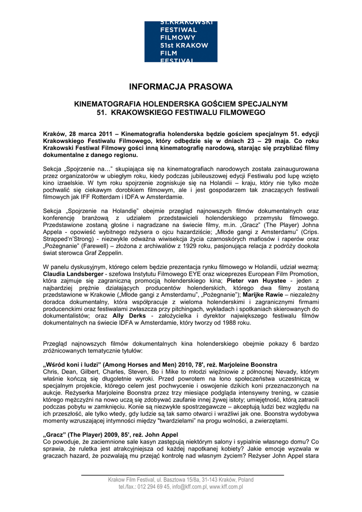 INFORMACJA PRASOWA KINEMATOGRAFIA HOLENDERSKA GOŚCIEM SPECJALNYM 51. KRAKOWSKIEGO FESTIWALU FILMOWEGO Kraków, 28 marca 2011 – Kinematografia holenderska będzie gościem specjalnym 51. edycji Krakowskiego Festiwalu Filmowego, który odbędzie się w dniach 23 – 29 maja. Co roku Krakowski Festiwal Filmowy gości inną kinematografię narodową, starając się przybliŜać filmy dokumentalne z danego regionu. Sekcja „Spojrzenie na…” skupiająca się na kinematografiach narodowych została zainaugurowana przez organizatorów w ubiegłym roku, kiedy podczas jubileuszowej edycji Festiwalu pod lupę wzięto kino izraelskie. W tym roku spojrzenie zogniskuje się na Holandii – kraju, który nie tylko moŜe pochwalić się ciekawym dorobkiem filmowym, ale i jest gospodarzem tak znaczących festiwali filmowych jak IFF Rotterdam i IDFA w Amsterdamie. Sekcja „Spojrzenie na Holandię” obejmie przegląd najnowszych filmów dokumentalnych oraz konferencję branŜową z udziałem przedstawicieli holenderskiego przemysłu filmowego. Przedstawione zostaną głośne i nagradzane na świecie filmy, m.in. „Gracz” (The Player) Johna Appela - opowieść wybitnego reŜysera o ojcu hazardziście; „Młode gangi z Amsterdamu” (Crips. Strapped‘n’Strong) - niezwykle odwaŜna wiwisekcja Ŝycia czarnoskórych mafiosów i raperów oraz „PoŜegnanie” (Farewell) – złoŜona z archiwaliów z 1929 roku, pasjonująca relacja z podróŜy dookoła świat sterowca Graf Zeppelin. W panelu dyskusyjnym, którego celem będzie prezentacja rynku filmowego w Holandii, udział wezmą: Claudia Landsberger - szefowa Instytutu Filmowego EYE oraz wiceprezes European Film Promotion, która zajmuje się zagraniczną promocją holenderskiego kina; Pieter van Huystee - jeden z najbardziej pręŜnie działających producentów holenderskich, którego dwa filmy zostaną przedstawione w Krakowie („Młode gangi z Amsterdamu”, „PoŜegnanie”); Marijke Rawie – niezaleŜny doradca dokumentalny, która współpracuje z wieloma holenderskimi i zagranicznymi firmami producenckimi oraz festiwalami zwłaszcza przy pitchingach, wykładach i spotkaniach skierowanych do dokumentalistów; oraz Ally Derks - załoŜycielka i dyrektor największego festiwalu filmów dokumentalnych na świecie IDFA w Amsterdamie, który tworzy od 1988 roku. Przegląd najnowszych filmów dokumentalnych kina holenderskiego obejmie pokazy 6 bardzo zróŜnicowanych tematycznie tytułów: „Wśród koni i ludzi” (Among Horses and Men) 2010, 78', reŜ. Marjoleine Boonstra Chris, Dean, Gilbert, Charles, Steven, Bo i Mike to młodzi więźniowie z północnej Nevady, którym właśnie kończą się długoletnie wyroki. Przed powrotem na łono społeczeństwa uczestniczą w specjalnym projekcie, którego celem jest pochwycenie i oswojenie dzikich koni przeznaczonych na aukcje. ReŜyserka Marjoleine Boonstra przez trzy miesiące podgląda intensywny trening, w czasie którego męŜczyźni na nowo uczą się zdobywać zaufanie innej Ŝywej istoty; umiejętność, którą zatracili podczas pobytu w zamknięciu. Konie są niezwykle spostrzegawcze – akceptują ludzi bez względu na ich przeszłość, ale tylko wtedy, gdy ludzie są tak samo otwarci i wraŜliwi jak one. Boonstra wydobywa momenty wzruszającej intymności między "twardzielami” na progu wolności, a zwierzętami. „Gracz” (The Player) 2009, 85’, reŜ. John Appel Co powoduje, Ŝe zaciemnione sale kasyn zastępują niektórym salony i sypialnie własnego domu? Co sprawia, Ŝe ruletka jest atrakcyjniejsza od kaŜdej napotkanej kobiety? Jakie emocje wyzwala w graczach hazard, Ŝe pozwalają mu przejąć kontrolę nad własnym Ŝyciem? ReŜyser John Appel stara Krakow Film Festival, ul. Basztowa 15/8a, 31-143 Kraków, Poland tel./fax.: 012 294 69 45, [email protected], www.kff.com.pl się zrozumieć Ŝyciorys własnego, uzaleŜnionego od gier, ojca, poprzez śledzenie historii 3 zatwardziałych hazardzistów. Harry Engels pracuje na wyścigach konnych, Harry Holland odsiaduje wyrok za oszustwa, a Ted Stonzelbach spędza Ŝycie w kasynach. „Młode gangi z Amsterdamu” (Crips. Strapped ‘n Strong) 2009, 84’, reŜ. Joost Van Der Valk, Mags Gavan Film opowiada o brutalnym Ŝyciu gangu Crips w Hadze - grupy składającej się z emigrantów z Surinamu i Antyli, którzy zajmują się napadami z bronią, handlem narkotykami i walką z konkurencyjnymi grupami. Film praktycznie bez cenzury pokazuje kulturę przemocy, na której opiera się wspólnota, którą początkowo łączyła muzyka hip hopowa. Twórcy starają się takŜe sięgnąć głębiej i dotrzeć do przemyśleń i uczuć samych gangsterów, których Ŝyciowe ścieŜki bywają mocno poplątane. „PoŜegnanie” (Farewell) 2010, 90’, reŜ. Ditteke Mensink W 1929 roku dziennikarka lady Grace Drummond-Hay została zaproszona do wzięcia udziału w pierwszym locie dookoła świata na sterowcu LZ-127 Graf Zeppelin. Niedawno owdowiała i znudzona pisaniem o damskiej modzie lady Grace skorzystała z okazji, aby zostać jedyną kobietą na pokładzie, co wzbudziło zrozumiałą sensację. Powróciła do Ameryki jako gwiazda, ale jej sprawozdania z podróŜy publikowane na pierwszych stronach gazet Hearsta opowiadały tylko część historii. W swoim pamiętniku zanotowała o wiele bardziej intymną relację z podróŜy - zmagania o przerwanie romansu z Ŝonatym towarzyszem podróŜy. Film jest spektakularnym połączeniem archiwalnych zdjęć z podróŜy przez Nowy Jork, Syberię, Tokio i Pacyfik oraz opowieści z artykułów i pamiętników lady Drummond. „Nasza gazeta” (Our Newspaper) 2010, 60' reŜ. Eline Flipse Andrei jest dziennikarzem na bardzo odległej od Moskwy rosyjskiej prowincji. Ludzie są tu biedni i zniesmaczeni polityką i mediami. Andrei zrezygnował z pracy w regionalnej gazecie "Leninowska" poniewaŜ czuł, Ŝe nie moŜe dalej pisać artykułów o niczym. Stworzył własny tygodnik, która ma obecni