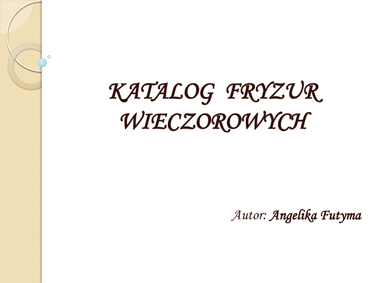 KATALOG FRYZUR WIECZOROWYCH Autor: Angelika Futyma Fryzura jest kwestią indywidualną. Pragniemy aby podkreślała nasz charakter oraz urodę. Dobieramy ją pamiętając o takich elementach jak kształt twarzy, typ urody oraz sylwetki. Fryzura ma być odpowiednia do stroju, okazji lub samopoczucia. Często wybieramy ją intuicyjnie, preferując tą, w której czujemy się dobrze, wygodnie oraz efektownie. Przedstawiam stworzony przeze mnie katalog fryzur wieczorowych. Fryzura w stylu romantycznym została wykonana przy pomocy ondulacji żelazkowej. Włosy zostały pokręcone na lokówce, następnie odpowiednio upięte. Grzywka została ułożona za pomocą falownicy i podpięta do tyłu. Praca nad przedstawioną fryzurą została rozpoczęta od zrobienia dobieranego warkocza na prawym boku. Następnie włosy zostały pokręcone na lokówce. Włosy z drugiego boku zostały pokręcone i podpięte. Efekt końcowy Efekt końcowy Włosy do przedstawionej fryzury zostały pokręcone za pomocą prostownicy, następnie zostały potapirowane i upięte na bok. Do ułożenia tej fryzury włosy zostały umyte i nawinięte na wałki do ondulacji wodnej. Następnie wysuszone, lekko potapirowane i upięte po bokach. Włosy do połowy głowy zostały pokręcone. Dół został natapirowany i podpięty, dodatkowo został użyty wypełniacz. Profil prawy Profil lewy Kolejna fryzura została rozpoczęta od potapirowania włosów od nasady, a następnie pokręcenia kolejnych pasm za pomocą prostownicy. Włosy zostały podpięte po bokach tworząc formę irokeza. Efekt końcowy Efekt końcowy Włosy zostały umyte i nawinięte na wałki o małej średnicy. Po wysuszeniu włosy zostały ułożone za pomocą palców dłoni. Z jednej strony bok został wygładzony i podpięty. Efekt końcowy