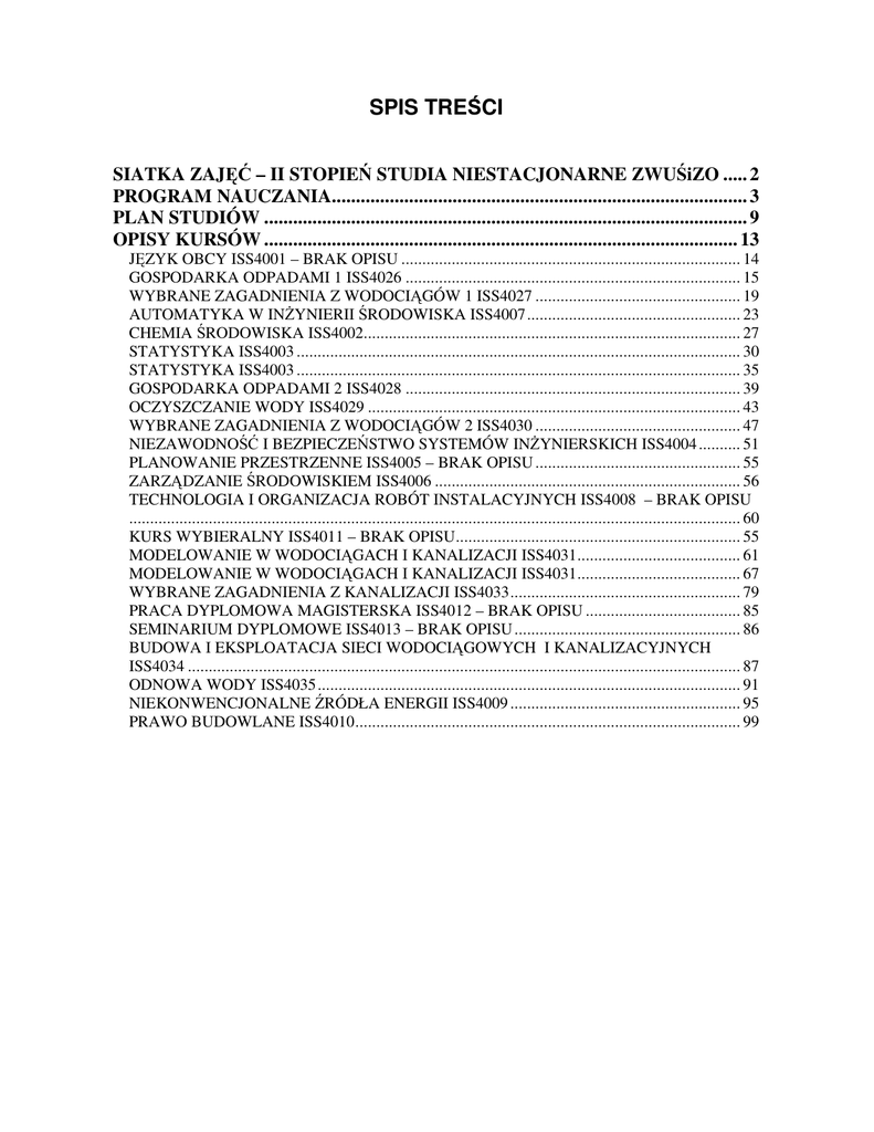 SPIS TREŚCI SIATKA ZAJĘĆ – II STOPIEŃ STUDIA NIESTACJONARNE ZWUŚiZO ..... 2 PROGRAM NAUCZANIA...................................................................................... 3 PLAN STUDIÓW .................................................................................................... 9 OPISY KURSÓW .................................................................................................. 13 JĘZYK OBCY ISS4001 – BRAK OPISU ................................................................................. 14 GOSPODARKA ODPADAMI 1 ISS4026 ................................................................................ 15 WYBRANE ZAGADNIENIA Z WODOCIĄGÓW 1 ISS4027 ................................................. 19 AUTOMATYKA W INŻYNIERII ŚRODOWISKA ISS4007 ................................................... 23 CHEMIA ŚRODOWISKA ISS4002.......................................................................................... 27 STATYSTYKA ISS4003 .......................................................................................................... 30 STATYSTYKA ISS4003 .......................................................................................................... 35 GOSPODARKA ODPADAMI 2 ISS4028 ................................................................................ 39 OCZYSZCZANIE WODY ISS4029 ......................................................................................... 43 WYBRANE ZAGADNIENIA Z WODOCIĄGÓW 2 ISS4030 ................................................. 47 NIEZAWODNOŚĆ I BEZPIECZEŃSTWO SYSTEMÓW INŻYNIERSKICH ISS4004 .......... 51 PLANOWANIE PRZESTRZENNE ISS4005 – BRAK OPISU ................................................. 55 ZARZĄDZANIE ŚRODOWISKIEM ISS4006 ......................................................................... 56 TECHNOLOGIA I ORGANIZACJA ROBÓT INSTALACYJNYCH ISS4008 – BRAK OPISU .................................................................................................................................................. 60 KURS WYBIERALNY ISS4011 – BRAK OPISU .................................................................... 55 MODELOWANIE W WODOCIĄGACH I KANALIZACJI ISS4031 ....................................... 61 MODELOWANIE W WODOCIĄGACH I KANALIZACJI ISS4031 ....................................... 67 WYBRANE ZAGADNIENIA Z KANALIZACJI ISS4033 ....................................................... 79 PRACA DYPLOMOWA MAGISTERSKA ISS4012 – BRAK OPISU ..................................... 85 SEMINARIUM DYPLOMOWE ISS4013 – BRAK OPISU ...................................................... 86 BUDOWA I EKSPLOATACJA SIECI WODOCIĄGOWYCH I KANALIZACYJNYCH ISS4034 .................................................................................................................................... 87 ODNOWA WODY ISS4035 ..................................................................................................... 91 NIEKONWENCJONALNE ŹRÓDŁA ENERGII ISS4009 ....................................................... 95 PRAWO BUDOWLANE ISS4010 ............................................................................................ 99 SIATKA ZAJĘĆ – II STOPIEŃ STUDIA NIESTACJONARNE ZWUŚiZO WYDZIAŁ: KIERUNEK: SPECJALIZACJA: 15 14 13 12 11 INŻYNIERII ŚRODOWISKA INŻYNIERIA ŚRODOWISKA ZAOPATRZENIE W WODĘ, USUWANIE ŚCIEKÓW I ZAGOSPODAROWANIE ODPADÓW Język Obcy 03000 (3) Gospodarka odpadami 1 20100 E(3+1) Gospodarka odpadami 2 00011 (2+2) Technologia i organizacja robót instalacyjnych 11000 (1+1) Oczyszczanie wody 20101 E (3+2+2) Modelowanie w wodociągach i kanalizacji 10100 (2+2) S10 9 8 7 Wodociągi 20010 E (3+2) 6 5 Automatyka w inżynierii środowiska 10100 (2+1) 4 3 Chemia środowiska 10100 (2+1) Chemia środowiska 2 Statystyka 11000 (2+1) Zarządz. środow. 20000 (3) 2 1 h/tyg. Godziny: ECTS Legenda Oczyszczanie ścieków 20101 E (3+2+2) Niezaw.i bez.s.inż. 20000 (2) Planow.przest. 10000 (2) I semestr 144 18 Przedmioty podstawowe Kanalizacja 20011 E (3+2+1) Praca dyplomowa magisterska 15 godzin 20 pkt. ECTS -pSeminarium dyplomowe 00002 (2) Budowa i ekspl. sieci wodoc. i kanal. 10000 (2) Odnowa wody 10010 (2+1) 10000 ( 2) II semestr 180 23 Niekonw. źródła energii 10000 (1) Prawo budowlane 10000 (2) III semestr 144 19 Przedmioty kierunkowe IV semestr 84 30 Σ= 552 Σ=90 Przedmioty specjalnościowe Przedmioty wybieralne Oznaczenia: 21020 -liczba godzin tygodniu odpowiednio: wykłady, ćwiczenia, laboratorium, projekt, seminarium (2+1+2) – punkty ECTS przypisane kolejno ( w tym przypadku do : wykładu, ćwiczeń i ćwiczeń projektowych) PROGRAM NAUCZANIA Załącznik nr 1 do ZW 1/2007 PROGRAM NAUCZANIA KIERUNEK: INŻYNIERIA ŚRODOWISKA WYDZIAŁ: INŻYNIERII ŚRODOWISKA STUDIA: DRUGI STOPIEŃ NIESTACJONARNE SPECJALNOŚĆ: ZAOPATRZENIE W WODĘ, USUWANIE ŚCIEKÓW I ZAGOSPODAROWANIE ODPADÓW Uchwała z dnia 5.12.2007 r. Obowiązuje od 1.X.2007 r. 1. Opis Czas trwania (w sem.):3 Tytuł zawodowy: MAGISTER INŻYNIER Wymagania wstępne-rekrutacja: Forma zakończenia studiów : praca dyplomowa egzamin dyplomowy: Ukończony 1-szy stopień inżynierski kierunku Inżynieria środowiska, Budownictwo, MechanicznoEnergetyczny i kierunków pokrewnych. Absolwenci licencjatów kierunków podobnych muszą zaliczyć semestr zerowy (wyrównawczy) Możliwość kontynuacji studiów: Sylwetka absolwenta: II-go stopnia na kierunku Inżynieria Środowiska, Mechaniczno-Energetyczny , Budownictwa i kierunków pokrewnych Absolwent posiada wiedze specjalistyczną z zakresu nauk matematyczno-przyrodniczych oraz wiedzę specjalistyczną z zakresu inżynierii i ochrony środowiska. Posiada wiedze specjalistyczną z zakresu instalacji i systemów oczyszczania wody, unieszkodliwiania ścieków i zagospodarowania odpadów. Absolwent może projektować, nadzorować wykonywać instalacje i ma możliwość starania się o uprawnienia budowlane. Absolwent jest przygotowany do kont