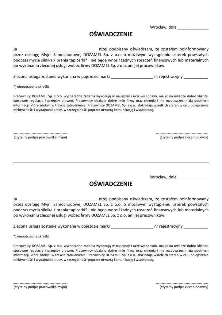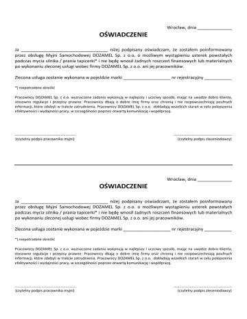 Wrocław, dnia ______________ OŚWIADCZENIE Ja ___________________________________ niżej podpisany oświadczam, że zostałem poinformowany przez obsługę Myjni Samochodowej DOZAMEL Sp. z o.o. o możliwym wystąpieniu usterek powstałych podczas mycia silnika / prania tapicerki* i nie będę wnosił żadnych roszczeń finansowych lub materialnych po wykonaniu zleconej usługi wobec firmy DOZAMEL Sp. z o.o. ani jej pracowników. Zlecona usługa zostanie wykonana w pojeździe marki ___________________ nr rejestracyjny ___________ *) niepotrzebne skreślić Pracownicy DOZAMEL Sp. z o.o. wyznaczone zadania wykonują w najlepszy i uczciwy sposób, mając na uwadze dobro klienta, stosowne regulacje i przepisy prawne. Pracownicy dbają o dobre imię firmy oraz chronią i nie rozpowszechniają poufnych informacji, które zdobyli w trakcie zatrudnienia. Pracownicy DOZAMEL Sp. z o.o. dokładają wszelkich starań w celu polepszenia efektywności i wydajności pracy, w szczególności poprzez otwartą komunikację i współpracę. ………………………………………………………. (czytelny podpis pracownika myjni) …….……………………………………………… (czytelny podpis zleceniodawcy) Wrocław, dnia ______________ OŚWIADCZENIE Ja ___________________________________ niżej podpisany oświadczam, że zostałem poinformowany przez obsługę Myjni Samochodowej DOZAMEL Sp. z o.o. o możliwym wystąpieniu usterek powstałych podczas mycia silnika / prania tapicerki* i nie będę wnosił żadnych roszczeń finansowych lub materialnych po wykonaniu zleconej usługi wobec firmy DOZAMEL Sp. z o.o. ani jej pracowników. Zlecona usługa zostanie wykonana w pojeździe marki ___________________ nr rejestracyjny ___________ *) niepotrzebne skreślić Pracownicy DOZAMEL Sp. z o.o. wyznaczone zadania wykonują w najlepszy i uczciwy sposób, mając na uwadze dobro klienta, stosowne regulacje i przepisy prawne. Pracownicy dbają o dobre imię firmy oraz chronią i nie rozpowszechniają poufnych informacji, które zdobyli w trakcie zatrudnienia. Pracownicy DOZAMEL Sp. z o.o. dokładają wszelkich starań w celu polepszenia efektywności i wydajności pracy, w szczególności poprzez otwartą komunikację i współpracę. ………………………………………………………. (czytelny podpis pracownika myjni) …….……………………………………………… (czytelny podpis zleceniodawcy)