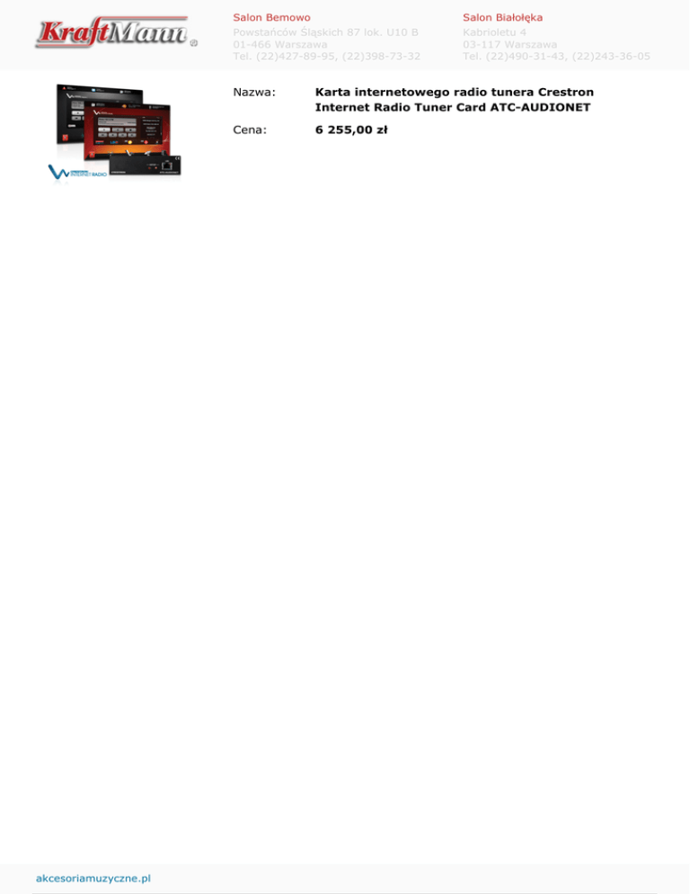 akcesoriamuzyczne.pl Salon Bemowo Salon Białołęka Powstańców Śląskich 87 lok. U10 B 01-466 Warszawa Tel. (22)427-89-95, (22)398-73-32 Kabrioletu 4 03-117 Warszawa Tel. (22)490-31-43, (22)243-36-05 Nazwa: Karta internetowego radio tunera Crestron Internet Radio Tuner Card ATC-AUDIONET Cena: 6 255,00 zł