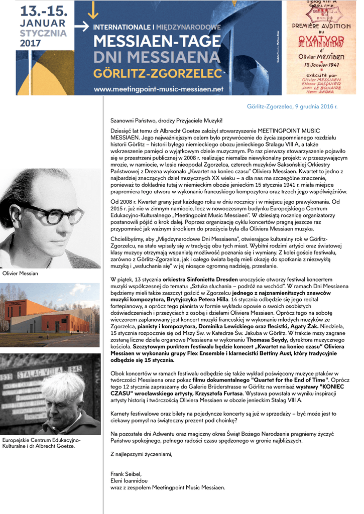 Görlitz-Zgorzelec, 9 grudnia 2016 r. Szanowni Państwo, drodzy Przyjaciele Muzyki! Dziesięć lat temu dr Albrecht Goetze założył stowarzyszenie MEETINGPOINT MUSIC MESSIAEN. Jego najważniejszym celem było przywrócenie do życia zapomnianego rozdziału historii Görlitz – historii byłego niemieckiego obozu jenieckiego Stalagu VIII A, a także wskrzeszenie pamięci o wyjątkowym dziele muzycznym. Po raz pierwszy stowarzyszenie pojawiło się w przestrzeni publicznej w 2008 r. realizując niemalże niewykonalny projekt: w przeszywającym mrozie, w namiocie, w lesie nieopodal Zgorzelca, czterech muzyków Saksońskiej Orkiestry Państwowej z Drezna wykonało „Kwartet na koniec czasu” Oliviera Messiaen. Kwartet to jedno z najbardziej znaczących dzieł muzycznych XX wieku – a dla nas ma szczególne znaczenie, ponieważ to dokładnie tutaj w niemieckim obozie jenieckim 15 stycznia 1941 r. miała miejsce prapremiera tego utworu w wykonaniu francuskiego kompozytora oraz trzech jego współwięźniów. Od 2008 r. Kwartet grany jest każdego roku w dniu rocznicy i w miejscu jego prawykonania. Od 2015 r. już nie w zimnym namiocie, lecz w nowoczesnym budynku Europejskiego Centrum Edukacyjno-Kulturalnego „Meetingpoint Music Messiaen”. W dziesiątą rocznicę organizatorzy postanowili pójść o krok dalej. Poprzez organizację cyklu koncertów pragną jeszcze raz przypomnieć jak ważnym środkiem do przeżycia była dla Oliviera Messiaen muzyka. Chcielibyśmy, aby „Międzynarodowe Dni Messiaena”, otwierające kulturalny rok w GörlitzZgorzelcu, na stałe wpisały się w tradycję obu tych miast. Wybitni rodzimi artyści oraz światowej klasy muzycy otrzymają wspaniałą możliwość poznania się i wymiany. Z kolei goście festiwalu, zarówno z Görlitz-Zgorzelca, jak i całego świata będą mieli okazję do spotkania z niezwykłą muzyką i „wsłuchania się” w jej niosące ogromną nadzieję, przesłanie. Olivier Messian W piątek, 13 stycznia orkiestra Sinfonietta Dresden uroczyście otworzy festiwal koncertem muzyki współczesnej do tematu: „Sztuka słuchania – podróż na wschód”. W ramach Dni Messiaena będziemy mieli także zaszczyt gościć w Zgorzelcu jednego z najznamienitszych znawców muzyki kompozytora, Brytyjczyka Petera Hilla. 14 stycznia odbędzie się jego recital fortepianowy, a oprócz tego pianista w formie wykładu opowie o swoich osobistych doświadczeniach i przeżyciach z osobą i dziełami Oliviera Messiaen. Oprócz tego na sobotę wieczorem zaplanowany jest koncert muzyki francuskiej w wykonaniu młodych muzyków ze Zgorzelca, pianisty i kompozytora, Dominika Lewickiego oraz flecistki, Agaty Żak. Niedziela, 15 stycznia rozpocznie się od Mszy Św. w Katedrze Św. Jakuba w Görlitz. W trakcie mszy zagrane zostaną liczne dzieła organowe Messiaena w wykonaniu Thomasa Seydy, dyrektora muzycznego kościoła. Szczytowym punktem festiwalu będzie koncert „Kwartet na koniec czasu” Oliviera Messiaen w wykonaniu grupy Flex Ensemble i klarnecistki Bettiny Aust, który tradycyjnie odbędzie się 15 stycznia. Obok koncertów w ramach festiwalu odbędzie się także wykład poświęcony muzyce ptaków w twórczości Messiaena oraz pokaz filmu dokumentalnego "Quartet for the End of Time". Oprócz tego 12 stycznia zapraszamy do Galerie Brüderstrasse w Görlitz na wernisaż wystawy "KONIEC CZASU" wrocławskiego artysty, Krzysztofa Furtasa. Wystawa powstała w wyniku inspiracji artysty historią i twórczością Oliviera Messiaen w obozie jenieckim Stalag VIII A. Karnety festiwalowe oraz bilety na pojedyncze koncerty są już w sprzedaży – być może jest to ciekawy pomysł na świąteczny prezent pod choinkę? Europejskie Centrum EdukacyjnoKulturalne i dr Albrecht Goetze. Na pozostałe dni Adwentu oraz magiczny okres Świąt Bożego Narodzenia pragniemy życzyć Państwu spokojnego, pełnego radości czasu spędzonego w gronie najbliższych. Z najlepszymi życzeniami, Frank Seibel, Eleni Ioannidou wraz z zespołem Meetingpoint Music Messiaen. Jedna z rzeźb Matthiasa Beiera, znajdująca się na terenie Stalagu VIII A, powstała w wyniku inspiracji artysty Kwartetem Messiaena. Międzynarodowe Dni Messiaena w Görlitz-Zgorzelcu 13 – 15 stycznia 2017 r. Europejskie Centrum Edukacyjno-Kulturalne, Koźlice 1, 59-900 Zgorzelec (Stalag VIII A) Ceny biletów: Karnet festiwalowy: 90 zł (wstęp wolny na wszystkie wydarzenia + program) Ceny dla grup szkolnych prosimy uzgadniać indywidualnie. Pojedyncze koncerty: bilet cały PS: 40 zł |KW: 45 zł bilet ulgowy PS: 20 zł | KW: 25 zł bilet szkolny PS: 10 zł | KW: 15 zł PS – przedsprzedaż | KW – kasa wieczorna * ulga dla emerytów, rencistów, osób niepełnosprawnych i bezrobotnych PRZEDSPRZEDAŻ: MIEJSKI DOM KULTURY. ul. Parkowa 1 , Zgorzelec MEETINGPOINT MUSIC MESSIAEN e.V. | Demianiplatz 40, Görlitz Touristbüro i-vent | Obermarkt 33, Görlitz Görlitz-Information | Obermarkt 32, Görlitz SZ – Ticketservice | An der Frauenkirche 12, Görlitz KASA WIECZORNA: Europejskie Centrum Edukacyjno-Kulturalne| Koźlice 1, Zgorzelec Więcej informacji oraz rezerwacje biletów: tel.: +49 (0) 3581 661 269, e-mail: [email protected] www.festival-music-messiaen.net AUTOBUS (8 zł): odjazd z Demianiplatz, Görlitz do Europejskiego Centrum w Zgorzelcu (oraz z powrotem). Autobus zatrzymuje się na wszystkich przystankach w kierunku Centrum. Osoby zainteresowane prosimy o wcześniejszą rezerwację. Organizator: Podmioty wspierające i partnerzy: Pozostałe wydarzenia 15.01.2017: godz. 10.00: Msza Św. w Katedrze Św. Jakuba w Görlitz z Thomasem Seydą (zabrzmią dzieła organowe Messiaena) godz. 11.00: "Głosy ptaków w muzyce Messiaena" wykład ornitologa Friedharda Förstera w Muzeum Przyrodniczym Senckenberg w Görlitz godz. 16.00: Pokaz filmu krótkometrażowego „Quartet for the End of Time“ Paula Moona.