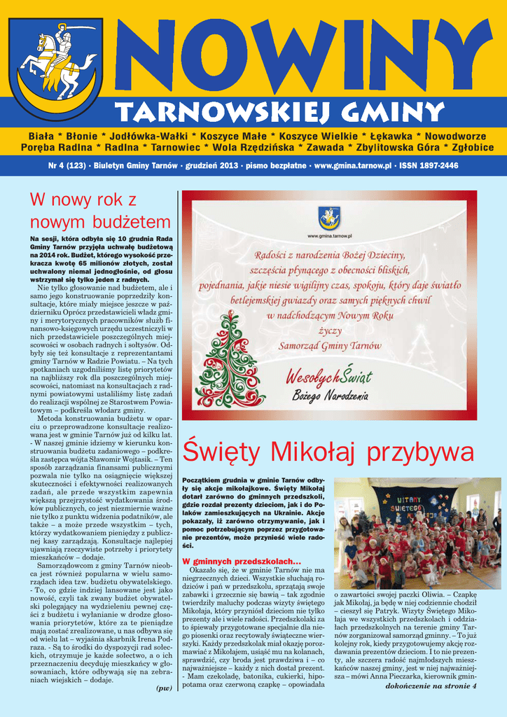 Nr 4 (123) • Biuletyn Gminy Tarnów • grudzieñ 2013 • pismo bezp³atne • www.gmina.tarnow.pl • ISSN 1897-2446 W nowy rok z nowym bud¿etem Na sesji, która odby³a siê 10 grudnia Rada Gminy Tarnów przyjê³a uchwa³ê bud¿etow¹ na 2014 rok. Bud¿et, którego wysokoœæ przekracza kwotê 65 milionów z³otych, zosta³ uchwalony niemal jednog³oœnie, od g³osu wstrzyma³ siê tylko jeden z radnych. Nie tylko głosowanie nad budżetem, ale i samo jego konstruowanie poprzedziły konsultacje, które miały miejsce jeszcze w październiku Oprócz przedstawicieli władz gminy i merytorycznych pracowników służb finansowo-księgowych urzędu uczestniczyli w nich przedstawiciele poszczególnych miejscowości w osobach radnych i sołtysów. Odbyły się też konsultacje z reprezentantami gminy Tarnów w Radzie Powiatu. – Na tych spotkaniach uzgodniliśmy listę priorytetów na najbliższy rok dla poszczególnych miejscowości, natomiast na konsultacjach z radnymi powiatowymi ustaliliśmy listę zadań do realizacji wspólnej ze Starostwem Powiatowym – podkreśla włodarz gminy. Metoda konstruowania budżetu w oparciu o przeprowadzone konsultacje realizowana jest w gminie Tarnów już od kilku lat. - W naszej gminie idziemy w kierunku konstruowania budżetu zadaniowego – podkreśla zastępca wójta Sławomir Wojtasik. – Ten sposób zarządzania finansami publicznymi pozwala nie tylko na osiągnięcie większej skuteczności i efektywności realizowanych zadań, ale przede wszystkim zapewnia większą przejrzystość wydatkowania środków publicznych, co jest niezmiernie ważne nie tylko z punktu widzenia podatników, ale także – a może przede wszystkim – tych, którzy wydatkowaniem pieniędzy z publicznej kasy zarządzają. Konsultacje najlepiej ujawniają rzeczywiste potrzeby i priorytety mieszkańców – dodaje. Samorządowcom z gminy Tarnów nieobca jest również popularna w wielu samorządach idea tzw. budżetu obywatelskiego. - To, co gdzie indziej lansowane jest jako nowość, czyli tak zwany budżet obywatelski polegający na wydzieleniu pewnej części z budżetu i wyłanianie w drodze głosowania priorytetów, które za te pieniądze mają zostać zrealizowane, u nas odbywa się od wielu lat – wyjaśnia skarbnik Irena Podraza. - Są to środki do dyspozycji rad sołeckich, otrzymuje je każde sołectwo, a o ich przeznaczeniu decyduję mieszkańcy w głosowaniach, które odbywają się na zebraniach wiejskich – dodaje. NOWINY TARNOWSKIEJ GMINY (pw) Œwiêty Miko³aj przybywa Pocz¹tkiem grudnia w gminie Tarnów odby³y siê akcje miko³ajkowe. Œwiêty Miko³aj dotar³ zarówno do gminnych przedszkoli, gdzie rozda³ prezenty dzieciom, jak i do Polaków zamieszkuj¹cych na Ukrainie. Akcje pokaza³y, i¿ zarówno otrzymywanie, jak i pomoc potrzebuj¹cym poprzez przygotowanie prezentów, mo¿e przynieœæ wiele radoœci. W gminnych przedszkolach… Okazało się, że w gminie Tarnów nie ma niegrzecznych dzieci. Wszystkie słuchają rodziców i pań w przedszkolu, sprzątają swoje zabawki i grzecznie się bawią – tak zgodnie twierdziły maluchy podczas wizyty świętego Mikołaja, który przyniósł dzieciom nie tylko prezenty ale i wiele radości. Przedszkolaki za to śpiewały przygotowane specjalnie dla niego piosenki oraz recytowały świąteczne wierszyki. Każdy przedszkolak miał okazję porozmawiać z Mikołajem, usiąść mu na kolanach, sprawdzić, czy broda jest prawdziwa i – co najważniejsze – każdy z nich dostał prezent. - Mam czekoladę, batonika, cukierki, hipopotama oraz czerwoną czapkę – opowiadała o zawartości swojej paczki Oliwia. – Czapkę jak Mikołaj, ja będę w niej codziennie chodził – cieszył się Patryk. Wizyty Świętego Mikołaja we wszystkich przedszkolach i oddziałach przedszkolnych na terenie gminy Tarnów zorganizował samorząd gminny. – To już kolejny rok, kiedy przygotowujemy akcję rozdawania prezentów dzieciom. I to nie prezenty, ale szczera radość najmłodszych mieszkańców naszej gminy, jest w niej najważniejsza – mówi Anna Pieczarka, kierownik gmindokończenie na stronie strona 4 1 NASZE SPRAWY Gmina gotowa na œnieg Obfitych opadów śniegu możemy spodziewać się w każdej chwili – w końcu to grudzień. W gminie Tarnów jednak „zima nie zaskoczy drogowców” – zapewniają urzędnicy – jest ona już od dawna gotowa na zimę. - Mieszkańcy gminy Tarnów nie muszą obawiać się paraliżu komunikacyjnego związanego z nadciągającą zimą. Przetarg na zimowe utrzymanie dróg został rozstrzygnięty, a firmy które będą za nie odpowiedzialne mają już niezbędne doświadczenie – zapewnia zastępca wójta Sławomir Wojtasik. – Wszelkie zaistniałe problemy z odśnieżaniem gminnych dróg prosimy zgłaszać bezpośrednio do firm, miejscowych sołtysów lub do gminnego Referatu Gospodarki Komunalnej – dodaje. Pracę drogowców – jak w poprzednich latach – kontrolował będzie system GPS zamontowany w odśnieżarkach i posypywarkach pracujących na terenie gminy. Nadajniki zapewnią stały monitoring pracy sprzętu. Oni odœnie¿¹ nasze drogi: • Jodłówka Wałki, Wola Rzędzińska I, II: Partyka Marian, Partyka Krzysztof Zakład Handlowy-Usługowo-Produkcyjny „TADEX”, Wola Rzędzińska 252 • Tarnowiec, Nowodworze: Firma Transportowo-Usługowo-Handlowa „TRAX” Stanisław Szuba, ul. Poprzeczna 3/18, 33-112 Tarnowiec • Łękawka: Firma Transportowo-Handlowa Marek Nowak, Łękawka 18, 33-112 Tarnowiec • Poręba Radlna, Radlna: FIRMA HANDLOWO-USŁUGOWA „ZBYSZKO” Zbigniew Ciurej, Poręba Radlna 61A/1, 33-112 Tarnowiec • Koszyce Wielkie, Koszyce Małe: Piotr Łazarek „LAS-BUD”, Lubinka 92, 33-115 Janowice • Błonie, Zgłobice: Kuczera Sławomir Firma Usługowo-Transportowa, Koszyce Małe, ul. Polna 10, 33-111 Koszyce Wielkie • Biała: Popiel Roman „TRANSROM”, Koszyce Małe, ul. Skalna 6, 33-111 Koszyce Wielkie • Zbylitowska Góra: M