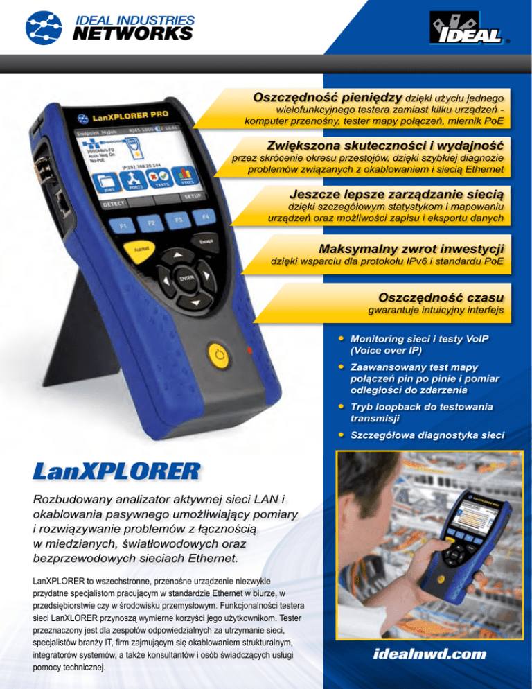 Oszczędność pieniędzy dzięki użyciu jednego wielofunkcyjnego testera zamiast kilku urządzeń komputer przenośny, tester mapy połączeń, miernik PoE Zwiększona skuteczności i wydajność przez skrócenie okresu przestojów, dzięki szybkiej diagnozie problemów związanych z okablowaniem i siecią Ethernet Jeszcze lepsze zarządzanie siecią dzięki szczegółowym statystykom i mapowaniu urządzeń oraz możliwości zapisu i eksportu danych Maksymalny zwrot inwestycji dzięki wsparciu dla protokołu IPv6 i standardu PoE Oszczędność czasu gwarantuje intuicyjny interfejs Monitoring sieci i testy VoIP (Voice over IP) Zaawansowany test mapy połączeń pin po pinie i pomiar odległości do zdarzenia Tryb loopback do testowania transmisji Szczegółowa diagnostyka sieci LanXPLORER Rozbudowany analizator aktywnej sieci LAN i okablowania pasywnego umożliwiający pomiary i rozwiązywanie problemów z łącznością w miedzianych, światłowodowych oraz bezprzewodowych sieciach Ethernet. LanXPLORER to wszechstronne, przenośne urządzenie niezwykle przydatne specjalistom pracującym w standardzie Ethernet w biurze, w przedsiębiorstwie czy w środowisku przemysłowym. Funkcjonalności testera sieci LanXLORER przynoszą wymierne korzyści jego użytkownikom. Tester przeznaczony jest dla zespołów odpowiedzialnych za utrzymanie sieci, specjalistów branży IT, firm zajmującym się okablowaniem strukturalnym, integratorów systemów, a także konsultantów i osób świadczących usługi pomocy technicznej. idealnwd.com LanXPLORER Jedno przenośne urządzenie do testowania okablowania miedzianego, światłowodowego i połączenia bezprzewodowego Wi-Fi LanXPLORER umożliwia specjalistom z branży IT wykonywanie serii testów bez konieczności korzystania z przenośnego komputera, testera mapy połączeń czy miernik PoE+ Funkcjonalności testera LanXPLORER Funkcje umożliwiające rozwiązywanie problemów z łącznością dla urządzeń, które nie są w stanie uzyskać dostępu do sieci LAN Badanie problemów niskiego poziomu sieci Ethernet dzięki możliwości pracy testera w konfiguracji In-Line i diagnostyce błędów, których nie można wykryć przy użyciu aplikacji systemu Windows lub przełączników zarządzalnych Skanowanie sieci w poszukiwaniu punktów dostępowych Wi-Fi oraz dokładne określenie problemów włącznie ze wskazaniem nieautoryzowanych urządzeń w sieci Pomiar parametrów QoS (Quality of Service) między telefonami VoIP i siecią Pomiar zasilania PoE+, testy wydajności sieci LAN i weryfikacja połączenia z Internetem przed, w trakcie i po wprowadzaniu zmian w instalacji Wymienne gniazda RJ45 Pozwalają ograniczyć koszty i okresy przestoju dzięki możliwości wymiany zużytych gniazd RJ45 w miejscu pracy, bez konieczności wizyty testera w serwisie Zaawansowana diagnostyka sieci Ethernet Szybsza lokalizacja usterek i poprawiona ogólna wydajność dzięki dodatkowym możliwościom wyszukiwania problemów z siecią Ethernet przy użyciu statystyk sieci i funkcjonalności mapowania sieci Tryb Loopback Możliwość użycia analizatora LanXPLORER wraz z testerem transmisji w celu sprawdzenia przepustowości sieci Ethernet do 1 Gb/s Testowanie mapy połączeń pin po pinie i para po parze Szybko i dokładnie lokalizuje błędy mapy połączeń dzięki możliwości pomiaru pojedynczej żyły kabla. Wykrycie błędnego rozszycia i odległości do przerwy w kablu nigdy dotąd nie było tak łatwe Raportowanie wyników pomiarów Generowane i zapisywane w standardowym formacie XML wyniki pomiarów w testerze LanXPLORER umożliwiają tworzenie uproszczonych raportów klienckich lub dokładnej dokumentacji zadaniowej Obsługa protokołu IPv6 i specyfikacji PoE+ Kompatybilność testera LanXPLORER z protokołem IPv4 i IPv6, a także obsługa specyfikacji POE+ czyni go dobrą inwestycją w przyszłość LanXPLORER Obsługa wszystkich modeli testera LanXPLORER jest niezwykle intuicyjna dzięki ikonom wyświetlanym na czytelnym, kolorowym wyświetlaczu Gniazda dla miedzi, światłowodu i WiFi Gniazdo na wymienne moduły światłowodowe Jedno urządzenie umożliwia przeprowadzenie testów wielu typów sieci Wymienne gniazda RJ45 Gniazdo USB i pamięć wewnętrzna Pamięć wewnętrzna Raporty klienckie wygenerowane i zapisane w pamięci testera łatwo wyeksportujesz do pendrive USB Podświetlany ekran Wymienne gniazdo RJ-45 Oferuje łatwą obsługę menu testera a jego wysoka rozdzielczość umożliwia łatwą interpretację wyników graficznych Tester nie wymaga wizyty w serwisie z powodu uszkodzonego gniazda Wirtualna klawiatura Wirtualna klawiatura Funkcja Autotest Autotest Wytrzymała obudowa Solidna gumowa obudowa Ergonomiczna obudowa pokryta gumą jest bezpieczna i pewnie leży w dłoni Zasilanie Test In-Line Tester może pracować na wymiennych akumulatorkach, zasilaniu sieciowym lub na zwykłych bateriach Duży kolorowy wyświetlacz Intuicyjny interfejs gwarantuje łatwą obsługę menu testera i efektywność pracy na odpowiednim poziomie Klawisze funkcyjne Zaprogramowane zestawy testów umożliwiają szybkie i łatwe operacje Trzy możliwości zasilania Klawisze wielofunkcyjne oraz nawigacyjne Klawisze nawigacyjne Wydajna praca, szybkie i proste wprowadzanie danych Łatwość odczytu Łatwość nawigacji Szybkość testowania Dotykowy, kolorowy wyświetlacz o przekątnej 3½˝ Monitoring w trybie In-Line Umożliwia diagnostykę sieci i komputera w konfiguracji In-Line Szybsze wykrywanie usterek Wyraźne wyświetlanie błędów w okablowaniu Wskazanie ich lokalizacji Weryfikacja napraw PoE+ i IPv6 Gotowość na wszelkie wyzwania Możliwość testowania i uwierzytelniania wszystkich sieci Możliwość testowania i uwierzytelniania zasobów PoE+ LanXPLORER Specjaliści IT / Administratorzy sieci Ogromne możliwości testera LanXPLORER i wynikające z nich korzyści spotkają się z uznaniem każdego użytkownika urządzenia zarządzającego siecią LAN. LanXPLORER 