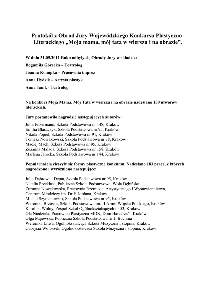 Protokół z Obrad Jury Wojewódzkiego Konkursu PlastycznoLiterackiego „Moja mama, mój tata w wierszu i na obrazie”. W dniu 31.05.2011 Roku odbyły się Obrady Jury w składzie: Bogumiła Górecka – Teatrolog Joanna Konopka – Pracownia imprez Anna Hydzik – Artysta plastyk Anna Janik - Teatrolog Na konkurs Moja Mama, Mój Tata w wierszu i na obrazie nadesłano 130 utworów literackich. Jury postanowiło nagrodzić następujących autorów: Julia Fitzermann, Szkoła Podstawowa nr 148, Kraków Emilia Błaszczyk, Szkoła Podstawowa nr 95, Kraków Nikola Popiel, Szkola Podstawowa nr 91, Kraków Tomasz Nowakowski, Szkoła Podstawowa nr 78, Kraków Maciej Mach, Szkoła Podstawowa nr 95, Kraków Zuzanna Malada, Szkoła Podstawowa nr 158, Kraków Marlena Jarocka, Szkoła Podstawowa nr 144, Kraków Popularnością cieszyły się formy plastyczne konkursu. Nadesłano 183 prace, z których nagrodzono i wyróżniono następujące: Julia Dąbrowa –Depta, Szkoła Podstawowa nr 95, Kraków Natalia Przeklasa, Publiczna Szkoła Podstawowa, Wola Dębińska Zuzanna Nowakowska, Pracownia Rzemiosła Artystycznego i Wystawiennictwa, Centrum Młodzieży im. Dr.H.Jordana, Kraków Michał Szymanowski, Szkoła Podstawowa nr 95, Kraków Weronika Brzóska, Szkoła Podstawowa im. II Armii Wojska Polskiego, Kraków Karolina Wolny, Zespół Szkół Ogólnokształcących nr 53, Kraków Ola Niedziela, Pracownia Plastyczna MDK,,Dom Harcerza’’, Kraków Olga Majewska, Publiczna Szkoła Podstawowa nr 1, Bochnia Weronika Litwa, Ogólnokształcąca Szkoła Muzyczna I stopnia, Kraków Gabrysia Woloszek, Ogólnokształcąca Szkoła Muzyczna I stopnia, Kraków