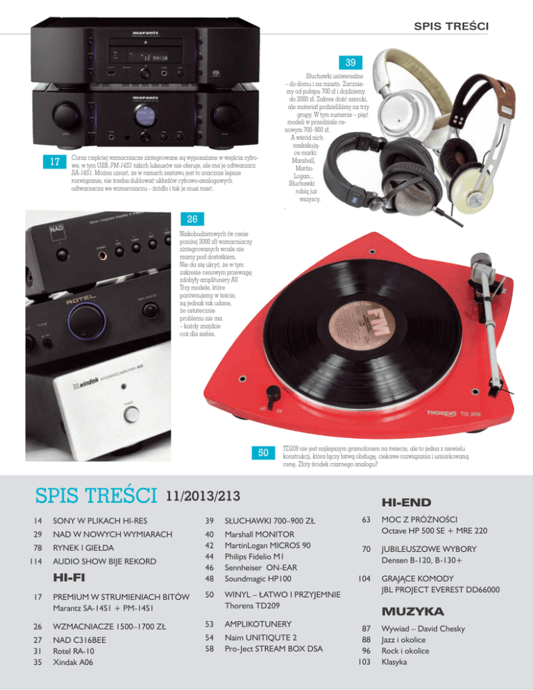 SPIS TRECI 39 17 Suchawki uniwersalne – do domu i na miasto. Zaczniemy od puapu 700 z i dojdziemy do 2000 z. Zakres do szeroki, ale materia podzielilimy na trzy grupy. W tym numerze – pi modeli w przedziale cenowym 700–900 z. A wród nich zaskakujce marki: Marshall, MartinLogan... Suchawki robi ju wszyscy. . Coraz czciej wzmacniacze zintegrowane s wyposaane w wejcia cyfrowe, w tym USB. PM-14S1 takich luksusów nie oferuje, ale ma je odtwarzacz SA-14S1. Mona uzna, e w ramach zestawu jest to znacznie lepsze rozwizanie, nie trzeba dublowa ukadów cyfrowo-analogowych odtwarzacza we wzmacniaczu – ródo i tak je musi mie. 26 Niskobudetowych (w cenie poniej 2000 z) wzmacniaczy zintegrowanych wcale nie mamy pod dostatkiem. Nie da si ukry, e w tym zakresie cenowym przewag zdobyy amplitunery AV. Trzy modele, które porównujemy w tecie, s jednak tak udane, e ostatecznie problemu nie ma – kady znajdzie co dla siebie. 50 SPIS TRECI TD209 nie jest najlepszym gramofonem na wiecie, ale to jedna z niewielu konstrukcji, która czy atw obsug, ciekawe rozwizania i umiarkowan cen. Zoty rodek czarnego analogu? 11/2013/213 14 SONY W PLIKACH HI-RES 39 SŁUCHAWKI 700–900 ZŁ 29 NAD W NOWYCH WYMIARACH 78 RYNEK I GIEŁDA 40 42 44 46 48 Marshall MONITOR MartinLogan MICROS 90 Philips Fidelio M1 Sennheiser ON-EAR Soundmagic HP100 PREMIUM W STRUMIENIACH BITÓW Marantz SA-14S1 + PM-14S1 50 WINYL – ŁATWO I PRZYJEMNIE Thorens TD209 WZMACNIACZE 1500–1700 ZŁ 53 AMPLIKOTUNERY NAD C316BEE Rotel RA-10 Xindak A06 54 58 Naim UNITIQUTE 2 Pro-Ject STREAM BOX DSA 114 AUDIO SHOW BIJE REKORD HI-FI 17 26 27 31 35 HI-END 63 MOC Z PRÓŻNOŚCI Octave HP 500 SE + MRE 220 70 JUBILEUSZOWE WYBORY Densen B-120, B-130+ 104 GRAJĄCE KOMODY JBL PROJECT EVEREST DD66000 MUZYKA 87 88 96 103 Wywiad – David Chesky Jazz i okolice Rock i okolice Klasyka
