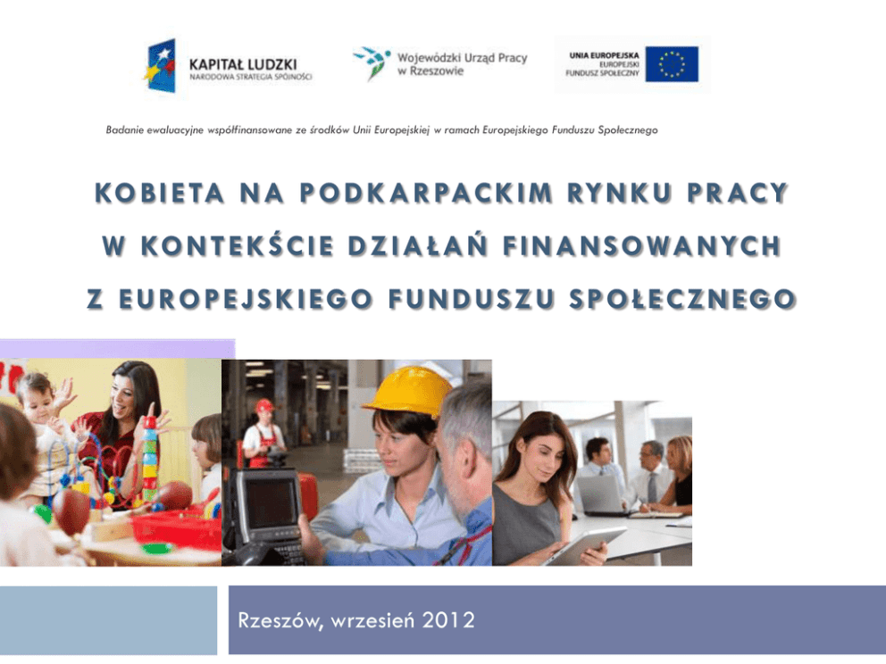 Badanie ewaluacyjne współfinansowane ze środków Unii Europejskiej w ramach Europejskiego Funduszu Społecznego KO B I E TA N A P O D K A R PAC K I M RY N K U P R AC Y W KO N T E K Ś C I E D Z I A Ł A Ń F I N A N S O WA N YC H Z E U RO P E J S K I E G O F U N D U S Z U S P O Ł E C Z N E G O Rzeszów, wrzesień 2012 Plan prezentacji 2 1. Cele badania 2. Metodologia badania 3. Czynniki mające wpływ na sytuacje kobiet na podkarpackim rynku pracy 4. Uczestnictwo w projektach współfinansowanych z EFS w województwie podkarpackim 5. Ocena form wsparcia 6. Rekomendacje Cel główny i cele szczegółowe badania: 3 Kompleksowa analiza sytuacji K i M na regionalnym rynku pracy oraz zidentyfikowanie ewentualnych nierówności, na które powinna być zwrócona uwaga w trakcie wdrażania komponentu regionalnego PO KL. Diagnoza poziomu nierówności pomiędzy K i M na rynku pracy Identyfikacja problemów w realizacji zasady równych szans K i M oraz dobrych praktyk Analiza wpływu PO KL na sytuacje kobiet na rynku pracy Rekomendacja działań służących wyrównywaniu szans i zapobiegających dyskryminacji Metodologia badania 4 Metody i techniki badawcze Źródła danych / opis respondentów Analiza danych zastanych Dokumenty programowe, strategiczne, raporty istotne z punktu widzenia celów badania, macierze danych Wywiady CATI Osoby objęte wsparciem projektowym Indywidualne wywiady pogłębione IDI Kobiety uczestniczące w projektach Pracownicy WUP w Rzeszowie – IP PO KL w regionie Próba badawcza 1100 osób 93 wywiady 5 wywiadów Triady Pracodawcy realizujący projekty w ramach Priorytetu VIII Zogniskowane wywiady grupowe Podmioty realizujące projekty w ramach PO KL Panel ekspertów Instytucje pracodawców, centrale związkowe, organizacje pozarządowe, instytucje oświatowe, uczelnie wyższe, podmioty realizujące projekty 3 panele ekspertów Studia przypadków Kobiety – dobre przykłady wpływu udziału w projekcie na życie jego uczestniczek. 10 case study 3 triady 3 FGI 5 Badanie potwierdziło istotnie gorszą sytuację kobiet na podkarpackim rynku pracy w porównaniu do sytuacji mężczyzn. Wskazują na to zarówno widoczne dysproporcje między osobami kobietami i mężczyznami pod względem aktywności zawodowej, wskaźników zatrudnienia, odsetka osób bezrobotnych czy długości pozostawania bez pracy. Wykres 1. Wskaźniki aktywności zawodowej w II kwartale 2011 r. (%) według płci w województwie podkarpackim 13,4 kobiety 43 49,6 11,1 mężczyźni 57,3 stopa bezrobocia 64,5 wskaźnik zatrudnienia współczynnik aktywności zawodowej 12,2 ogółem 49,9 56,8 0 20 40 60 80 Czynniki mające wpływ na sytuację kobiet na rynku pracy województwa podkarpackiego 6 Wiek Długość pozostawania bez pracy Miejsce zamieszkania Sytuacja rodzinna (dzieci, osoba zależna) Poziom wykształcenia Długość stażu zawodowego lub jego brak Zawód/ profil zawodowy Wiek - najwyższy udział młodych kobiet wśród bezrobotnych 25-34 lat (61%), 35-44 lat (59%) i 18-24 lat (55%). Mężczyźni dominowali jedynie wśród bezrobotnych po 55 roku życia. Podkarpackie charakteryzuje się dość niskim udziałem bezrobotnych kobiet w wieku 50+ Miejsce zamieszkania -wysoki odsetek bezrobotnych kobiet zamieszkałych na wsi Wyższy niż średnia dla Polski udział bezrobotnych mieszkanek Podkarpacia wśród kobiet które posiadają kwalifikacje zawodowe Zawód - struktura bezrobocia według zawodów w województwie podkarpackim pokazuje, że 15 najliczniej reprezentowanych grup zawodowych to profesje, w których większość bezrobotnych stanowią kobiety Długość stażu zawodowego - kobiety znacznie częściej niż mężczyźni nie posiadają żadnego stażu zawodowego. Średni czas pozostawania bez pracy wyniósł dla kobiet 10,4 miesiąca, podczas gdy dla mężczyzn wskaźnik ten był równy 8,9 miesiąca. Czynniki utrudniające sytuację kobiet na rynku pracy 7 Problemy z godzeniem życia rodzinnego z zawodowym, związane z posiadaniem dzieci, opieką nad osobami zależnymi, podziałem ról i obowiązków w rodzinie, z czego wynika ograniczona dyspozycyjność do pracy w systemie zmianowym, w weekendy czy w godzinach nocnych jak również do udziału w różnego rodzaju kursach przekwalifikowujących, zdobycia doświadczenia Brak możliwości (instytucjonalnych lub finansowych) zapewnienie opieki nad dziećmi i osobami zależnymi Czynniki utrudniające sytuację kobiet na rynku pracy – c.d. 8 Rzadkie wykorzystywanie przez pracodawców elastycznego czasu pracy czy elastycznych form zatrudnienia (brak możliwości skrócenie czasu pracy, praca w niepełnym wymiarze, możliwości telepracy itp.) Brak umiejętności i wiedzy aktualnie wymaganych na rynku pracy, struktura wykształcenia niedopasowana do potrzeb rynku pracy – brak popytu na absolwentów niektórych kierunków czy zawodów Długi pobyt poza rynkiem pracy - dezaktualizacja kwalifikacji, brak ciągłości kontaktu z branżą Czynniki utrudniające sytuację kobiet na rynku pracy – c.d. 9 Bariery mentalne i stereotypy panujące wśród pracodawców dotyczące kobiet Rynek pracy „nieprzyjazny kobietom” (inne oczekiwania względem pracy i umów – kobiety poszukują pracy etatowej, zapewniającej im stabilność i trwałość zatrudnienia) W przypadku kobiet zamieszkujących obszary wiejskie dodatkowo: Trudności komunikacyjne - dojazd do pracy, w poszukiwaniu pracy (rozmowy kwalifikacyjne), szkolenia czy kursy – wysokie koszty, długi czas dojazdu, trudności z korzystnymi połączeniami komunikacja publiczną - kobiety mieszkające na wsi rzadziej niż mężczyźni posiadają prawo jazdy. Bariery mentalne – postrzeganie pracy w gospodarstwie jako zajęcia bardziej stabilnego niż praca etatowa Trudności z utrzymaniem dobrze prosperującej działalności gospodarczej na terenach wiejskich, co skutkuje niższym poziomem zainteresowania ewentualnym rozpoczęciem działalności gospodarczej Czynniki wpływające na poprawę s