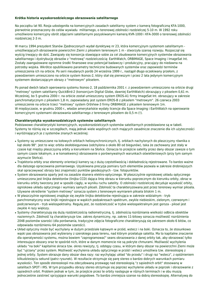 Krótka historia wysokorozdzielczego obrazowania satelitarnego Na początku lat 90. Rosja udostępniła na komercyjnych zasadach satelitarny system z kamerą fotograficzną KFA-1000, pierwotnie przeznaczony do celów wywiadu militarnego, o terenowej zdolności rozdzielczej 5-10 m. W 1992 roku umożliwiono komercyjny obrót zdjęciami satelitarnymi pozyskiwanymi kamerą KVR-1000 i KFA-3000 o terenowej zdolności rozdzielczej 2-3 m. W marcu 1994 prezydent Stanów Zjednoczonych wydał dyrektywę nr 23, która komercyjnym systemom satelitarnym umożliwiających obrazowanie powierzchni Ziemi z pikselem terenowym 1 m - stworzyła szansę rozwoju. Rozpoczął się wyścig trwający do dziś. Zawiązały się konsorcja stawiające sobie za cel zbudowanie komercyjnych systemów obrazowania satelitarnego i dystrybucję obrazów z "metrową" rozdzielczością: EarthWatch, ORBIMAGE, Space Imaging i ImageSat Int. Zostały zaangażowane ogromne środki finansowe oraz potencjał badawczy i produkcyjny, pracujący do niedawna na potrzeby wojska. Wkrótce opublikowano parametry techniczne budowanych systemów oraz zapowiedzi terminów umieszczenia ich na orbicie. Po serii nieudanych porób 24 września 1999 r., nastąpił długo oczekiwany przełom, z powodzeniem umieszczono na orbicie system Ikonos-2, który stał się pierwszym i przez 2 lata jedynym komercyjnym systemem dostarczającym obrazy z "metrowym" pikselem. Po ponad dwóch latach operowania systemu Ikonos-2, 18 października 2001 r. z powodzeniem umieszczono na orbicie drugi "metrowy" system satelitarny QuickBird-2 (konsorcjum Digital Globe, dawniej EarthWatch) obrazujący z pikselem 0,61 m. Wcześniej, bo 5 grudnia 2000 r. na orbicie został umieszczony system EROS-A1 firmy ImageSat Int. obrazujący w zakresie panchromatycznym z pikselem 1,8 m, zapowiadany jest system EROS-B z pikselem "metrowym". 26 czerwca 2003 umieszczenie na orbicie trzeci "metrowy" system OrbView-3 firmy ORBIMAGE z pikselem terenowym 1m. W międzyczasie, w grudniu 2000 r., władze amerykańskie wydały licencje dla Space Imaging i EarthWatch na operowanie komercyjnymi systemami obrazowania satelitarnego z terenowym pikselem do 0,5 m (!). Charakterystyka wysokorozdzielczych systemów satelitarnych Podstawowe charakterystyki komercyjnych, wysokorozdzielczych systemów satelitarnych przedstawione są w tabeli. Systemy te różnią się w szczegółach, mają jednak wiele wspólnych cech mających zasadnicze znaczenie dla ich użyteczności i wyróżniających je z systemów znanych wcześniej: ● ● ● ● ● ● Systemy są umieszczane na kołowych orbitach heliosynchronicznych, tj. orbitach nachylonych do płaszczyzny równika o kąt około 98°. Jest to więc orbita okołobiegunowa (odchylona o około 80 od biegunów), taka że zachowany jest stały w czasie kąt między płaszczyzną orbity a kierunkiem na Słońce. Oznacza to przejście satelity przez dany obszar zawsze o tym samym czasie lokalnym, a w konsekwencji obrazowanie o porównywalnych warunkach oświetleniowych (przy tym samym azymucie Słońca). Trajektoria orbity oraz elementy orientacji kamery są z dużą częstotliwością i dokładnością rejestrowane. To bardzo ważne dla dalszego opracowania pomiarowego. Uzyskiwana precyzja pomiaru tych elementów pozwala w zakresie drobniejszych skal opracowywać obrazy bez znajomości punktów geodezyjnych - tzw. fotopunktów. System obrazowania oparty jest na zasadzie skanera elektro-optycznego. W płaszczyźnie ogniskowej układu optycznego umieszczona jest linijka detektorów (linijka CCD) dająca linię obrazu w kierunku poprzecznym do kierunku orbity, obraz w kierunku orbity tworzony jest w sposób ciągły, w wyniku ruchu satelity. O zdolności rozdzielczej decyduje wysokość orbity, ogniskowa układu optycznego i wymiary samych pikseli. Zdolność ta charakteryzowana jest przez terenowy wymiar piksela. Używane określenie "system metrowy" oznacza system z terenowym wymiarem piksela bliskim 1 m. W płaszczyźnie ogniskowej znajduje się zwykle linijka detektorów rejestrująca w zakresie widzialnym - tryb panchromatyczny oraz linijki rejestrujące w wąskich podzakresach spektrum, zwykle niebieskim, zielonym, czerwonym i podczerwonym - tryb wielospektralny. Regułą jest, że rozdzielczość w trybie wielospektralnym jest gorsza - piksel jest zwykle 4 razy większy. Systemy charakteryzują się dużą rozdzielczością radiometryczną, tj. zdolnością rozróżniania wielkości odbicia obiektów naziemnych. Zdolność tą charakteryzuje tzw. zakres dynamiczny, np. zakres 11-bitowy oznacza możliwość rozróżnienia 2048 poziomów szarości (dla porównania, tradycyjne zdjęcia fotograficzne charakteryzują się zakresem około 6 bitów, co odpowiada rozróżnieniu 64 poziomów szarości). Układ optyczny może być wychylany w dużym przedziale kątowym w przód, wstecz i na boki. Oznacza to, że stosunkowo wąski pas obrazowania jest wybierany z szerokiego pasa terenu, nad którym przelatuje satelita. Ma to kapitalne znaczenie dla operatywności systemu, można bowiem "zaprogramować" seans obrazowania z danej orbity tak, aby obrazować tylko interesujące obszary oraz te spośród nich, które w danym momencie nie są pokryte chmurami. Możliwość wychylenia układu "na boki" kapitalnie skraca tzw. okres rewizyty, tj. odstępy czasu, w którym dany obszar na powierzchni Ziemi może być "ujrzany" przez system. Możliwość wychylenia układu optycznego w przód i wstecz umożliwia tzw. stereoskopię z jednej orbity. System obrazuje dany obszar dwa razy: raz wychylając układ "do przodu" i drugi raz "wstecz", z opóźnieniem kilkudziesięciu sekund (patrz rysunek). W rezultacie otrzymuje się parę stereo o bardzo dobrych warunkach pomiaru wysokości. Ten sposób stereoskopii ma zdecydowaną przewagę nad stereoskopią "z sąsiednich orbit" stosowaną w satelitach SPOT i IRS. W tym przypadku obrazy stereo otrzymuje się poprzez wychylenie układu w 