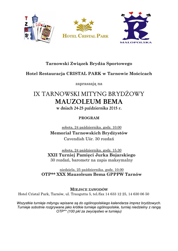Tarnowski Związek Brydża Sportowego Hotel Restauracja CRISTAL PARK w Tarnowie Mościcach zapraszają na IX TARNOWSKI MITYNG BRYDŻOWY MAUZOLEUM BEMA w dniach 24-25 października 2015 r. PROGRAM sobota, 24 października. godz. 10.00 Memoriał Tarnowskich Brydżystów Cavendish Uśr. 30 rozdań sobota, 24 października. godz. 15.30 XXII Turniej Pamięci Jurka Bojarskiego 30 rozdań, barometr na zapis maksymalny niedziela, 25 października. godz. 10.00 OTP** XXX Mauzoleum Bema GPPPW Tarnów MIEJSCE ZAWODÓW Hotel Cristal Park, Tarnów, ul. Traugutta 5, tel./fax 14 633 12 25, 14 630 06 50 Wszystkie turnieje mityngu wpisane są do ogólnopolskiego kalendarza imprez brydżowych. Turnieje sobotnie rozgrywane jako krótkie turnieje ogólnopolskie, turniej niedzielny z rangą OTP** (100 pkl za zwycięstwo w turnieju) WPISOWE sobota bez zniżek – 30 zł; czł. PZBS – 25 zł; ulgowe (sen. > 65, jun.) – 20 zł; mł.- 5 zł. niedziela bez zniżek – 50 zł + 5 zł na fundusz GPPPW; członkowie PZBS – 40 zł + 5 zł na GPPPW; ulgowe (seniorzy > 65, juniorzy) – 30 zł + 5 zł na fundusz GPPPW; młodzież szkolna – 5 zł + 5 zł na GPPPW KLASYFIKACJA DŁUGOFALOWA (podczas Mityngu prowadzona będzie indywidualna Klasyfikacja Długofalowa /PDF/) do Klasyfikacji Długofalowej zaliczają się wszystkie turnieje; w turniejach ilość przyznawanych PDF-ów równa jest – dwukrotnej liczbie startujących par z obniżką za kolejne miejsce 2 PDF – aż do wyczerpania dodatkowo za zdobycie pierwszych trzech miejsc premia 5-3-1 PDF; w przypadku lokat dzielonych w poszczególnych turniejach – pary otrzymują średnią sumy PDF przysługujących za te lokaty dodatkowo za zdobycie pierwszych trzech miejsc premia 5-3-1 PDF w przypadku lokat dzielonych w PDF w Klasyfikacji Długofalowej o wyższym miejscu decyduje większa ilość rozegranych turniejów, większa liczba PDF zdobytych w turnieju niedzielnym - gdy to nie rozstrzyga to ewentualnie losowanie NAGRODY nagrody finansowe w wysokości 60% wpisowego oraz puchary dla zwycięzców nagrody rzeczowe dla zwycięzców każdego z turniejów nagrody rzeczowe dla zdobywców pierwszych 3 miejsc w turnieju niedzielnym nagrody książkowe dla zdobywców 2 i 3 miejsca w turniejach sobotnich, puchar dla zwycięzcy punktacji długofalowej oraz nagrody rzeczowe dla 3 najlepszych zawodników Mityngu nagroda rzeczowa dla najlepszego juniora Mityngu nagroda rzeczowa dla najlepszej zawodniczki Mityngu nagroda rzeczowa dla najlepszego seniora Mityngu NOCLEGI (możliwość skorzystania z noclegów po preferencyjnej cenie – Hotel Cristal Park Tarnów) rezerwacja na hasło „Brydż” - tel./fax 14 633 12 25, 14 630 06 50 Prezentujemy sponsorów 9. Tarnowskiego Mityngu Brydżowego Pozyskaliśmy kilku sponsorów. Wszyscy są dobrze znani i lubiani bo od kilku lat wspierają największe wydarzenia brydżowe organizowane w naszym mieście. Klient w krawacie jest mniej awanturujący się czyli firma DoratoN Firma DoratoN wyposaży wszystkich panów w piękne koszule i ozdobne krawaty. Doradzi także w jaki sposób zawiązać krawat by 24 października nie tylko zachwycał, ale i wzbudzał respekt w przeciwnikach. Mada Travel czyli sprawdź czy Ci kaktus nie wyrósł albo jakoś podobnie Z firmą można się wybrać na wczasy, nawet brydżowe jeśli się Wam karty nie znudziły jeszcze. A gdzie? To już pytajcie Roberta Mostka. Kancelaria Reising, Hals-Chalcarz SP. Z O. O. w sposób prawy policzy Twoje lewy Sławek może w karty was orżnąć, ale podatek z pewnością naliczy z ulgą. Dzięki VillaVerde zaprezentujesz się tej jesieni w cieplejszym świetle. Młynki dla tych co to lubią ostro przypieprzyć i przysolić Tarnów polski biegun ciepła – tu Cię ograją w miłej atmosferze