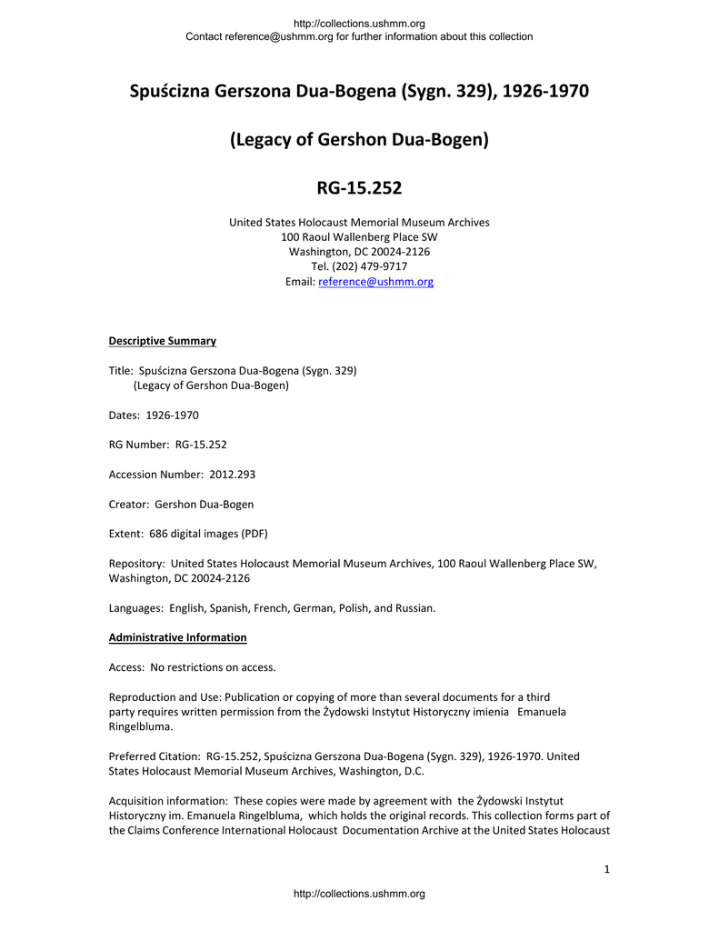 http://collections.ushmm.org Contact [email protected] for further information about this collection Spuścizna Gerszona Dua‐Bogena (Sygn. 329), 1926‐1970 (Legacy of Gershon Dua‐Bogen) RG‐15.252 United States Holocaust Memorial Museum Archives 100 Raoul Wallenberg Place SW Washington, DC 20024‐2126 Tel. (202) 479‐9717 Email: [email protected] Descriptive Summary Title: Spuścizna Gerszona Dua‐Bogena (Sygn. 329) (Legacy of Gershon Dua‐Bogen) Dates: 1926‐1970 RG Number: RG‐15.252 Accession Number: 2012.293 Creator: Gershon Dua‐Bogen Extent: 686 digital images (PDF) Repository: United States Holocaust Memorial Museum Archives, 100 Raoul Wallenberg Place SW, Washington, DC 20024‐2126 Languages: English, Spanish, French, German, Polish, and Russian. Administrative Information Access: No restrictions on access. Reproduction and Use: Publication or copying of more than several documents for a third party requires written permission from the Żydowski Instytut Historyczny imienia Emanuela Ringelbluma. Preferred Citation: RG‐15.252, Spuścizna Gerszona Dua‐Bogena (Sygn. 329), 1926‐1970. United States Holocaust Memorial Museum Archives, Washington, D.C. Acquisition information: These copies were made by agreement with the Żydowski Instytut Historyczny im. Emanuela Ringelbluma, which holds the original records. This collection forms part of the Claims Conference International Holocaust Documentation Archive at the United States Holocaust 1 http://collections.ushmm.org http://collections.ushmm.org Contact [email protected] for further information about this collection Memorial Museum. This archive consists of documentation whose reproduction and/or acquisition was made possible with funding from the Conference on Jewish Material Claims Against Germany. Custodial History: The original records are held by the Żydowski Instytut Historyczny im. Emanuela Ringelbluma, ul. Tłomackie 3/5, Warszawa, 00‐090, Poland, phone: 011 48 22 827 92 21. More information about repository can be found at www.jewishinstitute.org.pl Accruals: Accruals may have been received since this collection was first processed, see the Archives catalog at collections.ushmm.org for further information. Processing History: Aleksandra B. Borecka Biographical Note Gerszon Dua‐Bogen (1892‐1948) was a member of Poalej Syjon left party, and since 1922 he was active in the international communist movement in Poland, Palestine, USSR, USA, France, Spain and Cuba. He returned to Poland in 1947 and worked for the Polish communist party, Komitet Centralny Polskiej Partii Robotniczej (KC PPR), and then was delegated to work for the Centralny Comitet Żydow Polskich (CKŻP). He was a distinguished personage; it seemed that he would play a significant role as one of the leaders of the Faction of the Polish Labor Party (the ethnic Jewish section of that party). He perished in a car accident near Bielsk at the beginning of February 1948. Related Materials USHMM Archives, RG‐15. 251, Centralny Komitet Żydów w Polsce. Wydział Budowlany (Syg. 303/X): It contains plans for a monument to commemorate Gerszon Dua‐Bogen ( ŻIH Archives Syg. 303/X/ 33). Grabski A. Działalność Komunistów wśród Żydów w Polsce (1944‐1949). Warszawa : Wydawn. Trio : Żydowski Instytut Historyczny, 2004. s. 38. Scope and Content of Collection The collection contains the papers of Gershon Dua‐Bogen (1892‐1948), an eminent activist of the socialist and communist parties. The papers includes personal documents from Gershon Dua‐Bogen and his son, Jerzy Bogen, correspondence, notes, fragment of memoirs, press‐cuttings, invitations, photographs, an index of the Dua‐Bogen’s works, a resume, a collection of Jewish songs: Mir zingen. Lider zamlung, and miscellaneous. System of Arrangement: The system of arrangement of the source repository has been preserved on the digital files. The papers are arranged as a single series: 1. Legacy of Gershon Dua‐Bogen, 1926‐1970. Organized in 23 digital files. Indexing Terms Dua‐Bogen, Gershon, 1892‐1948. Bogen, Furma. Bogen, Jerzy, 1922‐ Wajman‐Bogen, Elżbieta. 2 http://collections.ushmm.org http://collections.ushmm.org Contact [email protected] for further information about this collection Warski, Adolf, 1868‐1937. World Socialist Union of Jewish Workers‐‐Po’alei Zion. Polska Partia Robotnicza‐‐Frakcja Żydowska‐‐History. Centralny Komitet Żydów Polskich‐‐History. Towarzystwo Społeczno‐Kulturalne Żydów w Polsce. Jewish communists‐‐Poland‐‐History‐‐20th century. Jewish authors‐‐Poland‐‐History‐‐20th century. Correspondence. Photographs. Songs. Memoirs. Clippings (Books, newspapers, etc.). Invitations. Resumes. CONTAINER LIST In Polish Note: Finding aid adapted from the original finding aid compiled in the Żydowski Instytut Historyczny im. Emanuela Ringelbluma, Poland. See also a Polish guide complied in the Żydowski Instytut Historyczny im. Emanuela Ringelbluma, by Magdalena Siek. Warszawa, 2010. Guide is in Polish and English. Documents: RG‐15.252_02; and RG‐15.252_03 See also ŻIH Archives Web Page at: http://www.jhi.pl/archiwum/zbiory archiwum 1. Dokumenty osobiste Gerszona Dua‐Bogena: odpis świadectwa urodzenia (fotokopia), życiorys, francuski dowód tożsamości1, legitymacja Związku Literatów i Dziennikarzy Żydowskich w Polsce.2 1938‐1947, rkps, druk, fot., j. franc., j. jidysz, j. pol., l., s. 17 2. Dokumenty osobiste Frimy Bogen‐ żony Gerszona Dua‐Bogena: życiorys, zaświadczenia, Relacja o Adolfie Warskim, umowa z ZUS, list od Komitetu Dzielnicowego PZPR, świadectwo o przebywaniu w lagrze sowieckim, rehabilitacja, podanie w sprawie rekompensaty za mienie utracone podczas przebywania w obozie w ZSRR, pismo adwokackie w sprawie przyznania 500 rubli, karta ambulatoryjna, legitymacja członkowska Związku Zawodowego Pracowników Medyczno‐Sanitarnych, karta pracy, legitymacja członkowska TSKŻ, wk