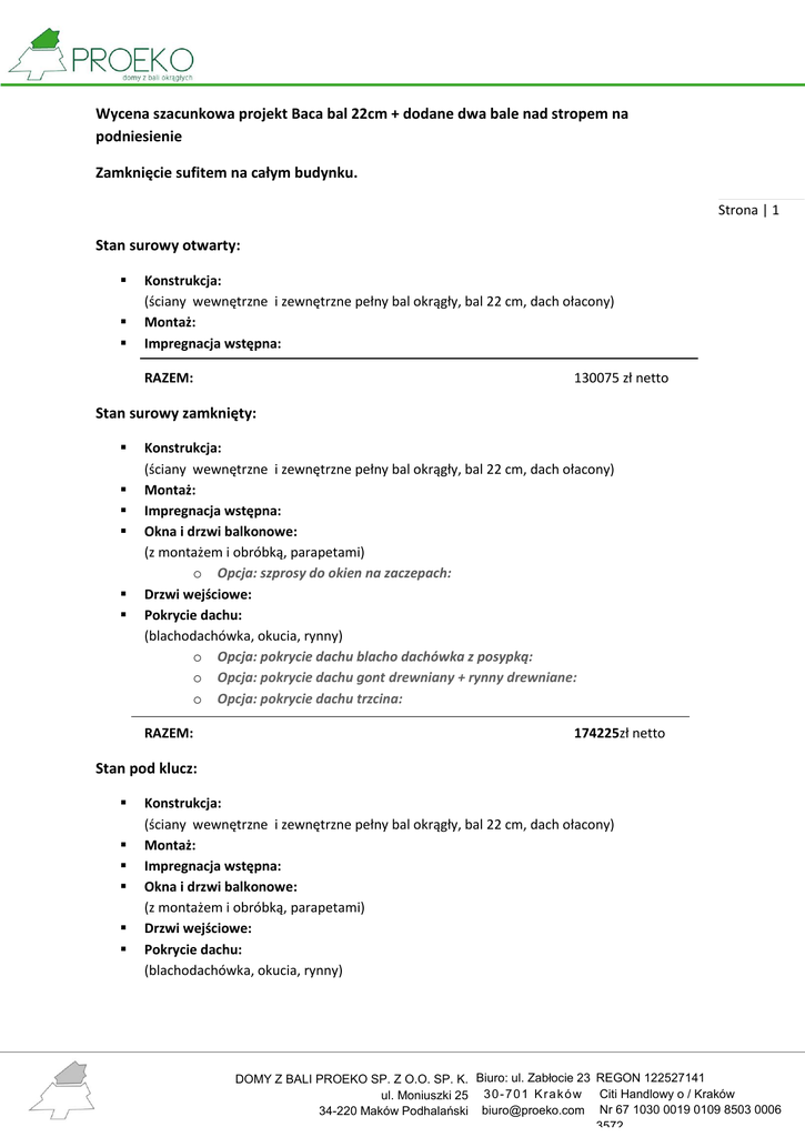 Wycena szacunkowa projekt Baca bal 22cm + dodane dwa bale nad stropem na podniesienie Zamknięcie sufitem na całym budynku. Strona | 1 Stan surowy otwarty: Konstrukcja: (ściany wewnętrzne i zewnętrzne pełny bal okrągły, bal 22 cm, dach ołacony) Montaż: Impregnacja wstępna: RAZEM: 130075 zł netto Stan surowy zamknięty: Konstrukcja: (ściany wewnętrzne i zewnętrzne pełny bal okrągły, bal 22 cm, dach ołacony) Montaż: Impregnacja wstępna: Okna i drzwi balkonowe: (z montażem i obróbką, parapetami) o Opcja: szprosy do okien na zaczepach: Drzwi wejściowe: Pokrycie dachu: (blachodachówka, okucia, rynny) o Opcja: pokrycie dachu blacho dachówka z posypką: o Opcja: pokrycie dachu gont drewniany + rynny drewniane: o Opcja: pokrycie dachu trzcina: RAZEM: 174225zł netto Stan pod klucz: Konstrukcja: (ściany wewnętrzne i zewnętrzne pełny bal okrągły, bal 22 cm, dach ołacony) Montaż: Impregnacja wstępna: Okna i drzwi balkonowe: (z montażem i obróbką, parapetami) Drzwi wejściowe: Pokrycie dachu: (blachodachówka, okucia, rynny) DOMY Z BALI PROEKO SP. Z O.O. SP. K. Biuro: ul. Zabłocie 23 REGON 122527141 ul. Moniuszki 25 3 0 - 7 0 1 K r a k ó w Citi Handlowy o / Kraków 34-220 Maków Podhalański [email protected] Nr 67 1030 0019 0109 8503 0006 3572 Drzwi wewnętrzne: (z montażem i obróbką) Komin: (0mb) Izolacja podłogi: (wełna, folie) Izolacja stropu: (wełna 20cm, folie) Odeskowanie sufit + podsibitki: Podłoga: (deska podłogowa końcowa bez cyklinowania i malowania, wylewka) Płytowanie łazienek: (obłożenie łazienek płytami regipsowymi) Wod-kan: Prąd: Ganek wejściowy z bala: RAZEM: nie ujęto Strona | 2 nie ujęto 228697 zł netto Promocja zimowa – w przypadku podpisania umowy w okresie do 31.01 - upustu Opcja bal 24cm: - dopłata do ceny końcowej Opcja bal 26cm: - dopłata do ceny końcowej Rodzaj tarasu do uzgodnienia z inwestorem. Cały dom ozdobiony jest tzw. warkoczami drewnianymi umieszczonymi pomiędzy balami, grubsze na zewnątrz oraz cieńsze wewnątrz budynku (dostępne jest kilka wzorów warkocza do wyboru). Koszty dodatkowe: (brak adresu) Transport konstrukcji na działkę inwestora: ok. 0zł według cen przewoźnika Transport materiałów: 0zł Zakwaterowanie ekipy bez wyżywienia: ok. 3 tygodnie przy budowie w stanie surowym ok. 8 tygodni przy budowie pod klucz DOMY Z BALI PROEKO SP. Z O.O. SP. K. Biuro: ul. Zabłocie 23 REGON 122527141 ul. Moniuszki 25 3 0 - 7 0 1 K r a k ó w Citi Handlowy o / Kraków 34-220 Maków Podhalański [email protected] Nr 67 1030 0019 0109 8503 0006 3572