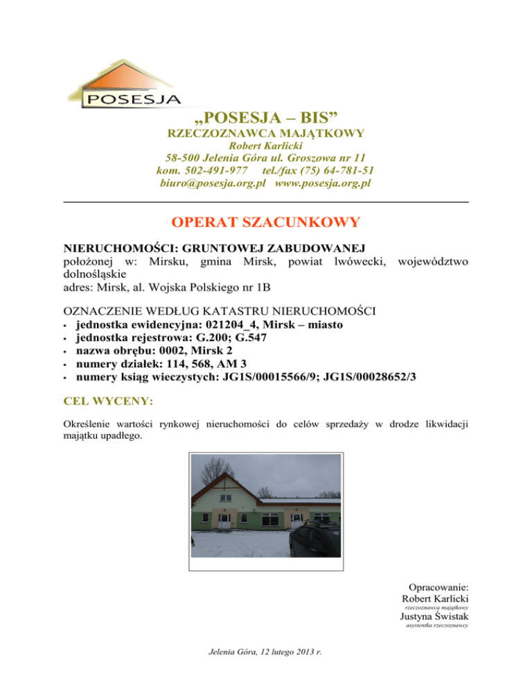 „POSESJA – BIS” RZECZOZNAWCA MAJĄTKOWY Robert Karlicki 58-500 Jelenia Góra ul. Groszowa nr 11 kom. 502-491-977 tel./fax (75) 64-781-51 [email protected] www.posesja.org.pl OPERAT SZACUNKOWY NIERUCHOMOŚCI: GRUNTOWEJ ZABUDOWANEJ położonej w: Mirsku, gmina Mirsk, powiat lwówecki, województwo dolnośląskie adres: Mirsk, al. Wojska Polskiego nr 1B OZNACZENIE WEDŁUG KATASTRU NIERUCHOMOŚCI • jednostka ewidencyjna: 021204_4, Mirsk – miasto • jednostka rejestrowa: G.200; G.547 • nazwa obrębu: 0002, Mirsk 2 • numery działek: 114, 568, AM 3 • numery ksiąg wieczystych: JG1S/00015566/9; JG1S/00028652/3 CEL WYCENY: Określenie wartości rynkowej nieruchomości do celów sprzedaży w drodze likwidacji majątku upadłego. Opracowanie: Robert Karlicki rzeczoznawca majątkowy Justyna Świstak asystentka rzeczoznawcy Jelenia Góra, 12 lutego 2013 r. Wycena działek gruntu nr 114 i 568 - al. Wojska Polskiego nr 1B, Mirsk SPIS TREŚCI * WYCIĄG Z OPERATU SZACUNKOWEGO 1. Podstawy formalno - prawne 1.1. Przedmiot wyceny 1.2. Zakres wyceny 1.3. Cel wyceny 1.4. Podstawy formalne wyceny 1.5. Podstawy prawne wyceny 1.6. Źródła informacji 1.7. Materiały pomocnicze 1.8. Określenie dat istotnych dla operatu szacunkowego 2. Dane o nieruchomości 2.1. Stan prawny 2.2. Przeznaczenie nieruchomości w miejscowym planie zagospodarowania przestrzennego 2.3. Charakterystyka nieruchomości gruntowej 2.4. Opis budynków 3. Opinia o wartości 3.1. Podstawy i metody wyceny 3.2. Przedstawienie zastosowanego sposobu wyceny 3.3. Analiza i charakterystyka rynku nieruchomości 3.4. Określenie wartości rynkowej nieruchomości metodą porównywania parami 3.5. Wartość rynkowa wycenianej nieruchomości 4. Wynik końcowy 5. Klauzula publikacji i wykorzystania Załączniki: - wgląd do księgi wieczystej - dokumentacja fotograficzna - wypis z rejestru gruntów - wyrys z mapy ewidencyjnej „Posesja-Bis” Robert Karlicki 2 Jelenia Góra, 12 lutego 2013 r. Wycena działek gruntu nr 114 i 568 - al. Wojska Polskiego nr 1B, Mirsk WYCIĄG Z OPERATU SZACUNKOWEGO 1. Położenie nieruchomości Mirsk, al. Wojska Polskiego nr 1B; gmina Mirsk, powiat lwówecki, województwo dolnośląskie 2. Oznaczenie wg katastru • jedn. ewidencyjna: 021204_4, Mirsk - miasto nieruchomości • jedn. rejestrowa: G.200; G.547 • nazwa obrębu: 0002, Mirsk - 2 • nr działki: 114, 568; AM 3 • powierzchnia działek: działka nr 114: 0,2992 ha działka nr 568: 0,3870 ha 3. Numer księgi wieczystej JG1S/00015566/9; JG1S/00028652/3 – prowadzone przez Sąd Rejonowy w Lwówku Śląskim – Wydział Ksiąg Wieczystych 4. Określenie osób, którym Prawo własności przysługują prawa do nieruchomości i rodzaj tych praw 5. Krótki opis nieruchomości (rodzaj, przeznaczenie, uzbrojenie) Nieruchomość położona w Mirsku przy al. Wojska Polskiego nr 1B, oznaczona ewidencyjnie jako działki nr 114 i 568, AM 3, obręb 0002. Działka nr 114 jest zabudowana budynkiem o funkcji usługowej z wiatą o powierzchni użytkowej 373,56 m2 oraz wiatami magazynowymi o powierzchni 218,40 m2 i 197,00 m2. Działka nr 568 jest zabudowana częścią jednej z wiat magazynowych znajdujących się na działce nr 114. Działka nr 568 „otacza” działkę nr 114 z trzech stron, przez co funkcjonalnie obie działki stanowią jedną całość. Łączna powierzchnia działek wynosi 0,6862 ha, kształty działek są zróżnicowane. Teren płaski, zagospodarowany i ogrodzony. Dojazd do nieruchomości – utwardzoną drogą publiczną. Działki są uzbrojone w sieci: energetyczną, wodociągową, kanalizacyjną i teletechniczną. Brak sieci gazowej. Według ustaleń miejscowego planu zagospodarowania przestrzennego miasta, teren wycenianej nieruchomości znajduje się w obszarze oznaczonym na rysunku planu symbolem „U2” - tereny zabudowy usługowej (projektowane). 6. Cel dokonanej wyceny Określenie wartości rynkowej nieruchomości do celów sprzedaży w drodze likwidacji majątku upadłego. 7. Wartość nieruchomości - podejście, metoda: podejście porównawcze, metodą określona w operacie porównywania parami szacunkowym - wartość prawa własności: 832.200,- zł 8. Daty • data sporządzenia operatu szacunkowego: 12.02.2013 r. • data, na którą określono wartość: 12.02.2013 r. • data, na którą określono stan nieruchomości: 12.02.2013 r. • data dokonania oględzin: 11.02.2013 r. 9. Imię i nazwisko rzeczoznawcy majątkowego, pieczęć, podpis Robert Karlicki „Posesja-Bis” Robert Karlicki 3 Jelenia Góra, 12 lutego 2013 r. Wycena działek gruntu nr 114 i 568 - al. Wojska Polskiego nr 1B, Mirsk 1. PODSTAWY FORMALNO-PRAWNE 1.1. PRZEDMIOT WYCENY Przedmiotem wyceny jest nieruchomość położona w Mirsku przy al. Wojska Polskiego nr 1B; gmina Mirsk, powiat lwówecki, województwo dolnośląskie. Nieruchomość jest oznaczona ewidencyjnie jako działki nr 114 i 568, AM 3, obręb 0002, Mirsk – 2, dla których Wydział Ksiąg Wieczystych Sądu Rejonowego w Lwówku Śląskim prowadzi księgi wieczyste nr JG1S/00015566/9 oraz JG1S/00028652/3. 1.2. ZAKRES WYCENY Wyceną jest objęte prawo własności do nieruchomości gruntowej zabudowanej budynkiem usługowym oraz wiatami magazynowymi. 1.3. CEL WYCENY Określenie wartości rynkowej nieruchomości do celów sprzedaży w drodze likwidacji majątku upadłego. 1.4. PODSTAWY FORMALNE WYCENY Podstawą formalną wykonania operatu szacunkowego jest zlecenie syndyka masy upadłościowej przedsiębiorstwa budowlano-usługowego „Izery” Sp. z o.o. z/s w Mirsku. 1.5. PODSTAWY PRAWNE WYCENY Ustawa z dnia 23 kwietnia 1964 r. Kodeks cywilny (Dz.U. Nr 16, poz. 93 ze zm.) Ustawa z dnia 28 lutego 2003 r Prawo upadłościowe i naprawcze (Dz.U. Nr 60 poz. 535 z późniejszymi zmianami) Ustawa z dnia 21 sierpnia 1997 r. o gospodarce nieruchomościami (Dz.U. z 1997 r. nr 115, poz. 741 z późniejszymi zmianami) Rozporządzenie Rady Ministrów z dnia 21 września 2004 r. w sprawie wyceny nieruchomośc