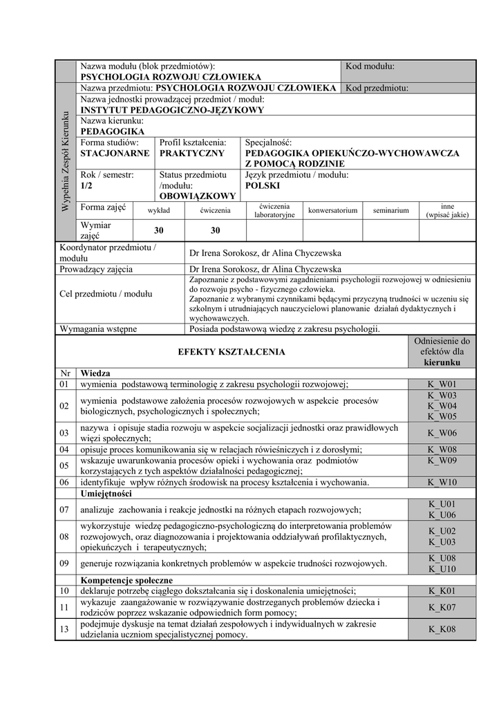 Wypełnia Zespół Kierunku Nazwa modułu (blok przedmiotów): Kod modułu: PSYCHOLOGIA ROZWOJU CZŁOWIEKA Nazwa przedmiotu: PSYCHOLOGIA ROZWOJU CZŁOWIEKA Kod przedmiotu: Nazwa jednostki prowadzącej przedmiot / moduł: INSTYTUT PEDAGOGICZNO-JĘZYKOWY Nazwa kierunku: PEDAGOGIKA Forma studiów: Profil kształcenia: Specjalność: STACJONARNE PRAKTYCZNY PEDAGOGIKA OPIEKUŃCZO-WYCHOWAWCZA Z POMOCĄ RODZINIE Rok / semestr: Status przedmiotu Język przedmiotu / modułu: /modułu: 1/2 POLSKI OBOWIĄZKOWY ćwiczenia inne Forma zajęć wykład ćwiczenia konwersatorium seminarium laboratoryjne Wymiar 30 zajęć Koordynator przedmiotu / modułu Prowadzący zajęcia Cel przedmiotu / modułu Wymagania wstępne 30 Dr Irena Sorokosz, dr Alina Chyczewska Dr Irena Sorokosz, dr Alina Chyczewska Zapoznanie z podstawowymi zagadnieniami psychologii rozwojowej w odniesieniu do rozwoju psycho - fizycznego człowieka. Zapoznanie z wybranymi czynnikami będącymi przyczyną trudności w uczeniu się szkolnym i utrudniających nauczycielowi planowanie działań dydaktycznych i wychowawczych. Posiada podstawową wiedzę z zakresu psychologii. EFEKTY KSZTAŁCENIA Nr 01 Wiedza wymienia podstawową terminologię z zakresu psychologii rozwojowej; 02 wymienia podstawowe założenia procesów rozwojowych w aspekcie procesów biologicznych, psychologicznych i społecznych; 03 04 05 06 (wpisać jakie) nazywa i opisuje stadia rozwoju w aspekcie socjalizacji jednostki oraz prawidłowych więzi społecznych; opisuje proces komunikowania się w relacjach rówieśniczych i z dorosłymi; wskazuje uwarunkowania procesów opieki i wychowania oraz podmiotów korzystających z tych aspektów działalności pedagogicznej; identyfikuje wpływ różnych środowisk na procesy kształcenia i wychowania. Umiejętności Odniesienie do efektów dla kierunku K_W01 K_W03 K_W04 K_W05 K_W06 K_W08 K_W09 K_W10 07 analizuje zachowania i reakcje jednostki na różnych etapach rozwojowych; K_U01 K_U06 08 wykorzystuje wiedzę pedagogiczno-psychologiczną do interpretowania problemów rozwojowych, oraz diagnozowania i projektowania oddziaływań profilaktycznych, opiekuńczych i terapeutycznych; K_U02 K_U03 09 generuje rozwiązania konkretnych problemów w aspekcie trudności rozwojowych. K_U08 K_U10 10 11 13 Kompetencje społeczne deklaruje potrzebę ciągłego dokształcania się i doskonalenia umiejętności; wykazuje zaangażowanie w rozwiązywanie dostrzeganych problemów dziecka i rodziców poprzez wskazanie odpowiednich form pomocy; podejmuje dyskusje na temat działań zespołowych i indywidualnych w zakresie udzielania uczniom specjalistycznej pomocy. K_K01 K_K07 K_K08 TREŚCI PROGRAMOWE Forma zajęć – WYKŁAD Wykład: Teorie rozwoju w ciągu życia (stadia rozwojowe). Okres wczesnego dzieciństwa (wiek niemowlęcy i poniemowlęcy). Okres przedszkolny - dojrzałość szkolna. Przedszkole jako środowisko wychowawcze. Rozwój fizyczny, poznawczy i emocjonalno-społeczny w młodszym wieku szkolnym (wg.J. Piageta). Rozwój fizyczny, poznawczy i społeczno – emocjonalny w starszym wieku szkolnym. Szkoła (klasa) jako środowisko wychowawcze. Okres dorastania. Charakterystyka ogólna, zmiany w sferze poznawczej, rozwój tożsamości, zachowania problemowe. Rola procesu socjalizacji w rozwoju osobowości. Specyficzne potrzeby edukacyjne (dysleksja, dysortografia i dysgrafia). Zaburzenia dynamiki procesów nerwowych - ADHD. Zaburzenia nerwicowe u dzieci i młodzieży i ich wpływ na niepowodzenia szkolne. Relacje dziecko-dorosły, kary i nagrody w procesie wychowawczym. Forma zajęć – ĆWICZENIA Ćwiczenia: Okres wczesnego dzieciństwa, jak rozpoznać zagrożenia i potencjał rozwojowy. Wiek przedszkolny uwarunkowania dojrzałości szkolnej. Młodszy wiek szkolny -rozwój społeczno – emocjonalny w aspekcie relacji z dorosłymi i rówieśnikami. Starszy wiek szkolny - charakterystyka zmiany w sferze poznawczej, rozwoju tożsamości. Okres dorastania - zachowania problemowe. Specyficzne potrzeby edukacyjne – pomoc psycho -pedagogiczna uczniom ze SPE. Zaburzenia osobowości, zaburzenia dynamiki procesów nerwowych- i ich konsekwencje w aspekcie edukacyjnym i wychowawczym. Rodzina jako środowisko wychowawcze: style wychowania w rodzinie, postawy rodzicielskie, rodzaje metod wychowania, więzi emocjonalne, psychologiczne skutki nieprawidłowych układów rodzinnych. Konflikty w grupie rówieśniczej oraz w relacjach uczeń –nauczyciela i sposoby ich rozwiązywania. - metody podające (wykład z prezentacją multimedialną, objaśnienia); - metody praktyczne (oparte na praktycznej działalności studentów, Metody kształcenia aktywizujące, ćwiczenia przedmiotowe). Metody weryfikacji efektów kształcenia Ocena cząstkowa: kartkówka, praca indywidualna na ćwiczeniach i w domu. Ocena formująca: praca w zespołach, metody aktywne, projekt. Nr efektu kształcenia z sylabusa 01,07, 09, 04, 06,07, 08,10,11,12,13 02,03,05 Ocena podsumowująca: test jednokrotnego wyboru z pytaniami otwartymi, EGZAMIN Forma i warunki - sprawdzenie treści przedmiotu (50%) zaliczenia - opracowanie strategii rozwiązania problemu edukacyjnego lub wychowawczego (50%) Bee Helen, Psychologia rozwoju człowieka , Poznań 1998, Literatura Bogdanowicz, M., Psychologia kliniczna dziecka w wieku przedszkolnym, Warszawa 1991, podstawowa Literatura uzupełniająca Brzezińska A., Psychologiczne portrety człowieka, GWP, Gdańsk 2005, Frances L., Ames L., Baker S., Rozwój psychiczny dziecka od 0 do 10 lat, GWP, Gdańsk 2000, Frances L., Ames L., Baker S., Rozwój psychiczny dziecka od 10 do 14 lat, GWP, Gdańsk 1998, Mihilewicz S., Dziecko z trudnościami w rozwoju, Impuls, Kraków 2001, Oszwa U., dziecko z zaburzeniami rozwoju i zachowania w klasie szkolnej, Impuls, Kraków2007, Przetacznik-Gierowska, M., Tyszkowa, M., Psychologia rozwoju człowieka, Warszawa 2000, Turner, J.S., Helis D.B., Rozwój człowieka, Warszawa 1999, Vasta, R., Marshall, M., Miller, S., Psyc