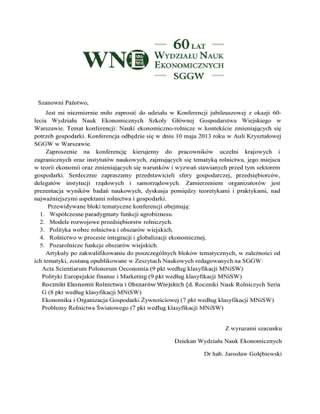 Szanowni Państwo, Jest mi niezmiernie miło zaprosić do udziału w Konferencji jubileuszowej z okazji 60lecia Wydziału Nauk Ekonomicznych Szkoły Głównej Gospodarstwa Wiejskiego w Warszawie. Temat konferencji: Nauki ekonomiczno-rolnicze w kontekście zmieniających się potrzeb gospodarki. Konferencja odbędzie się w dniu 10 maja 2013 roku w Auli Kryształowej SGGW w Warszawie. Zaproszenie na konferencję kierujemy do pracowników uczelni krajowych i zagranicznych oraz instytutów naukowych, zajmujących się tematyką rolnictwa, jego miejsca w teorii ekonomii oraz zmieniających się warunków i wyzwań stawianych przed tym sektorem gospodarki. Serdecznie zapraszamy przedstawicieli sfery gospodarczej, przedsiębiorców, delegatów instytucji rządowych i samorządowych. Zamierzeniem organizatorów jest prezentacja wyników badań naukowych, dyskusja pomiędzy teoretykami i praktykami, nad najważniejszymi aspektami rolnictwa i gospodarki. Przewidywane bloki tematyczne konferencji obejmują: 1. Współczesne paradygmaty funkcji agrobiznesu. 2. Modele rozwojowe przedsiębiorstw rolniczych. 3. Polityka wobec rolnictwa i obszarów wiejskich. 4. Rolnictwo w procesie integracji i globalizacji ekonomicznej. 5. Pozarolnicze funkcje obszarów wiejskich. Artykuły po zakwalifikowaniu do poszczególnych bloków tematycznych, w zależności od ich tematyki, zostaną opublikowane w Zeszytach Naukowych redagowanych na SGGW: Acta Scientiarum Polonorum Oeconomia (9 pkt według klasyfikacji MNiSW) Polityki Europejskie finanse i Marketing (9 pkt według klasyfikacji MNiSW) Roczniki Ekonomii Rolnictwa i Obszarów Wiejskich (d. Roczniki Nauk Rolniczych Seria G (8 pkt według klasyfikacji MNiSW) Ekonomika i Organizacja Gospodarki Żywnościowej (7 pkt według klasyfikacji MNiSW) Problemy Rolnictwa Światowego (7 pkt według klasyfikacji MNiSW) Z wyrazami szacunku Dziekan Wydziału Nauk Ekonomicznych Dr hab. Jarosław Gołębiewski