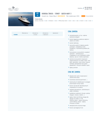 Infolinia 82 DOOKOŁA ŚWIATA - SYDNEY - QUEEN MARY 2 DNI Cunard Line - Queen Mary 2 | Rok modernizacji: 2016 | 801 08 08 03 22 492 77 90 9.8/10 Ocena klientów TRASA REJSU: Sydney (Australia) dzie Brisbane dzie Whitsunday Island dzie dzie dzie Darwin dzie dzie ... Wewnętrzna TERMIN Zewnętrzna Zewnętrzna z oknem z balkonem Apartament CENA ZAWIERA zakwaterowanie w 2-os. kabinie wybranej kategorii serwis bagażowy podczas wejścia i zejścia ze statku serwis kabinowy wszystkie posiłki (3 główne posiłki, przekąski, całodobowy bufet, śniadanie z możliwością podania do kabiny) korzystanie ze wszystkich urządzeń sportowo – rekreacyjnych znajdujących się na pokładzie statku (baseny, jacuzzi, boiska sportowe) udział we wszystkich imprezach organizowanych na statku (teatr, kino, bale, dyskoteki, kursy tańca, kasyno, wykłady specjalistów oraz guest speakerów z różnych dziedzin nauk) opłaty portowe CENA NIE ZAWIERA dojazdu do/z portu rozpoczęcia i zakończenia rejsu transferów (lotnisko/port/hotel...) ewentualnych dodatkowych noclegów przed rejsem lub po rejsie kosztu wycieczek fakultatywnych (kupowanych na statku) napojów gazowanych, alkoholowych, wody mineralnej wydatków osobistych (fryzjer, pralnia, fotograf, internet, telefon...) opłaty Hotel and Dining charge dla obsługi na statku (11.50 USD/os./dzień - kabiny Britannia, 13.50 USD/os./dzień - kabiny Princess & Grills) ubezpieczenia turystycznego kosztu wymaganych wiz