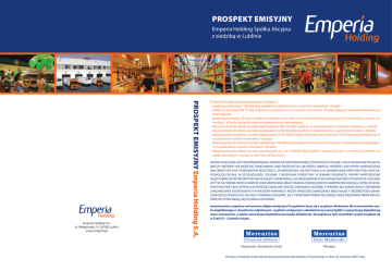 PROSPEKT EMISYJNY Emperia Holding Spółka Akcyjna z siedzibą w Lublinie PROSPEKT EMISYJNY Emperia Holding S.A. Emperia Holding S.A. ul. Mełgiewska 7-9, 20-952 Lublin www.emperia.pl Prospekt Emisyjny został przygotowany w związku z: – publiczną subskrypcją 1.500.000 akcji zwykłych na okaziciela serii L o wartości nominalnej 1 zł każda, – publiczną sprzedażą 399.111 akcji zwykłych na okaziciela serii I o wartości nominalnej 1 zł każda, będących własnością Akcjonariuszy Sprzedających, – publiczną sprzedażą 7.154 akcji zwykłych imiennych serii K (które po ich dematerializacji będą akcjami na okaziciela) o wartości nominalnej 1 zł każda, będących własnością Akcjonariuszy Sprzedających, – dopuszczeniem do obrotu na rynku regulowanym 2.085.323 akcji zwykłych na okaziciela serii H o wartości nominalnej 1 zł każda, – dopuszczeniem do obrotu na rynku regulowanym 4.203.562 akcji zwykłych na okaziciela serii I o wartości nominalnej 1 zł każda, – dopuszczeniem do obrotu na rynku regulowanym 55.747 akcji zwykłych imiennych serii J (które po ich dematerializacji będą akcjami na okaziciela) o wartości nominalnej 1 zł każda, – dopuszczeniem do obrotu na rynku regulowanym 290.468 akcji zwykłych imiennych serii K (które po ich dematerializacji będą akcjami na okaziciela) o wartości nominalnej 1 zł każda, – dopuszczeniem do obrotu na rynku regulowanym od 1 do 1.500.000 akcji zwykłych na okaziciela serii L o wartości nominalnej 1 zł każda i powstałych w związku z nimi Praw do Akcji Serii L. OFERTA PUBLICZNA JEST PRZEPROWADZANA JEDYNIE NA TERYTORIUM RZECZYPOSPOLITEJ POLSKIEJ. POZA GRANICAMI POLSKI NINIEJSZY PROSPEKT NIE MOŻE BYĆ TRAKTOWANY JAKO PROPOZYCJA LUB OFERTA NABYCIA. PROSPEKT ANI PAPIERY WARTOŚCIOWE NIM OBJĘTE NIE BYŁY PRZEDMIOTEM REJESTRACJI, ZATWIERDZENIA LUB NOTYFIKACJI W JAKIMKOLWIEK PAŃSTWIE POZA RZECZĄPOSPOLITĄ POLSKĄ, W SZCZEGÓLNOŚCI ZGODNIE Z PRZEPISAMI DYREKTYWY W SPRAWIE PROSPEKTU. PAPIERY WARTOŚCIOWE OBJĘTE NINIEJSZYM PROSPEKTEM NIE MOGĄ BYĆ OFEROWANE LUB SPRZEDAWANE POZA GRANICAMI RZECZYPOSPOLITEJ POLSKIEJ (W TYM NA TERENIE INNYCH PAŃSTW UNII EUROPEJSKIEJ ORAZ STANÓW ZJEDNOCZONYCH AMERYKI PÓŁNOCNEJ), CHYBA ŻE W DANYM PAŃSTWIE TAKA OFERTA LUB SPRZEDAŻ MOGŁABY ZOSTAĆ DOKONANA ZGODNIE Z PRAWEM, BEZ KONIECZNOŚCI SPEŁNIENIA JAKICHKOLWIEK DODATKOWYCH WYMOGÓW PRAWNYCH. KAŻDY INWESTOR ZAMIESZKAŁY BĄDŹ MAJĄCY SIEDZIBĘ POZA GRANICAMI RZECZYPOSPOLITEJ POLSKIEJ POWINIEN ZAPOZNAĆ SIĘ Z PRZEPISAMI PRAWA POLSKIEGO ORAZ PRZEPISAMI PRAW INNYCH PAŃSTW, KTÓRE MOGĄ SIĘ DO NIEGO STOSOWAĆ. Inwestowanie w papiery wartościowe objęte niniejszym Prospektem łączy się z ryzykiem właściwym dla instrumentów rynku kapitałowego o charakterze udziałowym, ryzykiem związanym z działalnością naszej Spółki i naszej Grupy Kapitałowej oraz z otoczeniem, w jakim nasza Grupa Kapitałowa prowadzi działalność. Szczegółowy opis czynników ryzyka znajduje się w Części II – Czynniki ryzyka. Organizator i Koordynator Emisji Oferujący Niniejszy Prospekt został zatwierdzony przez Komisję Nadzoru Finansowego w dniu 25 września 2007 roku. OŚWIADCZENIE STOSOWNIE DO ROZPORZĄDZENIA KOMISJI (WE) nr 809/2004 z dnia 29 kwietnia 2004 roku Emperia Holding S.A. z siedzibą w Lublinie, będąc odpowiedzialna za informacje zamieszczone w niniejszym Prospekcie, oświadcza, że zgodnie z najlepszą wiedzą i przy dołożeniu należytej staranności, by zapewnić taki stan, informacje zawarte w Prospekcie są prawdziwe, rzetelne i zgodne ze stanem faktycznym oraz że w Prospekcie nie pominięto niczego, co mogłoby wpływać na jego znaczenie. Emperia Holding S.A. Artur Kawa Prezes Zarządu ZASTRZEŻENIE Niniejszy Prospekt został sporządzony w związku z ofertą publiczną akcji naszej Spółki na terenie Polski oraz ich dopuszczeniem do obrotu na rynku regulowanym na Giełdzie Papierów Wartościowych w Warszawie S.A. Prospekt został sporządzony zgodnie z przepisami Rozporządzenia Komisji (WE) nr 809/2004 oraz innymi przepisami regulującymi rynek kapitałowy w Polsce, w szczególności Ustawą o Ofercie Publicznej. O ile z kontekstu nie wynika inaczej, określenia zawarte w treści Prospektu takie jak „my”, „nasza Spółka”, „Emperia Holding”, „Emperia Holding S.A.” oraz ich odmiany odnoszą się do spółki Emperia Holding S.A. z siedzibą w Lublinie, natomiast „Grupa”, „nasza Grupa”, „nasza Grupa Kapitałowa”, „Grupa Emperia”, „Grupa Kapitałowa Emperia”, „my i spółki z naszej Grupy” oraz ich odmiany odnoszą się do Grupy Kapitałowej Emperia Holding, w skład której wchodzi spółka Emperia Holding S.A., jej podmioty bezpośrednio zależne objęte konsolidacją: Eldorado Sp. z o.o. z siedzibą w Lublinie, Groszek Sp. z o.o. z siedzibą w Lublinie, Stokrotka Sp. z o.o. z siedzibą w Lublinie, Infinite Sp. z o.o. z siedzibą w Lublinie, Elpro Sp. z o.o. z siedzibą w Lublinie, Milea Sp. z o.o. z siedzibą w Lublinie, BOS S.A. z siedzibą w Białymstoku, Centrum Sp. z o.o. z siedzibą w Bartoszycach, Maro-Markety Sp. z o.o. z siedzibą w Poznaniu oraz podmioty pośrednio zależne objęte konsolidacją: Dystrybucja Logistyka Serwis S.A. z siedzibą w Płocku, Sygel-Jool S.A. z siedzibą w Częstochowie, DEF Sp. z o.o. z siedzibą w Białymstoku, Express Podlaski Sp. z o.o. z siedzibą w Białymstoku, Arsenal Sp. z o.o. z siedzibą w Białymstoku, Jaskółka Sp. z o.o. z siedzibą w Białymstoku, Lewiatan Podlasie Sp. z o.o. z siedzibą w Białymstoku, Rexpol Sp. z o.o. w likwidacji z siedzibą w Płocku, Społem Tychy Sp. z o.o. z siedzibą w Tychach, a także podmioty pośrednio zależne wyłączone z konsolidacji: Sklepy Polka Sp. z o.o. z siedzibą w Białymstoku, Lider Sp. z o.o. z siedzibą w Szczecinie, Berti – Magazyn Centralny Sp. z o.o. z siedzibą w Szczecinie. Z wyjątkiem osób wymienionych w niniejszym Prospekcie, tj. członków Zarzą