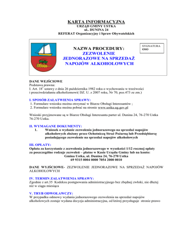 KARTA INFORMACYJNA URZĄD GMINY USTKA ul.. DUNINA 24 REFERAT Organizacyjny i Spraw Obywatelskich NAZWA PROCEDURY: ZEZWOLENIE JEDNORAZOWE NA SPRZEDAŻ NAPOJÓW ALKOHOLOWYCH SYGNATURA OSO DANE WEJŚCIOWE Podstawa prawna: I. Art. 181 ustawy z dnia 26 października 1982 roku o wychowaniu w trzeźwości i przeciwdziałaniu alkoholizmowi( DZ. U. z 2007 roku, Nr 70, poz.473 ze zm.) I. SPOSÓB ZAŁATWIENIA SPRAWY: 1. Formularz wniosku można otrzymać w Biurze Obsługi Interesantów ; 2. Formularz wniosku można pobrać na stronie www.ustka.ug.gov.pl Wnioski przyjmowane są w Biurze Obsługi Interesanta parter ul. Dunina 24, 76-270 Ustka 76-270 Ustka. II. WYMAGANE DOKUMENTY: 1. Wniosek o wydanie zezwolenia jednorazowego na sprzedaż napojów alkoholowych złożony przez Ochotniczą Straż Pożarną lub Przedsiębiorcę posiadającego zezwolenie na sprzedaż napojów alkoholowych III. OPŁATY: Opłata za korzystanie z zezwolenia jednorazowego w wysokości 1/12 rocznej opłaty za poszczególne rodzaje zezwoleń – płatne w Kasie Urzędu Gminy lub na konto: Gmina Ustka, ul. Dunina 24, 76-270 Ustka 69 9315 0004 0000 7054 2000 0010 DANE WYJŚCIOWE- ZEZWOLENIE JEDNORAZOWE NA SPRZEDAŻ NAPOJÓW ALKOHOLOWYCH IV. TERMIN ZAŁATWIENIA SPRAWY: Zgodnie z art.35 Kodeksu postępowania administracyjnego bez zbędnej zwłoki, nie dłużej niż w ciągu miesiąca V. TRYB ODWOŁAWCZY: W przypadku odmowy wydania jednorazowego zezwolenia na sprzedaż napojów alkoholowych zostaje wydana decyzja administracyjna, od której przysługuje stronie prawo wniesienia odwołania do Samorządowego Kolegium Odwoławczego w Słupsku za pośrednictwem Wójta Gminy Ustka w terminie czternastu dni od dnia otrzymania decyzji. VI. DODATKOWE INFORMACJE: VII. OSOBA ZAŁATWIAJĄCA SPRAWĘ: Pani Anna Żupnik, pok. nr 11, tel. (059) 8 152 422 lub (059) 8 144 044 w. 422