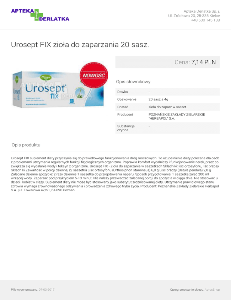 Apteka Derlatka Sp. j. Ul. Źródłowa 20, 25-335 Kielce +48 530 145 138 Urosept FIX zioła do zaparzania 20 sasz. Cena: 7,14 PLN Opis słownikowy Dawka - Opakowanie 20 sasz.a 4g Postać zioła do zaparz.w saszet. Producent POZNAŃSKIE ZAKŁADY ZIELARSKIE "HERBAPOL" S.A. Substancja czynna - Opis produktu Urosept FIX suplement diety przyczynia się do prawidłowego funkcjonowania dróg moczowych. To uzupełnienie diety polecane dla osób z problemami utrzymania regularnych funkcji fizjologicznych organizmu. Poprawia komfort wydalniczy i funkcjonowanie nerek, przez co zwiększa się wydalanie wody i toksyn z organizmu. Urosept FIX - Zioła do zaparzania w saszetkach Składniki: liść ortosyfonu, liść brzozy Składniki Zawartość w porcji dziennej (2 saszetki) Liść ortosyfonu (Orthosiphon stamineus) 6,0 g Liść brzozy (Betula pendula) 2,0 g Zalecane dzienne spożycie: 2 razy dziennie 1 saszetka do przygotowania naparu. Sposób przygotowania: 1 saszetkę zalać 200 ml wrzącej wody. Zaparzać pod przykryciem 5-10 minut. Nie należy przekraczać zalecanej porcji do spożycia w ciągu dnia. Nie stosować u dzieci i kobiet w ciąży. Suplement diety nie może być stosowany jako substytut zróżnicowanej diety. Utrzymanie prawidłowego stanu zdrowia wymaga zrównoważonego odżywiania i prowadzenia zdrowego trybu życia. Producent: Poznańskie Zakłady Zielarskie Herbapol S.A. | ul. Towarowa 47/51, 61-896 Poznań Plik wygenerowano: 07-03-2017 Powered by TCPDF (www.tcpdf.org) Oprogramowanie sklepu: AptusShop
