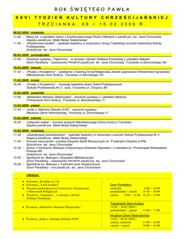 ROK ŚWIĘTEGO PAWŁA XXVI TYDZIEŃ KULTURY CHRZEŚCIJAŃSKIEJ TRZCIANKA, 08 ÷ 15.02.2009 R. 08.02.2009 niedziela 11.00 - Msza św. z udziałem dzieci z Eucharystycznego Ruchu Młodych z parafii pw. św. Jana Chrzciciela /kaplica parafii pw. Matki Bożej Saletyńskiej/ 11.45 - „Różańcowe koraliki” - spektakl teatralny w wykonaniu Grupy Teatralnej uczniów Katolickiej Szkoły Podstawowej /kościół pw. św. Jana Chrzciciela/ 09.02.2009 poniedziałek 17.00 - Otwarcie wystawy „Tajemnice... w obrazie i słowie" Elżbiety Ponińskiej z udziałem Malarki /Dom Parafialny - kawiarenka PROMYK parafii pw. św. Jana Chrzciciela, Trzcianka ul Żeromskiego 39/ 10.02.2009 wtorek 17.30 - „Prosto z Kropielnicy" - spotkanie z Autorką Anną Małgorzatą Jóźwik poprowadzi Włodzimierz Ignasiński /Młodzieżowy Dom Kultury, Trzcianka ul Sikorskiego 24/ 11.02.2009 środa 16.30 - „Prosto z Kropielnicy" - impresje teatralne dzieci Szkół Podstawowych /Szkoła Podstawowa Nr 2 - aula, Trzcianka ul. Chopina 36/ 12.02.2009 czwartek 17.00 - „Malarstwo Mariana Olejniczaka" - otwarcie wystawy z udziałem Malarza /Trzcianecki Dom Kultury, Trzcianka ul. Broniewskiego 7/ 13.02.2009 piątek 17.00 - „Indie o. Mariana Żelazka SVD” - otwarcie wystawy /Muzeum Ziemi Nadnoteckiej, Trzcianka ul. Żeromskiego 7/ 14.02.2009 sobota 18.30 - „Usłyszeć siebie” - koncert poetycki Młodzieżowego Domu Kultury Trzcianka /kaplica parafii pw. Matki Bożej Saletyńskiej/ 15.02.2009 niedziela 11.30 - „Zaskakujące podobieństwo” - spektakl teatralny w wykonaniu uczniów Szkoły Podstawowej Nr 3 /kaplica parafii pw. Matki Bożej Saletyńskiej/ 11.45 - Koncert nauczycieli i uczniów Zespołu Szkół Muzycznych im. Fryderyka Chopina w Pile /kościół pw. św. Jana Chrzciciela/ 12.30 - Suma z homilią ks. Biskupa Ordynariusza Edwarda Dajczaka i z udziałem ks. Prowincjała Władysława Pasiuta MS /kościół pw. św. Jana Chrzciciela/ 15.00 - Spotkanie ks. Biskupa z Zespołem Bibliotecznym /Dom Parafialny - kawiarenka PROMYK parafii pw. św. Jana Chrzciciela/ 16.00 - Spotkanie ks. Biskupa z Twórcami prac artystycznych /Dom Parafialny - holl parafii pw. św. Jana Chrzciciela/ UWAGA: --------------------------------------------------------------------------------------------------------------------------------------------------------------------------------------------------------------------------------------------------------------- Kiermasz „Książka za 1zł” Kiermasz „Tania książka” Wystawa pokonkursowa Twórczości Artystycznej o Motywach Religijnych Wystawa „Tajemnice... w obrazie i słowie” Elżbiety Ponińskiej | | | | | | Dom Parafialny niedziela 9.00 ÷ 19.00 poniedziałek ÷ piątek 16.30 ÷ 19.00 sobota 9.00 ÷ 12.00, 16.30 ÷ 19.00 ----------------------------------------------------------------------------------------------------------------------------- ---------------------------------------------------------------------------------------------------------------------------------- Wystawa „Malarstwo Mariana Olejniczaka” | | | Trzcianecki Dom Kultury 12.02 ÷ 20.02.2009 r. poniedziałek ÷ piątek 13.00 ÷ 17.00 --------------------------------------------------------------------------------------------------------------------------------------------------------------------------------------------------------------------------------------------------------------- Wystawa „Indie o. Mariana Żelazka SVD” | | | | Muzeum Ziemi Nadnoteckiej 13.02 ÷ 08.03.2009 r. sobota, niedziela 11.00 ÷ 16.00 wtorek ÷ piątek 10.00 ÷ 16.00 ---------------------------------------------------------------------------------------------------------------------------------------------------------------------------------------------------------------------------------------------------------------