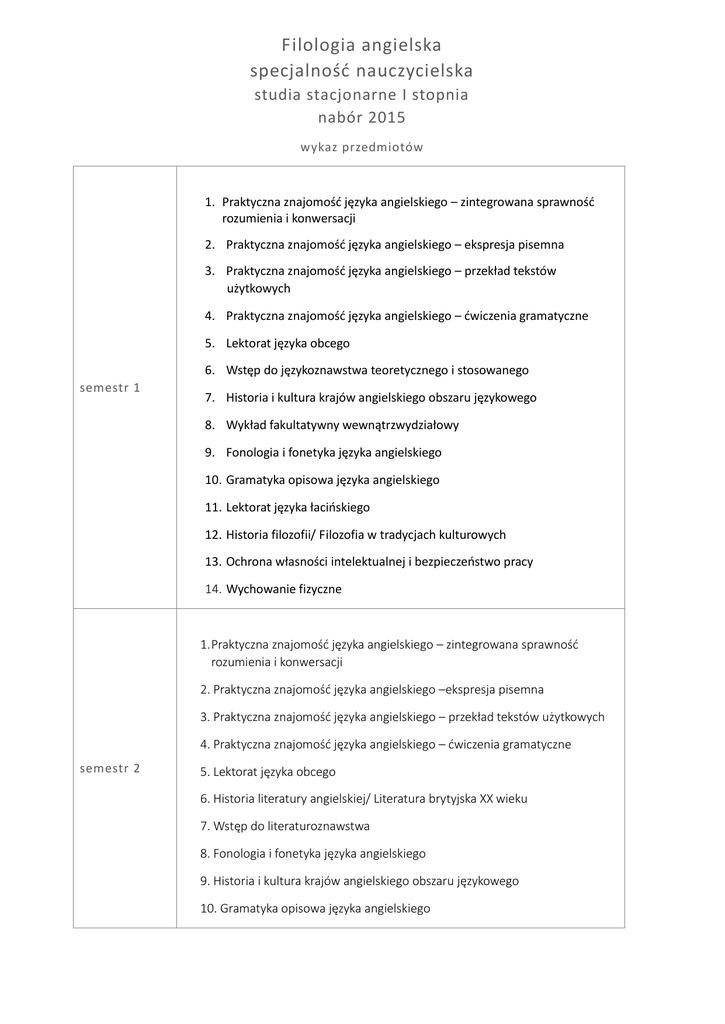Filologia angielska specjalność nauczycielska studia stacjonarne I stopnia nabór 2015 wykaz przedmiotów 1. Praktyczna znajomość języka angielskiego – zintegrowana sprawność rozumienia i konwersacji 2. Praktyczna znajomość języka angielskiego – ekspresja pisemna 3. Praktyczna znajomość języka angielskiego – przekład tekstów użytkowych 4. Praktyczna znajomość języka angielskiego – ćwiczenia gramatyczne 5. Lektorat języka obcego 6. Wstęp do językoznawstwa teoretycznego i stosowanego semestr 1 7. Historia i kultura krajów angielskiego obszaru językowego 8. Wykład fakultatywny wewnątrzwydziałowy 9. Fonologia i fonetyka języka angielskiego 10. Gramatyka opisowa języka angielskiego 11. Lektorat języka łacińskiego 12. Historia filozofii/ Filozofia w tradycjach kulturowych 13. Ochrona własności intelektualnej i bezpieczeństwo pracy 14. Wychowanie fizyczne 1. Praktyczna znajomość języka angielskiego – zintegrowana sprawność rozumienia i konwersacji 2. Praktyczna znajomość języka angielskiego –ekspresja pisemna 3. Praktyczna znajomość języka angielskiego – przekład tekstów użytkowych 4. Praktyczna znajomość języka angielskiego – ćwiczenia gramatyczne semestr 2 5. Lektorat języka obcego 6. Historia literatury angielskiej/ Literatura brytyjska XX wieku 7. Wstęp do literaturoznawstwa 8. Fonologia i fonetyka języka angielskiego 9. Historia i kultura krajów angielskiego obszaru językowego 10. Gramatyka opisowa języka angielskiego 11. Technologia informacyjna 12. Wychowanie fizyczne 1. Praktyczna znajomość języka angielskiego – zintegrowana sprawność rozumienia i konwersacji 2. Praktyczna znajomość języka angielskiego – ekspresja pisemna 3. Praktyczna znajomość języka angielskiego – przekład tekstów użytkowych 4. Praktyczna znajomość języka angielskiego – ćwiczenia gramatyczne 5. Lektorat języka obcego semestr 3 6. Historia literatury amerykańskiej/ Literatura amerykańska XX wieku 7. Podstawy pedagogiki ogólnej 8. Historia literatury angielskiej/ Literatura brytyjska XX wieku 9. Psychologiczne podstawy wychowania i nauczania 10. Wykład monograficzny 1/ Wykład monograficzny2 11. Wykład fakultatywny wewnątrzwydziałowy 12. Praktyka zawodowa pedagogiczno-psychologiczna 1. Praktyczna znajomość języka angielskiego – zintegrowana sprawność rozumienia i konwersacji 2. Praktyczna znajomość języka angielskiego – ekspresja pisemna 3. Praktyczna znajomość języka angielskiego – przekład tekstów użytkowych 4. Praktyczna znajomość języka angielskiego – ćwiczenia gramatyczne 5. Lektorat języka obcego semestr 4 6. Historia literatury amerykańskiej/ Literatura amerykańska XX wieku 7. Podstawy dydaktyki 8. Dydaktyka przedmiotowa języka angielskiego 9. Metodyka pracy z uczniem ze specjalnymi potrzebami edukacyjnymi 10. Seminarium dyplomowe 11. Wiedza o akwizycji i nauce języków 12. Praktyka pedagogiczna obserwacyjna semestr 5 1. Praktyczna znajomość języka angielskiego – zintegrowana sprawność rozumienia i konwersacji 2. Praktyczna znajomość języka angielskiego –ekspresja pisemna 3. Praktyczna znajomość języka angielskiego – przekład tekstów użytkowych 4. Praktyczna znajomość języka angielskiego – ćwiczenia gramatyczne 5. Interpretacja tekstów literackich 6. Dydaktyka przedmiotowa języka angielskiego 7. Emisja i higiena głosu 8. Seminarium dyplomowe 9. Nauczanie języka angielskiego uczniów w wieku szkolnym i przedszkolnym 10. Metodyka zintegrowanego nauczania przedmiotowo-językowego 11. Wykład fakultatywny wewnątrzwydziałowy 12. Praktyka pedagogiczna czynna 1. Praktyczna znajomość języka angielskiego –ekspresja pisemna 2. Gramatyka kontrastywna/ Wstęp do językoznawstwa kontrastywnego 3. Historia języka angielskiego/ Elementy gramatyki historycznej semestr 6 4. Seminarium dyplomowe 5. Kulturowe aspekty komunikacji językowej 6. Prawo w oświacie 7. Praca dyplomowa opiekun roku: dr hab. Dorota Chłopek