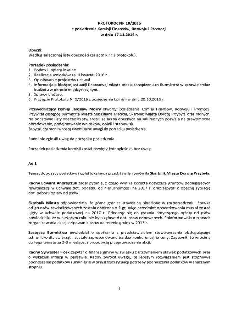PROTOKÓŁ NR 10/2016 z posiedzenia Komisji Finansów, Rozwoju i Promocji w dniu 17.11.2016 r. Obecni: Według załączonej listy obecności (załącznik nr 1 protokołu). Porządek posiedzenia: 1. Podatki i opłaty lokalne. 2. Realizacja wniosków za III kwartał 2016 r. 3. Opiniowanie projektów uchwał. 4. Informacja o bieżącej sytuacji finansowej miasta oraz o zarządzeniach Burmistrza w sprawie zmian budżetu w okresie międzysesyjnym. 5. Sprawy bieżące. 6. Przyjęcie Protokołu Nr 9/2016 z posiedzenia komisji w dniu 20.10.2016 r. Przewodniczący komisji Jarosław Mokry otworzył posiedzenie Komisji Finansów, Rozwoju i Promocji. Przywitał Zastępcę Burmistrza Miasta Sebastiana Macioła, Skarbnik Miasta Dorotę Przybyłę oraz radnych. Na podstawie listy obecności stwierdził, że liczba obecnych na sali radnych pozwala na prawomocne obradowanie, podejmowanie wniosków, opinii i stanowisk. Zapytał, czy radni wnoszą ewentualne uwagi do porządku posiedzenia. Radni nie zgłosili uwag do porządku posiedzenia. Porządek posiedzenia komisji został przyjęty jednogłośnie, bez uwag. Ad 1 Temat dotyczący podatków i opłat lokalnych przedstawiła i omówiła Skarbnik Miasta Dorota Przybyła. Radny Edward Andrejczuk zadał pytanie, z czego wynika korekta dotycząca gruntów podlegających rewitalizacji w uchwale dot. podatku od nieruchomości na 2017 r. oraz zapytał o obecną sytuację dot. poboru opłaty od psów. Skarbnik Miasta odpowiedziała, że górne granice stawek są określone w rozporządzeniu. Stawka od gruntów rewitalizowanych została obniżona o 2 gr, więc przedmiot opodatkowania musiał zostać ujęty w uchwale podatkowej na 2017 r. Odnosząc się do pytania dotyczącego opłaty od psów powiedziała, że w bieżącym roku nie było zgłoszeń dot. psów czipowanych. Poinformowała o planach zorganizowania akacji czipowania psów na terenie gminy w 2017 r. Zastępca Burmistrza powiedział o spotkaniu z przedstawicielem stowarzyszenia obsługującego schronisko dla zwierząt - zostały zaproponowane bardzo konkurencyjne ceny. Zapewnił, że wrócimy do tego tematu za 2-3 miesiące, z propozycją przeprowadzenia akcji. Radny Sylwester Ficek zapytał o finanse gminy w związku z utrzymaniem stawek podatkowych oraz o wskaźnik inflacji w państwie. Radny zwrócił uwagę, że lepszym rozwiązaniem jest stopniowe podnoszenie podatków i uniknięcie w przyszłości sytuacji potrzeby podnoszenia podatków w znacznym stopniu. 1 Skarbnik Miasta poinformowała, że obecnie mamy do czynienia z deflacją. Odpowiedziała, że w projekcie budżetu na 2017 r. realizacja dochodów w tym zakresie jest na poziomie 2016 r. Nadmieniła, iż każdego roku zwiększają się powierzchnie do opodatkowania, więc dochody mogą być większe. Radny Sylwester Ficek zapytał, czy inkasenci są potrzebni jeżeli istnieje możliwość dokonywania opłat zarówno w Starym (UM) jak i Nowym Bieruniu (BPIK). Skarbnik Miasta odpowiedziała że BPIK działa jako inkaso stałe, prowadzi punkt poboru opłat w siedzibie spółki, natomiast inkasenci działają w terenie. Jest to wygodne szczególnie dla osób starszych, które przyzwyczaiły się do takiej formy regulowania opłat. Przewodniczący komisji zapytał, czy forma inkasenta w terenie występuje wyłącznie w części nowobieruńskiej. Skarbnik Miasta potwierdziła wypowiedź radnego. Radny Marcin Nyga w związku ze zwolnieniem od opłaty właścicieli psów stale oznakowanych, zwrócił się z prośbą o podjęcie następującego wniosku: Wniosek 1 Komisja Finansów, Rozwoju i Promocji wnioskuje do Burmistrza Miasta o przygotowanie informacji nt. zwolnienia od opłaty właścicieli psów trwale oznakowanych oraz przekazanie do przychodni weterynaryjnych na terenie miasta, z prośbą o umieszczenie na tablicach informacyjnych. za – 9 głosów przeciw – 0 głosów wstrzym. – 1 głos Komisja większością głosów przyjęła wniosek. W głosowaniu brało udział 10 radnych. Radna Maria Sitko zadała pytanie dot. wysokości podatku rolnego. Skarbnik Miasta odpowiedziała, że jest to uzależnione od klasyfikacji gruntu. Szczegółowo wyjaśniła zasady naliczania wartości podatku. Podsumowała, że wartość jest trochę niższa, niż była w 2016 r. Radny Sylwester Ficek zapytał od kiedy działa inkaso w BPIK. Skarbnik Miasta odpowiedziała, że BPIK jako inkasent został wprowadzony w trakcie obecnego roku podatkowego. Przewodniczący komisji zwrócił się o rozszerzenie tematu dot. podatku od stref rewitalizacyjnych oraz zapytał jaki jest prognozowany przychód z tytułu tego podatku. Skarbnik Miasta wyjaśniła, że podatek ten jest podatkiem warunkowym. Będzie naliczony jeżeli w terminie 3 lat od wejścia w życie uchwały, inwestycja na danym terenie rewitalizacyjnym nie zostanie zrealizowana. Na dzień dzisiejszy jest wprowadzony wymogiem ustawowym. Przewodniczący komisji zapytał o kwestę związaną z realizowaniem zadań określonych w uchwale. Skarbnik Miasta doprecyzowała, że chodzi o zadania określone w programie rewitalizacji. 2 Opinia 1 Komisja Finansów, Rozwoju i Promocji pozytywnie opiniuje projekt uchwały w sprawie określenia wysokości stawek podatku od nieruchomości w 2017 r., zwolnień z tego podatku oraz zarządzenia poboru podatku w drodze inkasa w 2017 r. za – 10 głosów przeciw – 0 głosów wstrzym. – 0 głosów Komisja jednogłośnie przyjęła opinię. W głosowaniu brało udział 10 radnych. Opinia 2 Komisja Finansów, Rozwoju i Promocji pozytywnie opiniuje projekt uchwały w sprawie określenia stawek podatku od środków transportowych na rok 2017. za – 10 głosów przeciw – 0 głosów wstrzym. – 0 głosów Komisja jednogłośnie przyjęła opinię. W głosowaniu brało udział 10 radnych. Opinia 3 Komisja Finansów, Rozwoju i Promocji pozytywnie opiniuje projekt uchwały w sprawie poboru podatku rolnego i leśnego w drodze inkasa w 2017 r. za – 10 głosów przeciw – 0 gło
