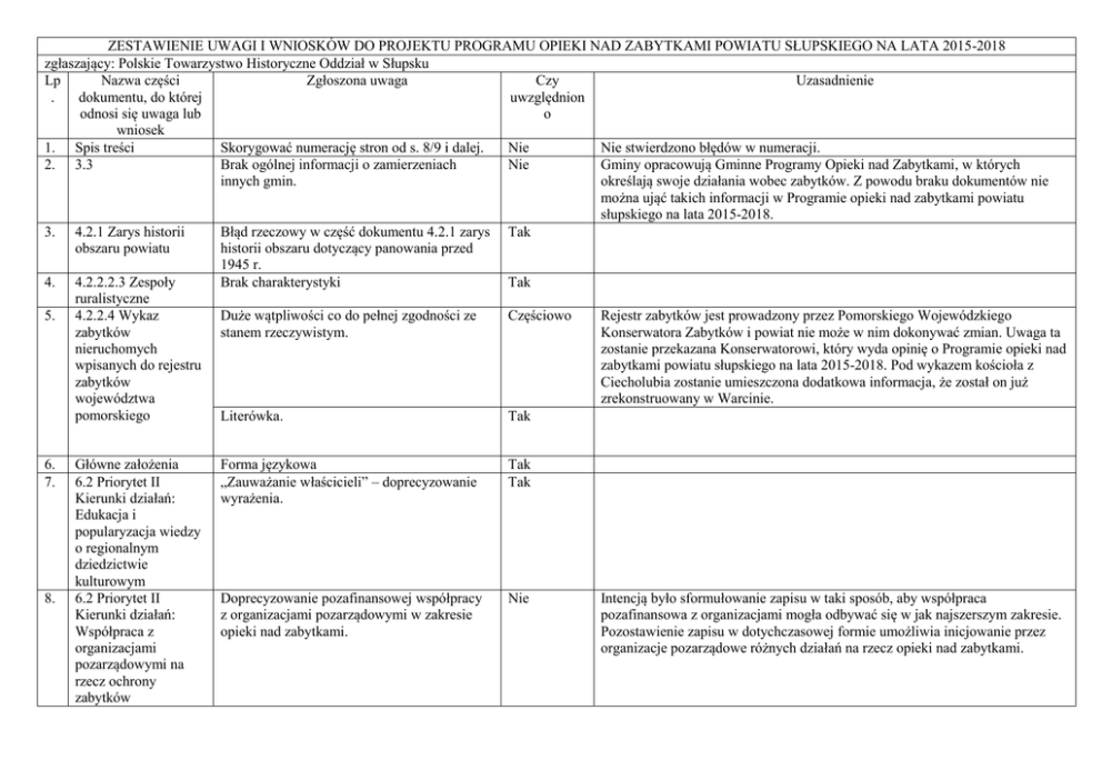 ZESTAWIENIE UWAGI I WNIOSKÓW DO PROJEKTU PROGRAMU OPIEKI NAD ZABYTKAMI POWIATU SŁUPSKIEGO NA LATA 2015-2018 zgłaszający: Polskie Towarzystwo Historyczne Oddział w Słupsku Lp Nazwa części Zgłoszona uwaga Czy Uzasadnienie . dokumentu, do której uwzględnion odnosi się uwaga lub o wniosek 1. Spis treści Skorygować numerację stron od s. 8/9 i dalej. Nie Nie stwierdzono błędów w numeracji. 2. 3.3 Brak ogólnej informacji o zamierzeniach Nie Gminy opracowują Gminne Programy Opieki nad Zabytkami, w których innych gmin. określają swoje działania wobec zabytków. Z powodu braku dokumentów nie można ująć takich informacji w Programie opieki nad zabytkami powiatu słupskiego na lata 2015-2018. 3. 4.2.1 Zarys historii Błąd rzeczowy w część dokumentu 4.2.1 zarys Tak obszaru powiatu historii obszaru dotyczący panowania przed 1945 r. 4. 4.2.2.2.3 Zespoły Brak charakterystyki Tak ruralistyczne 5. 4.2.2.4 Wykaz Duże wątpliwości co do pełnej zgodności ze Częściowo Rejestr zabytków jest prowadzony przez Pomorskiego Wojewódzkiego zabytków stanem rzeczywistym. Konserwatora Zabytków i powiat nie może w nim dokonywać zmian. Uwaga ta nieruchomych zostanie przekazana Konserwatorowi, który wyda opinię o Programie opieki nad wpisanych do rejestru zabytkami powiatu słupskiego na lata 2015-2018. Pod wykazem kościoła z zabytków Ciecholubia zostanie umieszczona dodatkowa informacja, że został on już województwa zrekonstruowany w Warcinie. pomorskiego Literówka. Tak 6. 7. 8. Główne założenia 6.2 Priorytet II Kierunki działań: Edukacja i popularyzacja wiedzy o regionalnym dziedzictwie kulturowym 6.2 Priorytet II Kierunki działań: Współpraca z organizacjami pozarządowymi na rzecz ochrony zabytków Forma językowa „Zauważanie właścicieli” – doprecyzowanie wyrażenia. Tak Tak Doprecyzowanie pozafinansowej współpracy z organizacjami pozarządowymi w zakresie opieki nad zabytkami. Nie Intencją było sformułowanie zapisu w taki sposób, aby współpraca pozafinansowa z organizacjami mogła odbywać się w jak najszerszym zakresie. Pozostawienie zapisu w dotychczasowej formie umożliwia inicjowanie przez organizacje pozarządowe różnych działań na rzecz opieki nad zabytkami. 6.3.1. Zespół pałacowo-parkowy w Damnicy 10. 6.3.2 Zabytkowy park w Przytocku 11. 6.3.4 Budynek 9. biurowy przy al. Sienkiewicza 20 w Słupsku Wyjaśnić na czym polega ochrona konserwatorska. Tak Wyjaśnić na czym polega ochrona konserwatorska. Wyjaśnić na czym polega ochrona konserwatorska. Tak Tak