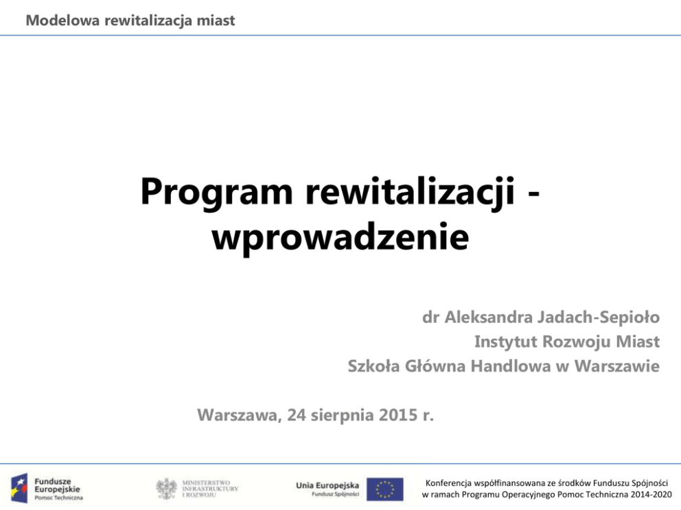 Modelowa rewitalizacja miast Program rewitalizacji wprowadzenie dr Aleksandra Jadach-Sepioło Instytut Rozwoju Miast Szkoła Główna Handlowa w Warszawie Warszawa, 24 sierpnia 2015 r. Konferencja współfinansowana ze środków Funduszu Spójności w ramach Programu Operacyjnego Pomoc Techniczna 2014-2020 Modelowa rewitalizacja miast Plan prezentacji 1. Po co powstaje program rewitalizacji? 2. Od czego zacząć tworzenie programu rewitalizacji? 3. Wybór obszaru rewitalizacji 4. Struktura programu Konferencja współfinansowana ze środków Funduszu Spójności w ramach Programu Operacyjnego Pomoc Techniczna 2014-2020 Modelowa rewitalizacja miast Po co powstaje program rewitalizacji? 1. Koordynacja działań z zakresu rewitalizacji (39%) 2. Zachowanie cennych obiektów dziedzictwa kulturowego (26%) 3. Ożywienie obszarów o trudnej sytuacji społeczno-gospodarczej (18%) 4. Pozyskanie środków UE (?) Badanie Mazowieckiego Biura Planowania Regionalnego, 2010 Konferencja współfinansowana ze środków Funduszu Spójności w ramach Programu Operacyjnego Pomoc Techniczna 2014-2020 Modelowa rewitalizacja miast Po co powstaje program rewitalizacji? Kiedy powstaje program? 2011 r. Konferencja współfinansowana ze środków Funduszu Spójności w ramach Programu Operacyjnego Pomoc Techniczna 2014-2020 Modelowa rewitalizacja miast Przykład – Aleksandrów Łódzki (2005-2007) Cel: stymulowanie współpracy środowisk lokalnych, nowe aktywności gospodarcze, nowe miejsca pracy, zapobieganie peryferyzacji miasta. Zasięg: granice gminy (UWAGA: tereny miejskie i wiejskie!) Kryteria wyboru działań: zniwelowanie czynników ograniczających wzrost gospodarczy, rozwój zasobów ludzkich, konkurencyjność (narzędzia: analiza SWOT i konsultacje społeczne) Konferencja współfinansowana ze środków Funduszu Spójności w ramach Programu Operacyjnego Pomoc Techniczna 2014-2020 Modelowa rewitalizacja miast Przykład – Aleksandrów Łódzki (2005-2007) Efekty: 1. Rewitalizacja Parku Miejskiego przy Placu Kościuszki (ZPORR - Rozwój turystyki i kultury), w tym: • Remont Ratusza Miejskiego • Odnowa „Pastorówki” • Odnowa budynku Wagi i adaptacja na galerię • Rewaloryzacja Parku Miejskiego • Rewaloryzacja Rynku 2. Termomodernizacja obiektów edukacyjno - kulturalnych w Gminie Aleksandrów Łódzki (RPO WŁ) 3. Modernizacja MOSiR (RPO WŁ) Co dalej? Konferencja współfinansowana ze środków Funduszu Spójności w ramach Programu Operacyjnego Pomoc Techniczna 2014-2020 Modelowa rewitalizacja miast Przykład – Wrocław. Masterplan dla Przedmieścia Odrzańskiego Cel: analiza warunków brzegowych i przygotowanie działań, stworzenie mapy drogowej dla kolejnych kroków w rewitalizacji, „dokument niezbędny do podejmowania decyzji zarządczych”. Zasięg: Nadodrze Kryteria wyboru działań: ustalenie hierarchii (dokładna analiza, przygotowanie materiału do projektów koncepcyjnych dla podobszarów, kwartałów lub budynków). Konferencja współfinansowana ze środków Funduszu Spójności w ramach Programu Operacyjnego Pomoc Techniczna 2014-2020 Modelowa rewitalizacja miast Przykład – Wrocław. Masterplan dla Przedmieścia Odrzańskiego http://www.wroclaw.pl/program-rewitalizacji-miast-zalozenia-finansowanie InfoPunkt, Łokietka 5 Konferencja współfinansowana ze środków Funduszu Spójności w ramach Programu Operacyjnego Pomoc Techniczna 2014-2020 Modelowa rewitalizacja miast Przykład – Wrocław. Przedmieście Oławskie Grudzień 2012 r. Listopad 2013 r. Konferencja współfinansowana ze środków Funduszu Spójności w ramach Programu Operacyjnego Pomoc Techniczna 2014-2020 Modelowa rewitalizacja miast Po co powstaje program rewitalizacji? Kto inicjuje opracowanie programu? Konferencja współfinansowana ze środków Funduszu Spójności w ramach Programu Operacyjnego Pomoc Techniczna 2014-2020 Modelowa rewitalizacja miast Przykład – Nałęczów. 2010 Inicjator: władze miasta. Cel: zniwelowanie kontrastu między częścią uzdrowiskową a miejską Zasięg: całe miasto Konferencja współfinansowana ze środków Funduszu Spójności w ramach Programu Operacyjnego Pomoc Techniczna 2014-2020 Modelowa rewitalizacja miast Przykład – Mysłowice. 2013 Inicjator: Centrum Integracji Społecznej. Cel: koordynacja działań organizacji pozarządowych – wzmocnienie działań oddolnych. Zasięg: trzy dzielnice: Piasek, Centrum, Stare Miasto. Konferencja współfinansowana ze środków Funduszu Spójności w ramach Programu Operacyjnego Pomoc Techniczna 2014-2020 Modelowa rewitalizacja miast Po co powstaje program rewitalizacji? Jakie środki są dostępne? • Wnioski z Inicjatywy JESSICA • Wnioski ze ZPORR Konferencja współfinansowana ze środków Funduszu Spójności w ramach Programu Operacyjnego Pomoc Techniczna 2014-2020 Modelowa rewitalizacja miast Przykład – Kędzierzyn-Koźle Program: środki publiczne (UE). Zaplanowane działania: • Monitoring Starego Miasta • Przebudowa ulic w rejonie Starego Miasta z budową ścieżek rowerowych • Starostwo Powiatowe – remont budynku I LO • Remont Kościoła pw. Wniebowzięcia NMP i przebudowa zaplecza • Szkoła Muzyczna – wymiana dachu http://biznes.pl/kraj/kedzierzyn-kozle-chce-wyremontowac-rynek-w-ramach-ppp/xq40ww Konferencja współfinansowana ze środków Funduszu Spójności w ramach Programu Operacyjnego Pomoc Techniczna 2014-2020 Modelowa rewitalizacja miast Wnioski z Inicjatywy JESSICA Program rewitalizacji powinien objąć jak największy obszar miasta, żeby jak najwięcej podmiotów mogło aplikować o środki. Czy Program rewitalizacji powinien objąć najbardziej zdegradowaną część miasta, aby przedsiębiorcy inwestowali w obszarze zdegradowanym. ??? Konferencja współfinansowana ze środków Funduszu Spójności w ramach Programu Operacyjnego Pomoc Techniczna 2014-2020 Modelowa rewitalizacja miast Wnioski ze ZPORR – znów aktualne Program rewitalizacji powinien zawierać jak najwięc