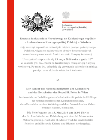 Kustosz Sanktuarium Narodowego na Kahlenbergu wspólnie z Ambasadorem Rzeczypospolitej Polskiej w Wiedniu mają zaszczyt zaprosić na odsłonięcie miejsca pamięci poświęconego Polakom, więźniom nazistowskich obozów koncentracyjnych zamordowanym na terenie Austrii w czasie II wojny światowej. Uroczystość rozpocznie się 13 maja 2016 roku o godz. 1600 w kościele pw. św. Józefa na Kahlenbergu mszą świętą z asystą wojskową. Po mszy św. odbędzie się ceremonia odsłonięcia miejsca pamięci oraz złożenie wieńców i kwiatów. Der Rektor des Nationalheiligtums am Kahlenberg und der Botschafter der Republik Polen in Wien beehren sich zur Enthüllung einer Gedenkstätte für polnische Häftlinge der nationalsozialistischen Konzentrationslager, die während des zweiten Weltkriegs auf dem österreichischen Gebiet ermordet wurden, einzuladen. Die Feier beginnt am 13. Mai 2016 um 16.00 Uhr in der St. Josefskirche am Kahlenberg mit einer hl. Messe unter Militärbegleitung. Nach der hl. Messe wird die Gedenkstätte feierlich enthüllt sowie Kränze und Blumen niedergelegt.