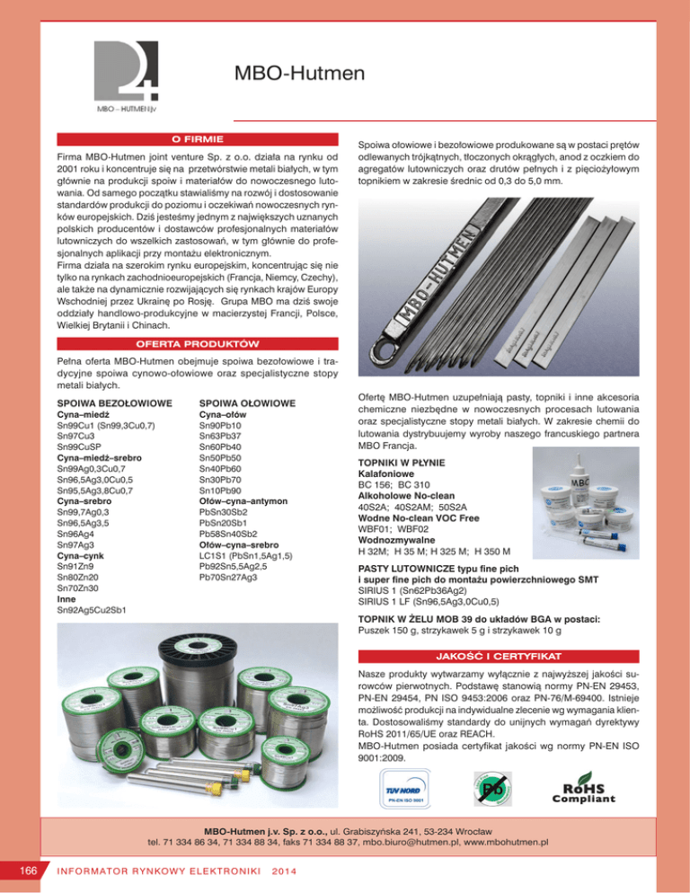 MBO-Hutmen OFIRMIE Firma MBO-Hutmen joint venture Sp. z o.o. działa na rynku od 2001 roku ikoncentruje się na przetwórstwie metali białych, wtym głównie na produkcji spoiw imateriałów do nowoczesnego lutowania. Od samego początku stawialiśmy na rozwój idostosowanie standardów produkcji do poziomu ioczekiwań nowoczesnych rynków europejskich. Dziś jesteśmy jednym znajwiększych uznanych polskich producentów i dostawców profesjonalnych materiałów lutowniczych do wszelkich zastosowań, wtym głównie do profesjonalnych aplikacji przy montażu elektronicznym. Firma działa na szerokim rynku europejskim, koncentrując się nie tylko na rynkach zachodnioeuropejskich (Francja, Niemcy, Czechy), ale także na dynamicznie rozwijających się rynkach krajów Europy Wschodniej przez Ukrainę po Rosję. Grupa MBO ma dziś swoje oddziały handlowo-produkcyjne w macierzystej Francji, Polsce, Wielkiej Brytanii iChinach. Spoiwa ołowiowe i bezołowiowe produkowane są w postaci prętów odlewanych trójkątnych, tłoczonych okrągłych, anod z oczkiem do agregatów lutowniczych oraz drutów pełnych i z pięciożyłowym topnikiem w zakresie średnic od 0,3 do 5,0 mm. OFERTA PRODUKTÓW Pełna oferta MBO-Hutmen obejmuje spoiwa bezołowiowe i tradycyjne spoiwa cynowo-ołowiowe oraz specjalistyczne stopy metali białych. SPOIWA BEZOŁOWIOWE SPOIWA OŁOWIOWE Cyna–miedź Sn99Cu1 (Sn99,3Cu0,7) Sn97Cu3 Sn99CuSP Cyna–miedź–srebro Sn99Ag0,3Cu0,7 Sn96,5Ag3,0Cu0,5 Sn95,5Ag3,8Cu0,7 Cyna–srebro Sn99,7Ag0,3 Sn96,5Ag3,5 Sn96Ag4 Sn97Ag3 Cyna–cynk Sn91Zn9 Sn80Zn20 Sn70Zn30 Inne Sn92Ag5Cu2Sb1 Cyna–ołów Sn90Pb10 Sn63Pb37 Sn60Pb40 Sn50Pb50 Sn40Pb60 Sn30Pb70 Sn10Pb90 Ołów–cyna–antymon PbSn30Sb2 PbSn20Sb1 Pb58Sn40Sb2 Ołów–cyna–srebro LC1S1 (PbSn1,5Ag1,5) Pb92Sn5,5Ag2,5 Pb70Sn27Ag3 Ofertę MBO-Hutmen uzupełniają pasty, topniki i inne akcesoria chemiczne niezbędne w nowoczesnych procesach lutowania oraz specjalistyczne stopy metali białych. W zakresie chemii do lutowania dystrybuujemy wyroby naszego francuskiego partnera MBO Francja. TOPNIKI W PŁYNIE Kalafoniowe BC 156; BC 310 Alkoholowe No-clean 40S2A; 40S2AM; 50S2A Wodne No-clean VOC Free WBF01; WBF02 Wodnozmywalne H 32M; H 35 M; H 325 M; H 350 M PASTY LUTOWNICZE typu fine pich i super fine pich do montażu powierzchniowego SMT SIRIUS 1 (Sn62Pb36Ag2) SIRIUS 1 LF (Sn96,5Ag3,0Cu0,5) TOPNIK W ŻELU MOB 39 do układów BGA w postaci: Puszek 150 g, strzykawek 5 g i strzykawek 10 g JAKOŚĆ ICERTYFIKAT Nasze produkty wytwarzamy wyłącznie z najwyższej jakości surowców pierwotnych. Podstawę stanowią normy PN-EN 29453, PN-EN 29454, PN ISO 9453:2006 oraz PN-76/M-69400. Istnieje możliwość produkcji na indywidualne zlecenie wg wymagania klienta. Dostosowaliśmy standardy do unijnych wymagań dyrektywy RoHS 2011/65/UE oraz REACH. MBO-Hutmen posiada certyfikat jakości wg normy PN-EN ISO 9001:2009. MBO-Hutmen j.v. Sp. zo.o., ul. Grabiszyńska 241, 53-234 Wrocław tel. 71334 86 34, 71334 88 34, faks 71334 88 37, [email protected], www.mbohutmen.pl 166 I N F O R M AT O R R Y N KO W Y E L E K T R O N I K I 2014