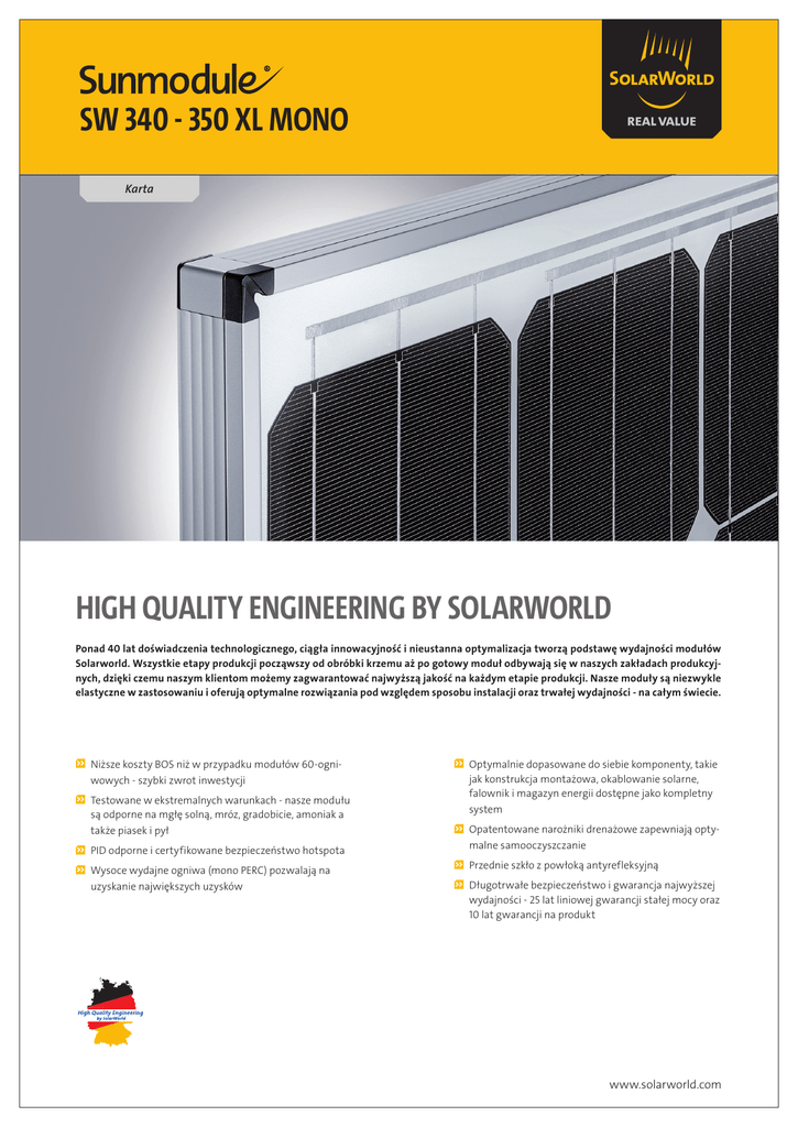 SW 340 - 350 XL MONO Karta High Quality Engineering by SolarWorld Ponad 40 lat doświadczenia technologicznego, ciągła innowacyjność i nieustanna optymalizacja tworzą podstawę wydajności modułów Solarworld. Wszystkie etapy produkcji począwszy od obróbki krzemu aż po gotowy moduł odbywają się w naszych zakładach produkcyjnych, dzięki czemu naszym klientom możemy zagwarantować najwyższą jakość na każdym etapie produkcji. Nasze moduły są niezwykle elastyczne w zastosowaniu i oferują optymalne rozwiązania pod względem sposobu instalacji oraz trwałej wydajności - na całym świecie. Niższe koszty BOS niż w przypadku modułów 60-ogniwowych - szybki zwrot inwestycji Testowane w ekstremalnych warunkach - nasze modułu są odporne na mgłę solną, mróz, gradobicie, amoniak a także piasek i pył PID odporne i certyfikowane bezpieczeństwo hotspota Wysoce wydajne ogniwa (mono PERC) pozwalają na uzyskanie największych uzysków Optymalnie dopasowane do siebie komponenty, takie jak konstrukcja montażowa, okablowanie solarne, falownik i magazyn energii dostępne jako kompletny system Opatentowane narożniki drenażowe zapewniają optymalne samooczyszczanie Przednie szkło z powłoką antyrefleksyjną Długotrwałe bezpieczeństwo i gwarancja najwyższej wydajności - 25 lat liniowej gwarancji stałej mocy oraz 10 lat gwarancji na produkt www.solarworld.com SW 340 - 350 XL MONO REAKCJA PRZY TEŚCIE W WARUNKACH STANDARDOWYCH (STC)* SW 340 SW 345 SW 350 Moc znamionowa Pmax 340 Wp 345 Wp 350 Wp Napięcie jałowe Uoc 47,6 V 47,8 V 48 V Napięcie MPP Umpp 38 V 38,2 V 38,4 V 9,82 A Prąd zwarciowy I sc 9,69 A 9,75 A Natężenie MPP I mpp 9,01 A 9,1 A 9,17 A Współczynnik skuteczności modułu ηm 17,04 % 17,29 % 17,54 % Tolerancja pomiarów (Pmaks.) z możliwością powołania się na TÜV Rheinland: +/- 2% (TÜV Power controlled, ID 0000039351) *STC: 1000W/m², 25°C, AM 1.5 REAKCJA PRZY 800 W/m², NOCT, AM 1.5 SW 340 SW 345 SW 350 Moc znamionowa Pmax 259,3 Wp 263,8 Wp 267,2 Wp Napięcie jałowe Uoc 41,5 V 41,8 V Napięcie MPP Umpp 34,9 V 35,2 V Prąd zwarciowy Isc 8,05 A 8,1 A Natężenie MPP I mpp 7,42 A 7,5 A • Qualified,•IEC 61215 IEC 61215 Qualified, 42 V • Safety tested, IEC 61730 • Safety tested, IEC 61730 • Blowing sand resistance, IEC 60068-2-68 • Blowing sand resistance, IEC 60068-2-68 • Ammonia•resistance, IEC 62716 IEC 62716 Ammonia resistance, 35,4 V • Salt mist corrosion, 61701 IEC 61701 • Salt mistIEC corrosion, • Periodic inspection • Periodic inspection 8,16 A • Qualified, IEC 61215 • Periodic inspection • Safety tested, IEC 61730 • Periodic inspection • Qualified, 61215controlled •IEC Power • Blowing sand resistance, IEC 60068-2-68 • Power controlled • Safety tested, IEC 61730 • Ammonia resistance, IEC 62716 • Blowing sand resistance, IEC 60068-2-68 • Salt mist corrosion, IEC 61701 • Ammonia resistance, IEC 62716 • Periodic inspection • Salt mist corrosion, IEC 61701 • Periodic inspection • Periodic inspection • Power controlled • Periodic inspection • Power controlled 7,56 A Nieznaczna redukcja współczynnika skuteczności przy reakcji na częściowe obciążenie w 25°C: przy 200 W/m² osiąga się 97 % (+/- 3 %) współczynnika STC. PARAMETRY OPTYMALNEGO POŁĄCZENIA SYSTEMOWEGO -0 Wp / +5 Wp Sortowanie wg mocy 1000 V / 1500 V Maks. napięcie systemowe IEC / NEC 25 A Obciążenie prądem wstecznym • Qualified, IEC 61215 • Qualified, IEC 61215 • Safety tested, IEC 61730 • Safety tested, IEC 61730 • Blowing sand resistance, IEC 60068-2-68 • Blowing sand resistance, IEC 60068-2-68 • Ammonia resistance, IEC 62716 • Ammonia resistance, IEC 62716 • Salt mist IEC 61701 • Salt mist corrosion, IECcorrosion, 61701 • Periodic inspection • Periodic inspection • Periodic inspection • Periodic inspection • Power controlled • Power controlled 3 Diody bypass -40°C - +85°C Maks. temperatura robocza Maksymalna obciążalność (system 2-profilowy)* +2,4 kN/m² / -2,4 kN/m² *Szczegółowe informacje na temat dozwolonych przypadków obciążenia można znaleźć w instrukcja użytkownika 961 106,65 - + 4 x ∅ 6,6 292,85 4x∅9 STOSOWANE MATERIAŁY Komórki na moduł 72 Materiał komórek ogniwa monokrystaliczne PERC Wymiary komórki 156 mm x 156 mm 397 1200 (10 x 7) (4) szkło hartowane (EN 12150) Strona frontowa biała folia Strona tylnia 400 1993 aluminium anodowane srebrne Obramowanie IP65 Stopień ochrony (IP) H4 Typ złącza wtykowego 397 WYMIARY / Ciężar PARAMETRY TERMICZNE Długość 1993 mm NOCT Szerokość 1001 mm TK Isc 0,042 %/K Wysokość 33 mm TK Uoc -0,304 %/K Ciężar 21,6 kg TK Pmpp -0,43 %/K Numer zamówienia Opis 82000134 Sunmodule SW 340 XL mono 82000136 Sunmodule SW 345 XL mono 82000138 Sunmodule SW 350 XL mono 399,50 33 Certyfikaty i gwarancje Certyfikaty Gwarancje IEC 61730 IEC 61215 UL 1703 IEC 62716 IEC 60068-2-68 IEC 61701 Gwarancja na produkt 10 lat Liniowa gwarancja stałej mocy 25 lat SolarWorld AG zastrzega sobie możliwość zmian specyfikacji. Niniejszy arkusz danych jest zgodny z wytycznymi EN 50380. 90002416 | V2 2016-11-08 PL Informacje o zamawianiu 46 °C