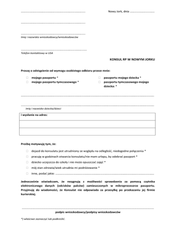 ………………………………………………………………………….. Nowy Jork, dnia …………………………… ………………………………………………………………………….. ………………………………………………………………………….. Imię i nazwisko wnioskodawcy/wnioskodawców ……………………………………………………………………………. Telefon kontaktowy w USA KONSUL RP W NOWYM JORKU Proszę o odstąpienie od wymogu osobistego odbioru przeze mnie: mojego paszportu * mojego paszportu tymczasowego * paszportu mojego dziecka * paszportu tymczasowego mojego dziecka: * ……………………………………………………………………………………………………………………………………………………………. ……………………………………………………………………………………………………………………………………………………………. imię i nazwisko dziecka/dzieci i wysłanie na adres: Prośbę motywuję tym, że: dojazd do konsulatu jest utrudniony ze względu na odległość, niedogodne połączenia * pracuję w godzinach otwarcia konsulatu/nie mam urlopu, by odebrać paszport * dziecko uczęszcza do szkoły i nie może opuszczać zajęć * mój stan zdrowia/wiek utrudnia mi podróżowanie * inne, podać jakie: …………………………………………………………………………………………………………………… Jednocześnie oświadczam, że rezygnuję z możliwości sprawdzenia za pomocą czytnika elektronicznego danych (odcisków palców) zamieszczonych w mikroprocesorze paszportu. Przyjmuję do wiadomości, że Konsulat nie odpowiada za przesyłkę po przekazaniu jej firmie kurierskiej. ................................................................................................................................................................. podpis wnioskodawcy/podpisy wnioskodawców *) właściwe zaznaczyć lub podkreślić.