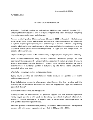 Grudziądz,02.01.2012 r. PLF 3120.2.2012 INTERPRETACJA INDYWIDUALNA Wójt Gminy Grudziądz działając na podstawie art.14 j§1 ustawy z dnia 29 sierpnia 1997 r. Ordynacja Podatkowa (Dz.U. z 2005 r. Nr 8 poz.60 z późn.zm.), wdaje niniejszym urzędową interpretację przepisów prawa podatkowego. Pismem z dnia 9 grudnia 2011 r.(wpłynęło 12 grudnia 2011 r.) Podatnik – Nadleśnictwo Jamy- zwrócił się do organu podatkowego właściwego w zakresie podatku od nieruchomości o wydanie urzędowej interpretacji prawa podatkowego w zakresie ustalenia jaką stawką podatku od nieruchomości należy stosowad od gruntów pod liniami energetycznymi, oraz jak poprawnie zaliczad grunty sklasyfikowane jako lasy , a zajęte pod linie energetyczne , do podatku od nieruchomości. W przedmiotowym wniosku został przedstawiony następujący stan przyszły i stan faktyczny. Skarb Paostwa-Nadleśnictwo Jamy zamierza ustanowid służebnośd przesyłu na rzecz operatora linii energetycznych , właściciela linii posadowionych na tych gruntach. Grunty, na których ustanowiona zostanie służebnośd przesyłu są w zarządzie Nadleśnictwa Jamy i sklasyfikowane w ewidencji gruntów i budynków są jako tereny różne wyłączone z gospodarki leśnej oraz lasy . W związku z powyższym zadano następujące pytanie: 1.jaką stawką podatku od nieruchomości należy stosowad od gruntów pod liniami elektroenergetycznym? 2.czy Nadleśnictwo poprawnie zalicza grunty sklasyfikowane jako lasy , a zajęte pod linie energetyczne, do podatku od nieruchomości , skoro nie mogą byd one zajęte na prowadzenie gospodarki leśnej? Stanowisko wnioskodawcy jest następujące: Stawkę podatku od nieruchomości dla gruntów zajętych pod linie elektroenergetyczne należy przyjąd zgodnie z art.5 ust.1 pkt 1c ustawy o podatkach i opłatach lokalnych, tj. stawkę od gruntów pozostałych , ze względu na to że Nadleśnictwo Jamy nie prowadzi na tych gruntach działalności gospodarczej. Zaliczanie gruntów sklasyfikowanych jako lasy , do podatku od nieruchomości , jest zgodne z zapisem art.1 ust.1 ustawy o podatku leśnym ( Dz.U Nr 200 poz.1682 z 2002r.) Ad.1 W Dzienniku Urzędowym Ministra Finansów z 2006 roku . Nr 4 poz.42 zostało opublikowane pismo Podsekretarza Stanu z dnia 7 kwietnia 2006 r. znak: LK -8012-833-1/MS/06/4 do Wójtów, Burmistrzów, Prezydentów Miast w sprawie jednolitego stosowania prawa podatkowego przez organy podatkowe w zakresie opodatkowania podatkiem od nieruchomości gruntów pod napowietrznymi liniami energetycznymi , którymi zarządza Paostwowe Gospodarstwo Leśne Lasy Paostwowe. „……. W związku z powyższym, grunty te, w sytuacji gdy są sklasyfikowane w ewidencji gruntów i budynków inaczej niż lasy lub użytki rolne , podlegają opodatkowaniu podatkiem od nieruchomości na zasadach ogólnych od 2006 roku. Jeżeli znajdują się w posiadaniu przedsiębiorcy np. zakładu energetycznego , to jako grunty związane z prowadzeniem działalności gospodarczej będą opodatkowane wg stawek określonych a art.5 ust.1 pkt 1 lit .a ustawy z dnia 12 stycznia 1991 r. o podatkach i opłatach lokalnych (Dz. U z 2010 r. Nr 95 z późn.zm)…….. ……..Jeżeli zatem Paostwowe Gospodarstwo Leśne Lasy Paostwowe zawarło umowy z zakładami energetycznymi przenoszące posiadanie gruntów pod napowietrznymi liniami energetycznymi na te podmioty , to podatnikami od tych gruntów będą odpowiednio zakłady energetyczne. Jeżeli jednak w/w zakłady energetyczne posiadają grunty pod liniami bez tytułu prawnego , wówczas podatnikiem od tych gruntów będą odpowiednio jednostki organizacyjne Paostwowego Gospodarstwa Leśnego Lasy Paostwowe faktycznie władające tymi gruntami. Organ podatkowy w pełni podziela w/w stanowisko. Grunty pod liniami energetycznymi jako zajęte na prowadzenie działalności gospodarczej , będą opodatkowane podatkiem od nieruchomości wg stawek najwyższych tj. stawek , o których mowa w art. 5 ust.1 pkt 1 lit.a, ustawy o podatkach i opłatach lokalnych. Ad.2 Zgodnie z art. 1 ust.1 ustawy o podatku leśnym opodatkowaniu podatkiem leśnym podlegają określone w ustawie lasy , z wyjątkiem lasów zajętych na wykonywanie innej działalności gospodarczej niż działalnośd leśna . Na gruntach leśnych wnioskodawcy usytuowane są linie elektroenergetyczne. Nadleśnictwo nie może prowadzid gospodarki leśnej na gruntach pod liniami i grunty te nie służą działalności leśnej. Grunty te nie podlegają opodatkowaniu podatkiem leśnym , podlegają one opodatkowaniu podatkiem od nieruchomości. Wynika to z art.2 ust.2 ustawy z dnia 12 stycznia 1991 r. o podatkach i opłatach lokalnych (tj. Dz.U. z 2010 r. Nr 95,poz.613 z późn.zm), który stanowi , iż opodatkowaniu podatkiem od nieruchomości nie podlegają grunty sklasyfikowane w ewidencji gruntów i budynków jako m.in. lasy, z wyjątkiem zajętych na prowadzenie działalności gospodarczej. Lasy zajęte na prowadzenie działalności gospodarczej inna niż leśna nie podlegają opodatkowaniu podatkiem leśnym , lecz podatkiem od nieruchomości. Stawkami właściwymi do opodatkowania tych gruntów będą stawki przewidziane dla gruntów związanych z prowadzeniem działalności gospodarczej, o których mowa w art.5 ust.1 pkt 1 lit. a ustawy o podatkach i opłatach lokalnych Powyższa interpretacja dotyczy stanu przyszłego przedstawionego przez podatnika i stanu prawnego obowiązującego w dacie jej udzielenia, traci ona swoją moc z chwilą zmiany przepisów prawa podatkowego. Na indywidualną interpretację przepisów prawa podatkowego przysługuje skarga do Wojewódzkiego Sądu Administracyjnego w Bydgoszczy, złożona za pośrednictwem Wójta Gminy Grudziądz. Skargę wnosi się po uprzednim wezwaniu Wójta Gminy Grudziądz do usunięcia naruszenia prawa , które powinno byd złożone w terminie 14 dni od dnia otrzymania interpretacji. Skargę wnosi się w dwóch egzemplarzach w terminie trzydziestu dni od dnia do