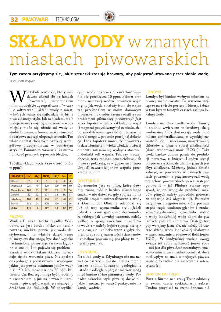 32 PIWOWAR TECHNOLOGIA SKŁAD WODY w znanych miastach piwowarskich Tym razem przyjrzymy się, jakie sztuczki stosują browary, aby polepszyć używaną przez siebie wodę. Tekst: Piotr Wypych W artykule o wodzie, który niedawno ukazał się na łamach „Piwowara”, wspominałem m.in. o podejściu „geograficznym” – czyli o odtwarzaniu składu wody z miast, w których warzy się najbardziej wybitne piwa z danego stylu. Jak napisałem, takie podejście ma swoje ograniczenia – woda miejska może się różnić od wody ze studni browaru, a browar może stosować dodatkowe zabiegi ulepszające wodę. Ten właśnie temat chciałbym bardziej szczegółowo przedyskutować w poniższym artykule. Pomoże to rozwiać kilka mitów i uniknąć pewnych typowych błędów. Tabelka składu wody (zawartość jonów w ppm): MIASTO Ca2+ Mg2+ HCO3- SO42- Na+ Cl- Pilzno 10 3 3 4 3 4 Dortmund 225 40 220 120 60 60 Monachium 109 21 171 79 2 36 Londyn 52 32 104 32 86 34 Edynburg 100 18 160 105 20 45 Burton 352 24 320 820 44 16 Dublin 118 4 319 54 12 19 PILZNO Woda z Pilzna to trochę zagadka. Wiadomo, że jest bardzo nisko zmineralizowana, miękka, prawie jak woda destylowana, i to właśnie dzięki temu pilsnery czeskie mogą być dość wysoko nachmielone, pozostając zarazem łagodne w smaku. I tu pojawia się problem – zasadzie woda o takim składzie nie nadaje się do warzenia piwa. Nie spełnia ona jednego z podstawowych wymogów, jakim jest pewne minimum jonów wapnia – 50. No, może uszłoby 30 ppm kationów Ca. Bez tego mogą być problemy z zacieraniem, a już na pewno z klarowaniem piwa, gdyż wapń jest niezbędny drożdżom do flokulacji. W specyfika- cjach wody pilzneńskiej zawartość wapnia nie przekracza 10 ppm. Pilsner zrobiony na takiej wodzie powinien wyjść mętny jak woda z kałuży (sam się o tym raz przekonałem w moim domowym browarku). Jak sobie zatem radzili z tym problemem pilzneńscy piwowarzy? Jest kilka hipotez – jedna zakłada, że wapń (i magnez) pozyskiwany był ze słodu, słabo zmodyfikowanego i dość intensywnie obrabianego w procesie potrójnej dekokcji. Inna hipoteza mówi, że piwowarzy w dziewiętnastym wieku wiedzieli więcej o chemii niż nam się wydaje i stosowali dodatki soli wapnia. Tak czy inaczej, obecnie testy robione przez ciekawskich piwoszy pokazują, że w gotowym Pilsner Urquell zawartość jonów wapnia przekracza 50 ppm. DORTMUND Dortmunder jest to piwo, które dawniej znane było z bardzo mineralnego smaku – nie dziwi to, gdy spojrzymy na wysoki stopień zmineralizowania wody z Dortmundu. Obecnie odchodzi się już od tego wyznacznika stylu. Jeżeli jednak chcemy spróbować dortmundera takiego jak dawniej warzono, należy zadbać o sporą zawartość minerałów w wodzie – należy hojnie sypnąć nie tylko gipsu, ale i chlorku wapnia, gdyż dopiero przy sporej zawartości i siarczanów, i chlorków pojawia się pożądany tu mineralny posmak. EDYNBURG Na skład wody w Edynburgu nie ma nawet co patrzeć – miasto leży na terenie bardzo skomplikowanym geologicznie i studnie odległe o paręset metrów mogą mieć bardzo różne parametry wody. Ponadto szkockie style piwa są dosyć nijakie i można je warzyć praktycznie na każdej wodzie. LONDYN Londyn był bardzo ważnym miastem na piwnej mapie świata. Tu warzono najlepsze na świecie portery i bittery, i duża w tym była w tamtych czasach zasługa lokalnej wody. Londyn ma dwa źródła wody: Tamizę i studnie wwiercone w kredową skałę wodonośną. Oba dostarczają wodę dość mocno zmineralizowaną, o wysokiej zawartości sodu i siarczanów, umiarkowanej chlorków, a także o sporej alkaliczności (dużo wodorowęglanów HCO3-). Taka woda bardzo dobrze pasuje do produkcji porterów, z których Londyn słynął przede wszystkim, ale dla piw jasnych jest zbyt alkaliczna. Możemy jednak śmiało założyć, że piwowarzy w dawnych czasach powszechnie przystosowywali wodę do celów piwowarskich przez wstępne gotowanie – już Pliniusz Starszy opisywał, że np. wodę do produkcji miodów pitnych należy uprzednio gotować, aż odparuje 2/3 objętości (!). Po takim wstępnym przegotowaniu, które pozwala strącić część wodorowęglanów i zredukować alkaliczność, można było uzyskać z wody londyńskiej wodę dobrą do piw jasnych: pale ale i bitterów. Dlatego też, gdy warzymy jasne ale, nie należy odtwarzać składu wody londyńskiej dosłownie – warto znacznie zredukować ilość jonów HCO3-. W londyńskiej wodzie uwagę zwraca też spora zawartość jonów sodu – sód jest dla piwa dość neutralnym smakowo minerałem i trudno ocenić jak duży miał wpływ na smak tamtejszych piw, ale warto o to zadbać dla zachowania autentyczności. BURTON ON TRENT Piwa z Burton nad rzeką Trent odniosły w swoim czasie spektakularny sukces. Trudno przypisać to czemu innemu niż