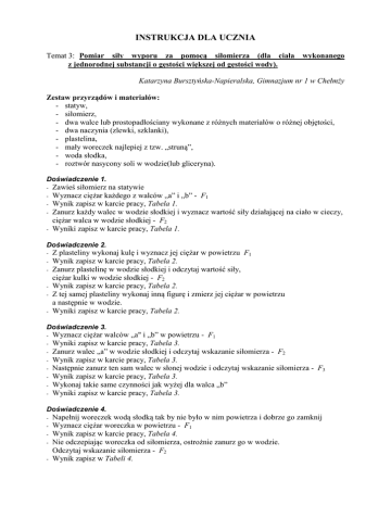 INSTRUKCJA DLA UCZNIA Temat 3: Pomiar siły wyporu za pomocą siłomierza (dla ciała z jednorodnej substancji o gęstości większej od gęstości wody). wykonanego Katarzyna Bursztyńska-Napieralska, Gimnazjum nr 1 w Chełmży Zestaw przyrządów i materiałów: - statyw, - siłomierz, - dwa walce lub prostopadłościany wykonane z różnych materiałów o różnej objętości, - dwa naczynia (zlewki, szklanki), - plastelina, - mały woreczek najlepiej z tzw. „struną”, - woda słodka, - roztwór nasycony soli w wodzie(lub gliceryna). Doświadczenie 1. - Zawieś siłomierz na statywie Wyznacz ciężar każdego z walców „a” i „b” - F1 Wynik zapisz w karcie pracy, Tabela 1. Zanurz każdy walec w wodzie słodkiej i wyznacz wartość siły działającej na ciało w cieczy, ciężar walca w wodzie słodkiej - F2 Wyniki zapisz w karcie pracy, Tabela 1. Doświadczenie 2. - Z plasteliny wykonaj kulę i wyznacz jej ciężar w powietrzu F1 Wynik zapisz w karcie pracy, Tabela 2. Zanurz plastelinę w wodzie słodkiej i odczytaj wartość siły, ciężar kulki w wodzie słodkiej - F2 Wynik zapisz w karcie pracy, Tabela 2. Z tej samej plasteliny wykonaj inną figurę i zmierz jej ciężar w powietrzu a następnie w wodzie. Wyniki zapisz w karcie pracy, Tabela 2. Doświadczenie 3. - Wyznacz ciężar walców „a" i „b” w powietrzu - F1 Wyniki zapisz w karcie pracy, Tabela 3. Zanurz walec „a” w wodzie słodkiej i odczytaj wskazanie siłomierza - F2 Wynik zapisz w karcie pracy, Tabela 3. Następnie zanurz ten sam walec w słonej wodzie i odczytaj wskazanie siłomierza - F3 Wynik zapisz w karcie pracy, Tabela 3. Wykonaj takie same czynności jak wyżej dla walca „b” Wyniki zapisz w karcie pracy, Tabela 3. Doświadczenie 4. - Napełnij woreczek wodą słodką tak by nie było w nim powietrza i dobrze go zamknij Wyznacz ciężar woreczka w powietrzu - F1 Wynik zapisz w karcie pracy, Tabela 4. Nie odczepiając woreczka od siłomierza, ostrożnie zanurz go w wodzie. Odczytaj wskazanie siłomierza - F2 Wynik zapisz w Tabeli 4. KARTA PRACY 3. Pomiar siły wyporu za pomocą siłomierza (dla ciała wykonanego z jednorodnej substancji o gęstości większej od gęstości wody). Doświadczenie 1. - Oblicz siłę wyporu jako różnicę siły F1 - F2. Wyniki obliczeń zapisz w Tabeli 1. Tabela 1. Klocek Ciężar walca w powietrzu F1 [N] Wskazanie siłomierza po zanurzeniu walca w wodzie słodkiej F2 [N] Siła wyporu F1 - F2 1. walec „a” 2. walec „b” Obserwacje i wnioski Doświadczenie 2. - Oblicz siłę wyporu jako różnię siły F1 - F2. Wyniki obliczeń zapisz w Tabeli 2. Tabela 2. Ciało Kula Inny kształt Obserwacje i wnioski Ciężar kulki w powietrzu F1 [N] Wskazanie siłomierza po zanurzeniu kulki w wodzie słodkiej F2 [N] Siła wyporu F1 - F2 Doświadczenie 3. - Oblicz siłę wyporu w wodzie słodkiej i wodzie słonej jako różnię siły F1 - F2 i F1 - F3. Wyniki zapisz w Tabeli 3 Tabela 3. Walec Ciężar walca w powietrzu F1 [N] Siła wyporu Wskazanie siłomierza po Wskazanie siłomierza po zanurzeniu walca w wodzie w wodzie słodkiej w wodzie słonej zanurzeniu walca w wodzie słodkiej F2 [N] słonej F3 [N] F1 - F2 F1 - F3 1. walec „a” 2. walec „b” Obserwacje i wnioski Doświadczenie 4 Obserwacje i wnioski Podsumowanie (od czego i jak zależy wartość siły wyporu?) Zadanie problemowe Na bardzo czułym siłomierzu zawieszono żelazny obciążnik i zanurzono w wodzie. Następnie wodę podgrzano do temperatury około 80°C. Jak wpłynie to na wskazanie siłomierza? Odpowiedź uzasadnij.