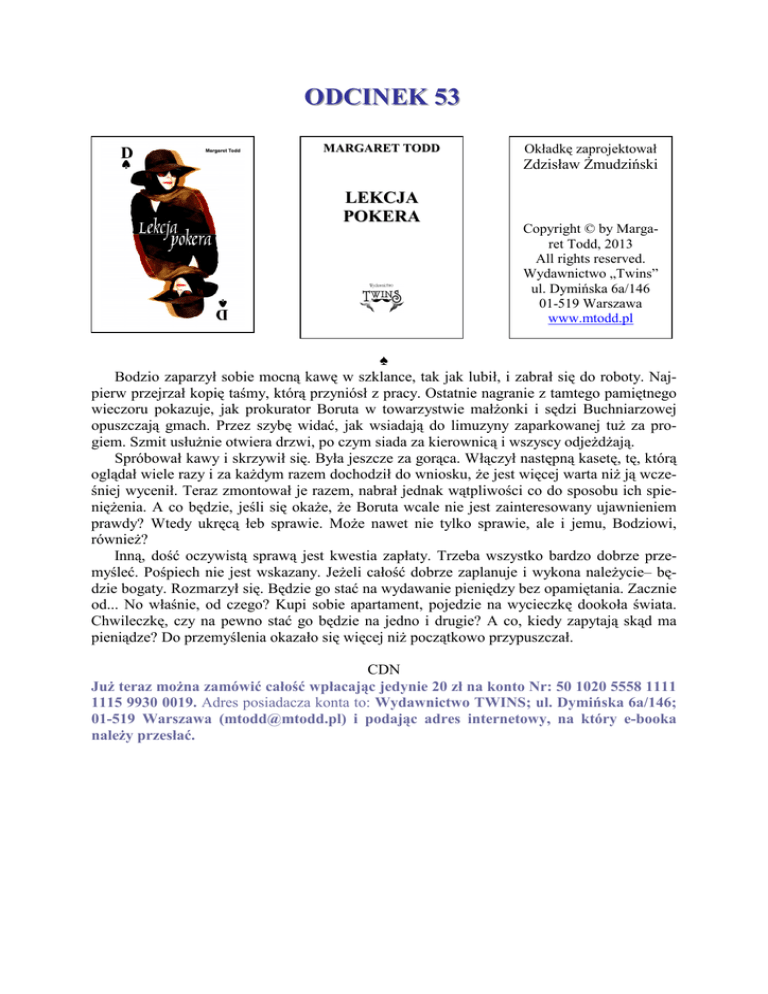 ODCINEK 53 MARGARET TODD Okładkę zaprojektował Zdzisław Żmudziński LEKCJA POKERA Copyright © by Margaret Todd, 2013 All rights reserved. Wydawnictwo „Twins” ul. Dymińska 6a/146 01-519 Warszawa www.mtodd.pl ♠ Bodzio zaparzył sobie mocną kawę w szklance, tak jak lubił, i zabrał się do roboty. Najpierw przejrzał kopię taśmy, którą przyniósł z pracy. Ostatnie nagranie z tamtego pamiętnego wieczoru pokazuje, jak prokurator Boruta w towarzystwie małżonki i sędzi Buchniarzowej opuszczają gmach. Przez szybę widać, jak wsiadają do limuzyny zaparkowanej tuż za progiem. Szmit usłużnie otwiera drzwi, po czym siada za kierownicą i wszyscy odjeżdżają. Spróbował kawy i skrzywił się. Była jeszcze za gorąca. Włączył następną kasetę, tę, którą oglądał wiele razy i za każdym razem dochodził do wniosku, że jest więcej warta niż ją wcześniej wycenił. Teraz zmontował je razem, nabrał jednak wątpliwości co do sposobu ich spieniężenia. A co będzie, jeśli się okaże, że Boruta wcale nie jest zainteresowany ujawnieniem prawdy? Wtedy ukręcą łeb sprawie. Może nawet nie tylko sprawie, ale i jemu, Bodziowi, również? Inną, dość oczywistą sprawą jest kwestia zapłaty. Trzeba wszystko bardzo dobrze przemyśleć. Pośpiech nie jest wskazany. Jeżeli całość dobrze zaplanuje i wykona należycie– będzie bogaty. Rozmarzył się. Będzie go stać na wydawanie pieniędzy bez opamiętania. Zacznie od... No właśnie, od czego? Kupi sobie apartament, pojedzie na wycieczkę dookoła świata. Chwileczkę, czy na pewno stać go będzie na jedno i drugie? A co, kiedy zapytają skąd ma pieniądze? Do przemyślenia okazało się więcej niż początkowo przypuszczał. CDN Już teraz można zamówić całość wpłacając jedynie 20 zł na konto Nr: 50 1020 5558 1111 1115 9930 0019. Adres posiadacza konta to: Wydawnictwo TWINS; ul. Dymińska 6a/146; 01-519 Warszawa ([email protected]) i podając adres internetowy, na który e-booka należy przesłać.