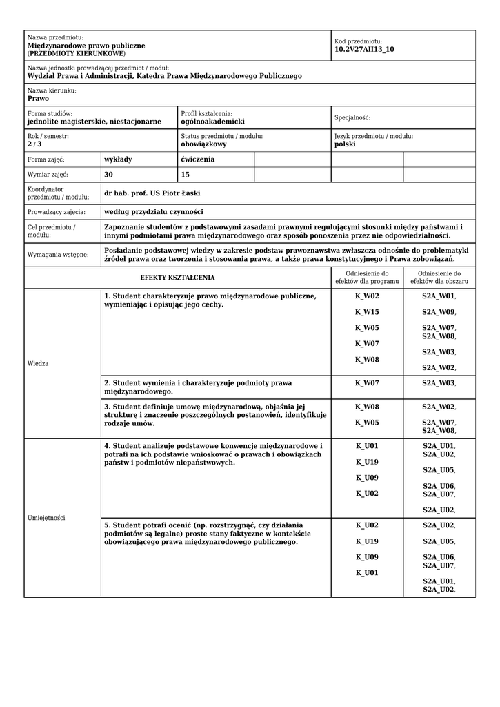Nazwa przedmiotu: Kod przedmiotu: Międzynarodowe prawo publiczne 10.2V27AII13_10 (PRZEDMIOTY KIERUNKOWE) Nazwa jednostki prowadzącej przedmiot / moduł: Wydział Prawa i Administracji, Katedra Prawa Międzynarodowego Publicznego Nazwa kierunku: Prawo Forma studiów: Profil kształcenia: jednolite magisterskie, niestacjonarne ogólnoakademicki Rok / semestr: 2/3 Status przedmiotu / modułu: Język przedmiotu / modułu: obowiązkowy polski Specjalność: Forma zajęć: wykłady ćwiczenia Wymiar zajęć: 30 15 Koordynator przedmiotu / modułu: dr hab. prof. US Piotr Łaski Prowadzący zajęcia: według przydziału czynności Cel przedmiotu / modułu: Zapoznanie studentów z podstawowymi zasadami prawnymi regulującymi stosunki między państwami i innymi podmiotami prawa międzynarodowego oraz sposób ponoszenia przez nie odpowiedzialności. Wymagania wstępne: Posiadanie podstawowej wiedzy w zakresie podstaw prawoznawstwa zwłaszcza odnośnie do problematyki źródeł prawa oraz tworzenia i stosowania prawa, a także prawa konstytucyjnego i Prawa zobowiązań. EFEKTY KSZTAŁCENIA 1. Student charakteryzuje prawo międzynarodowe publiczne, wymieniając i opisując jego cechy. Odniesienie do efektów dla programu Odniesienie do efektów dla obszaru K_W02 S2A_W01, K_W15 S2A_W09, K_W05 S2A_W07, S2A_W08, K_W07 K_W08 Wiedza S2A_W02, 2. Student wymienia i charakteryzuje podmioty prawa międzynarodowego. K_W07 S2A_W03, 3. Student definiuje umowę międzynarodową, objaśnia jej strukturę i znaczenie poszczególnych postanowień, identyfikuje rodzaje umów. K_W08 S2A_W02, K_W05 S2A_W07, S2A_W08, 4. Student analizuje podstawowe konwencje międzynarodowe i potrafi na ich podstawie wnioskować o prawach i obowiązkach państw i podmiotów niepaństwowych. K_U01 S2A_U01, S2A_U02, K_U19 K_U09 K_U02 Umiejętności S2A_W03, S2A_U05, S2A_U06, S2A_U07, S2A_U02, 5. Student potrafi ocenić (np. rozstrzygnąć, czy działania podmiotów są legalne) proste stany faktyczne w kontekście obowiązującego prawa międzynarodowego publicznego. K_U02 S2A_U02, K_U19 S2A_U05, K_U09 S2A_U06, S2A_U07, K_U01 S2A_U01, S2A_U02, Kompetencje społeczne 6. Student zachowuje krytyczny stosunek do prezentowanych w literaturze przedmiotu poglądów. K_K03 S2A_K06, 7. Student pracuje w zespole w trakcie ćwiczeń nad rozstrzygnięciem prostych stanów faktycznych w oparciu o obowiązujące normy prawa międzynarodowego. K_K06 S2A_K03, S2A_K05, S2A_K07, K_K05 S2A_K04, 8. Student dyskutuje na ćwiczeniach, prezentuje i uzasadnia swoje poglądy na temat relacji prawno międzynarodowych i poszczególnych regulacji prawnych. K_K07 S2A_K02, S2A_K05, TREŚCI PROGRAMOWE Liczba godzin Forma zajęć: wykłady 1. Prawo międzynarodowe – definicja i zagadnienia wprowadzające Cechy charakterystyczne prawa międzynarodowego publicznego. Charakterystyka międzynarodowego sądownictwa. 6 2. Źródła prawa międzynarodowego publicznego: - zwyczaj, - umowy międzynarodowe, - uchwały organizacji międzynarodowych, - ogólne zasady prawa. Środki pomocnicze do ustalenia źródeł prawa międzynarodowego: doktryna, - judykatura 6 3. Problematyka podmiotowości w prawie międzynarodowym. Klasyfikacja podmiotów prawa międzynarodowego. Katalog podmiotów w prawie międzynarodowym publicznym: - państwa, - organizacje międzynarodowe, - Stolica Apostolska, - Zakon Kawalerów Maltańskich, - powstańcy i strony wojujące, - osoby fizyczne i prawne. 6 4. Prawo traktatowe: - zagadnienia wprowadzające, - etapy zawiewania umowy międzynarodowej, - nieważność a wygaśnięcie umowy międzynarodowej, - interpretacja umów międzynarodowych. 6 5. Międzynarodowy system ochrony praw człowieka: - uniwersalny system ochrony praw człowieka - europejski system ochrony praw człowieka (Rada Europy, Unia Europejska, OBWE), - pozaeuropejskie systemy ochrony praw człowieka. 6 Forma zajęć: ćwiczenia 1. Źródła prawa międzynarodowego – szybkie powstawanie zwyczaju, zwyczaj lokalny. 3 2. Prawo traktatowe – budowa umowy międzynarodowej 3 3. Postępowanie przed sądami międzynarodowymi wraz z przykładami orzecznictwa. 3 4. Podmioty prawa międzynarodowego publicznego (państwo unitarne, federalne, konfederacja, organizacje międzynarodowe). 3 5. Międzynarodowy system ochrony praw człowieka – wybrane stany faktyczne. 3 Metody kształcenia Wykład -syntetyczna prezentacja zagadnień teoretycznych, prezentacje multimedialne. Ćwiczenia - analiza tekstów prawnych, praca w grupach, rozwiązywanie kazusów, burza mózgów, dyskusja. Nr efektu kształcenia z sylabusa Metody weryfikacji efektów kształcenia Forma i warunki zaliczenia * egzamin pisemny 1,2,3,4,5, * kolokwium 1,3, * projekt 6,7,8, * praca pisemna/esej/recenzja 4,5, Ćwiczenia: ocena końcowa stanowi sumę ocen z pracy pisemnej i kolokwium. Wykład -egzamin pisemny w formie testu wielokrotnego wyboru składającego się z 15 pytań testowych. 15-14 -bdb, 13 -db+ 12-11-db, 10 - dst+, 9-8 -dst, 7 i mniej-ndst. Ocena końcowa stanowi 100 % oceny z egzaminu pisemnego. Literatura podstawowa Antonowicz L. (2011): Podręcznik prawa międzynarodowego. LexisNexis Cała-Wacinkiewicz E. (2012): Podstawy systemu prawa międzynarodowego, wyd.3. C.H. Beck, Warszawa Shaw M.N. (2011): Prawo międzynarodowe. Książka i Wiedza, Warszawa Literatura uzupełniająca Łaski P., Gawłowicz I., Cała E. (2001): Wybór dokumentów do nauki prawa międzynarodowego. Wydaw.US, Szczecin Symonides J. (red.) (2006): Organizacja Narodów Zjednoczonych, bilans i perspektywy. Scholar, Warszawa Menkes J. (red.) (2008): Wybór kazusów z prawa międzynarodowego. Zagadnienia ogólne, zeszyt 1. Oficyna Wydawnicza Wyższej Szkoły Handlu i Prawa im. Ryszarda Łazarskiego, Warszawa Sozański J. (2008): Prawo traktatów – zarys współczesny. Polskie Wydawnictwo Prawnicze Iuris, Poznań-Warszawa Mielnik B. (2008): Kształtowanie się pozapaństwowej podmiotowości w prawie międzynarodowym. Wydawnictwo Uniwersytetu Wrocła