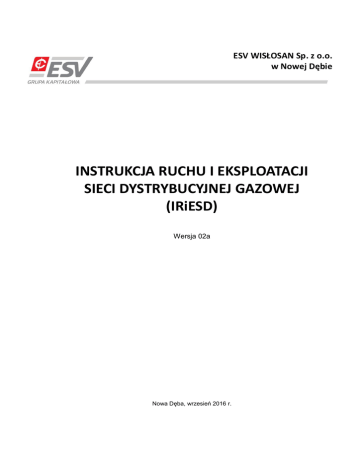 ESV WISŁOSAN Sp. z o.o. w Nowej Dębie INSTRUKCJA RUCHU I EKSPLOATACJI SIECI DYSTRYBUCYJNEJ GAZOWEJ (IRiESD) Wersja 02a Nowa Dęba, wrzesień 2016 r. Wersja 02 Instrukcja Ruchu i Eksploatacji Sieci Dystrybucyjnej Strona 2 Spis treści: CZĘŚĆ I: POSTANOWIENIA OGÓLNE ................................................................ 3 1. 2. 3. 4. 5. DEFINICJE I JEDNOSTKI ...............................................................................4 PODSTAWY PRAWNE I WARUNKI OBOWIĄZYWANIA IRiESD .................14 DOKUMENTY POWIĄZANE ..........................................................................14 INFORMACJE DODATKOWE .......................................................................15 PROCEDURY WPROWADZENIA I AKTUALIZACJI IRiESD ........................15 CZĘŚĆ II: OGÓLNE WARUNKI KORZYSTANIA Z SYSTEMU DYSTRYBUCYJNEGO .. 17 6. 7. 8. 9. 10. 11. 12. 13. 14. 15. 16. 17. SYSTEM DYSTRYBUCYJNY ........................................................................18 WSPÓŁPRACA OSD Z OPERATORAMI SYSTEMÓW GAZOWYCH ...........22 PRAWA I OBOWIĄZKI ODBIORCÓW ...........................................................22 PLANOWANIE ROZWOJU SYSTEMU DYSTRYBUCYJNEGO ....................25 PRZYŁĄCZANIE DO SIECI DYSTRYBUCYJNEJ .........................................25 UMOWA DYSTRYBUCYJNA .........................................................................31 WARUNKI ŚWIADCZENIA USŁUG DYSTRYBUCJI .....................................36 PROCEDURA ZGŁASZANIA UMÓW DO REALIZACJI.................................40 ZASADY SKŁADANIA ZBIORCZEGO ZGŁOSZENIA ZAPOTRZEBOWANIA ...................................................................................44 PROCEDURA ZMIANY SPRZEDAWCY .......................................................46 PRACE W SYSTEMIE DYSTRYBUCYJNYM ................................................50 WYMIANA INFORMACJI POMIĘDZY STRONAMI UMOWY DYSTRYBUCYJNEJ ......................................................................................50 CZĘŚĆ III: BILANSOWANIE SYSTEMU I ZARZĄDZANIE OGRANICZENIAMI SYSTEMOWYMI .......................................................................................... 54 18. 19. 20. 21. 22. 23. 24. 25. 26. 27. 28. WYMAGANIA DOTYCZĄCE UKŁADÓW POMIAROWOROZLICZENIOWYCH, SYSTEMÓW TELEMETRYCZNYCH ORAZ ZASADY DOKONYWANIA POMIARÓW. ...........................................55 ZASADY WYKONYWANIA ODCZYTÓW UKŁADÓW POMIAROWYCH I PRZEKAZYWANIA DANYCH POMIAROWYCH I ROZLICZENIOWYCH ....58 ZASADY OKREŚLANIA ILOŚCI PALIWA GAZOWEGO ...............................61 SZACOWANIE ILOŚCI PALIWA GAZOWEGO W PUNKTACH WYJŚCIA ...62 ALOKACJE ILOŚCI PALIWA GAZOWEGO W PUNKTACH WEJŚCIA I WYJŚCIA .....................................................................................................63 ZGŁASZANIE PZD DO REALIZACJI .............................................................65 BILANSOWANIE SYSTEMU DYSTRYBUCYJNEGO ....................................67 ZARZĄDZANIE OGRANICZENIAMI W SYSTEMIE DYSTRYBUCYJNYM ...69 WARUNKI ROZLICZANIA USŁUG DYSTRYBUCJI ......................................72 FAKTUROWANIE I PŁATNOŚCI ...................................................................73 SPOSOBY POSTĘPOWANIA W SYTUACJACH AWARYJNYCH ................73 ESV Wisłosan Sp. z o.o. Wersja 02 Instrukcja Ruchu i Eksploatacji Sieci Dystrybucyjnej CZĘŚĆ I: POSTANOWIENIA OGÓLNE ESV Wisłosan Sp. z o.o. Strona 3 Wersja 02 Instrukcja Ruchu i Eksploatacji Sieci Dystrybucyjnej Strona 4 1. DEFINICJE I JEDNOSTKI 1.1 Niniejsza Instrukcja Ruchu i Eksploatacji Sieci Dystrybucyjnej (IRiESD) reguluje warunki świadczenia usług Dystrybucji w Systemie dystrybucyjnym ESV Wisłosan sp. z o.o. wyznaczonej decyzją Prezesa Urzędu Regulacji Energetyki na Operatora Systemu Dystrybucyjnego (OSD). 1.2 Definicje. Alokacja Przypisanie poszczególnym ZUP ilości gazowego przekazanego do przesłania w wejścia lub odbieranego w punkcie wyjścia. Alokacja operatywna Określenie szacunkowych ilości Paliwa gazowego dostarczonego do Punktu wejścia do Obszaru dystrybucyjnego E (PWEOSP) lub odebranego w Punkcie wyjścia z Obszaru dystrybucyjnego E (PWYOSP), w poprzedniej Dobie gazowej. Alokacja rozliczeniowa Określenie ilości Paliwa gazowego dostarczonego do Punktu wejścia do Obszaru dystrybucyjnego (PWEOSP) lub odebranego w Punkcie wyjścia z Obszaru dystrybucyjnego (PWYOSP), w poszczególnych Dobach gazowych zakończonego Miesiąca gazowego. Bilansowanie Bilansowanie fizyczne i handlowe prowadzone przez OSD. Bilansowanie fizyczne Działalność OSD mająca na celu zrównoważenie ilości paliwa gazowego dostarczanego i odbieranego z systemu dystrybucyjnego. Bilansowanie handlowe Działalność OSD polegająca na określaniu i rozliczaniu wielkości niezbilansowania wynikającego z różnicy pomiędzy ilościami paliwa gazowego, dostarczonego i odebranego z systemu dystrybucyjnego przez ZUP. Cena referencyjna gazu (CRG) Cena stanowiąca średnioważoną cenę zakupu paliwa gazowego przez OSD w miesiącu gazowym poprzedzającym miesiąc, w którym CRG będzie opublikowana. Cena ta będzie miała zastosowanie w miesiącu następującym po miesiącu, w którym została opublikowana. CRG ustalana jest dla ilości wyrażonej w kWh. OSD publikuje CRG na swojej stronie internetowej w miesiącu poprzedzającym miesiąc, w którym cena ta będzie miała zastosowanie. ESV Wisłosan Sp. z o.o. paliwa punkcie Wersja 02 Instrukcja Ruchu i Eksploatacji Sieci Dystrybucyjnej Strona 5 Ciepło spalania Ilość energii, która zostałaby wydzielona w postaci ciepła w wyniku całkowitego i zupełnego spalania w powietrzu 1 m3 paliwa gazowego w warunkach normalnych, gdyby reakcja zachodziła pod stałym ciśnieniem absolutnym 101,325 kPa, a wszystkie, oprócz wody, produkty spalania były w stanie gazowym, para wodna utworzona w procesie spalania uległa kondensacji i wszystkie produkty spalania (zarówno produkty w stanie gazowym jak i woda w stanie ciekłym)