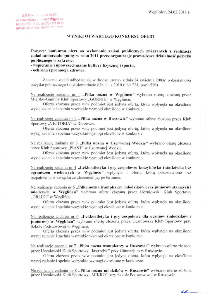 GMINA v, ^LINIEĆ Węgliniec, 24.02.20 1 1 r. ul. Sikorskiegre * tel. 075 / 771 14 3t>, iax 076 / 771 25 51 WYNIKI OTWARTEGO KONKURSU OFERT Dotyczy: konkursu ofert na wykonanie zadań publicznych związanych z realizacją zadań samorządu gminy w roku 2011 przez organizacje prowadzące działalność pożytku publicznego w zakresie: - wspieranie i upowszechnianie kultury fizycznej i sportu, - ochrona i promocja zdrowia. Zlecenie zadań odbędzie się \v drodze ustawy z dnia 24 kwietnia 2003r. o działalności pożytku publicznego i o wolontariacie (Dz. U. z 2010 r. Nr 234. póz. 1536). Na realizację zadania nr l „Piłka nożna w Węglińcu" wybrano ofertę złożoną przez Miejsko-Gminny Klub Sportowy ..GÓRNIK" w Węglińcu. Oferta złożona przez w/w podmiot jest jedyną ofertą, która wpłynęła na określone wyżej zadanie i spełnia wszystkie wymogi określone w konkursie. Na realizacje zadania nr 2 „Piłka nożna w Ruszowie" wybrano ofertę złożoną przez Klub Sportowy „YICTORIA" w Ruszowie. Oferta złożona przez w/w podmiot jest jedyna ofertą, która wpłynęła na określone wyżej zadanie i spełnia wrszystkie wymogi określone w konkursie. Na realizację zadania nr 3 „Piłka nożna w Czerwonej Wodzie" wybrano ofertę złożoną przez Klub Sportowy „PIAST" w Czerwonej Wodzie. Oferta złożona przez w/w podmiot jest jedyną ofertą, która wpłynęła na określone wyżej zadanie i spełnia wszystkie wymogi określone w konkursie. Na realizację zadania nr 4 „Lekkoatletyka i gry zespołowe: koszykówka i siatkówka bez ograniczeń wiekowych w Węglińcu" wpłynęła l oferta, którą pozostawiono bez rozpatrzenia w związku ze złożeniem jej po terminie. Na realizację zadania nr 5 „Piłka nożna trampkarzy, młodzików oraz juniorów starszych i młodszych w Węglińcu" wybrano ofertę złożoną przez Uczniowski Klub Sportowy „ORLIKI" w Węglińcu Oferta złożona przez w/w podmiot jest jedyną ofertą, która wpłynęła na określone wyżej zadanie i spełnia wszystkie wymogi określone w konkursie. Na realizacje zadania nr 6 „Lekkoatletyka i gry zespołowe dla uczniów (młodzików i juniorów) w Węglińcu" wybrano ofertę złożoną przez Uczniowski Klub Sportowy przy Szkole Podstawowej w Węglińcu. Oferta złożona przez w/w podmiot jest jedyną ofertą, która wpłynęła na określone wyżej zadanie i spełnia wszystkie wymogi określone w konkursie. Na realizację zadania nr 7 „Piłka nożna trampkarzy w Ruszowie" wybrano ofertę złożoną przez Uczniowski Klub Sportowy „Jastrzębie" przy Gimnazjum w Ruszowie. Oferta złożona przez w/w podmiot jest jedyną ofertą, która wpłynęła na określone wyżej zadanie i spełnia wszystkie wymogi określone w konkursie. Na realizacje zadania nr 8 „Piłka nożna młodzików w Ruszowie" wybrano ofertę złożona przez Uczniowski Klub Sportowy ..MIKRO" przy Szkole Podstawowej w Ruszowie. Oferta złożona przez w/w podmiot jest jedyną ofertą, która wpłynęła na określone wyżej zadanie i spełnia wszystkie wymogi określone w konkursie. Na realizację zadania nr 9 „Unihokej w Ruszowie" wybrano ofertę złożoną przez Uczniowski Klub Sportowy ..MIKRO" przy Szkole Podstawowej w Ruszowie. Oferta złożona przez w/w podmiot jest jedyną ofertą, która wpłynęła na określone wyżej zadanie i spełnia wszystkie wymogi określone w konkursie. Na realizację zadania nr 10 „Profilaktyka zdrowotna osób starszych w Weglińcu - nie złożono oferty. Na realizację zadania nr 11 „Profilaktyka zdrowotna osób starszych w Starym Weglińcu" — nie złożono oferty. BURMISTRZ aMIN tó/^ fr Anarzej Kutrowski